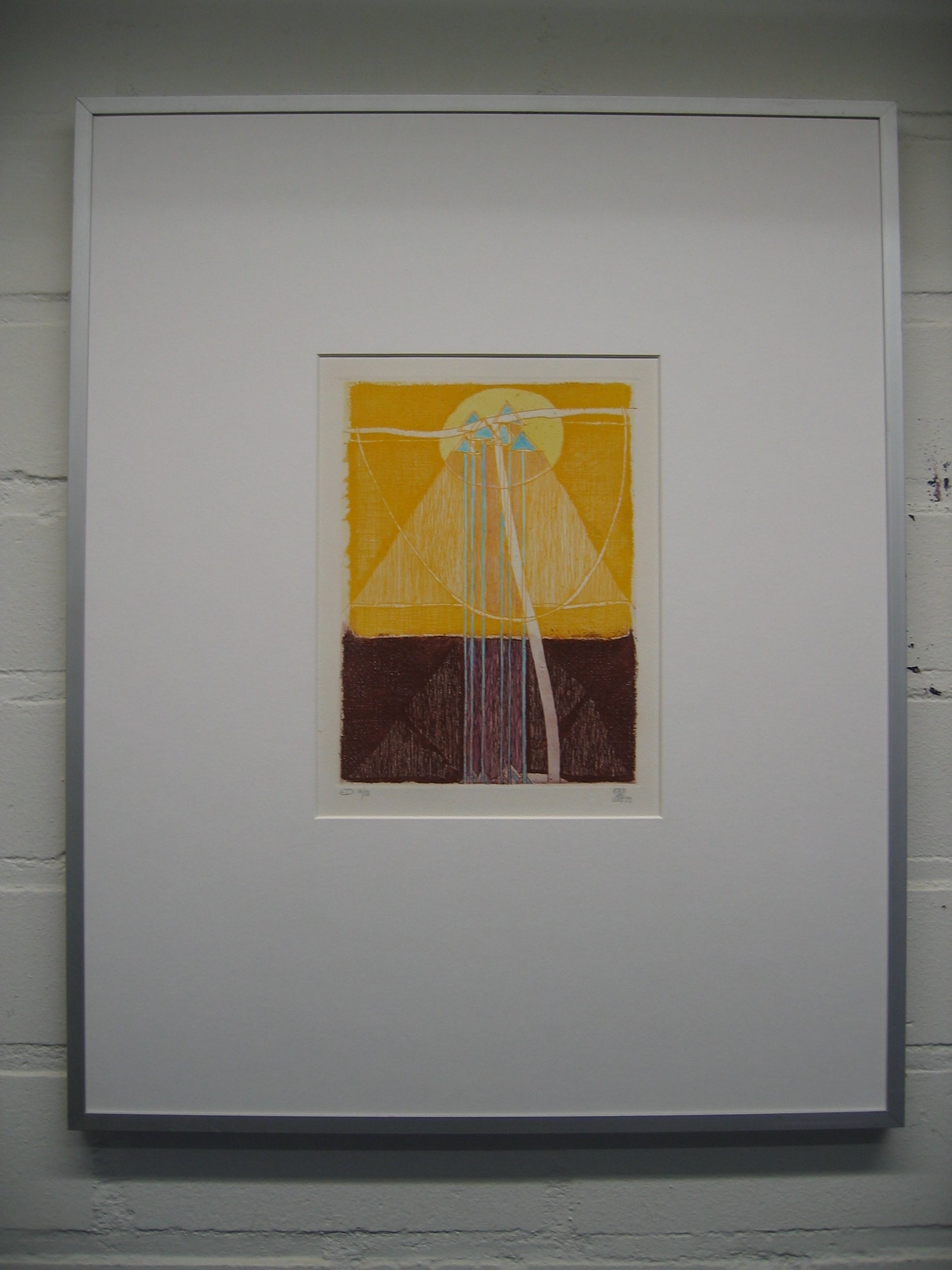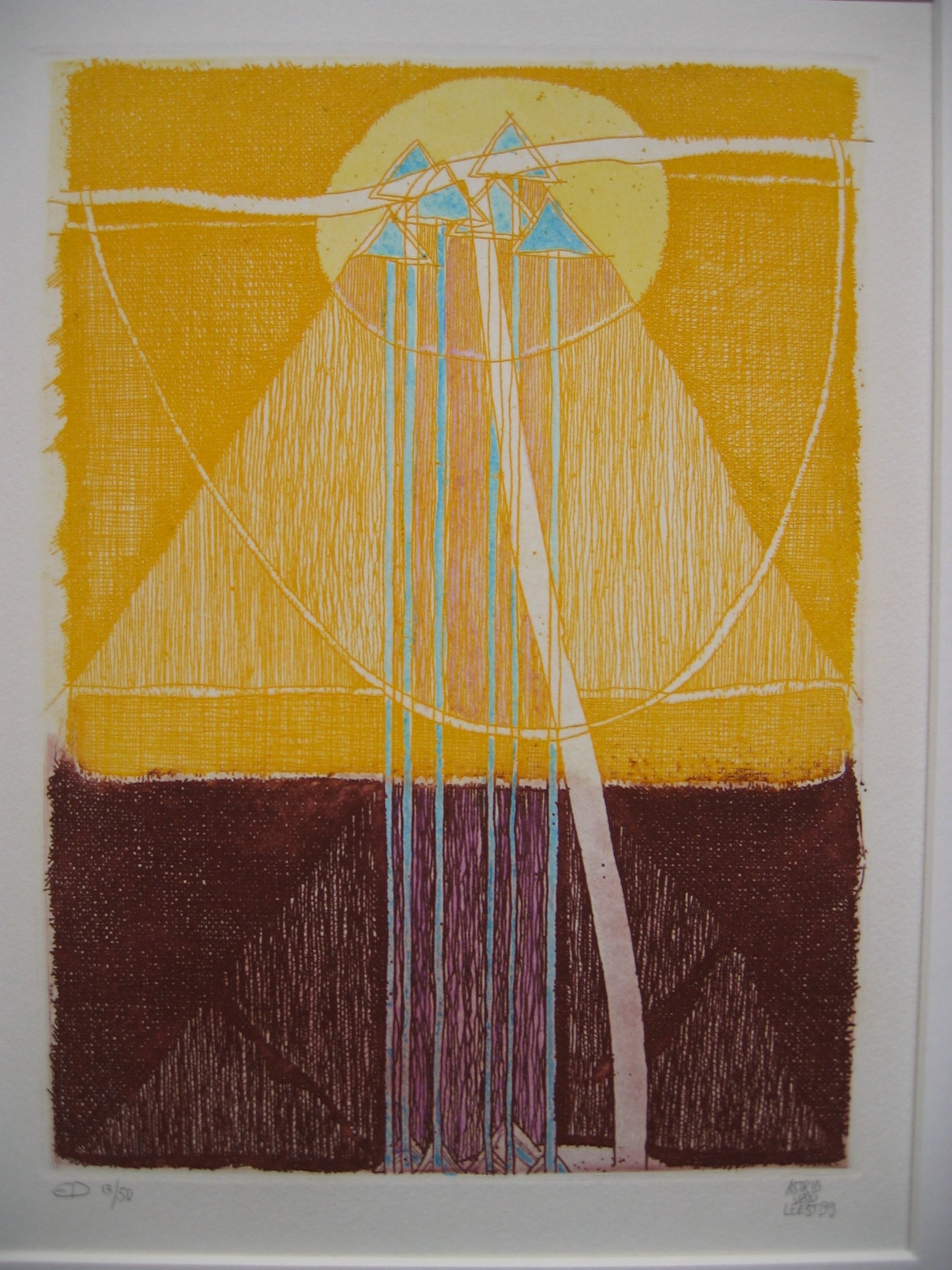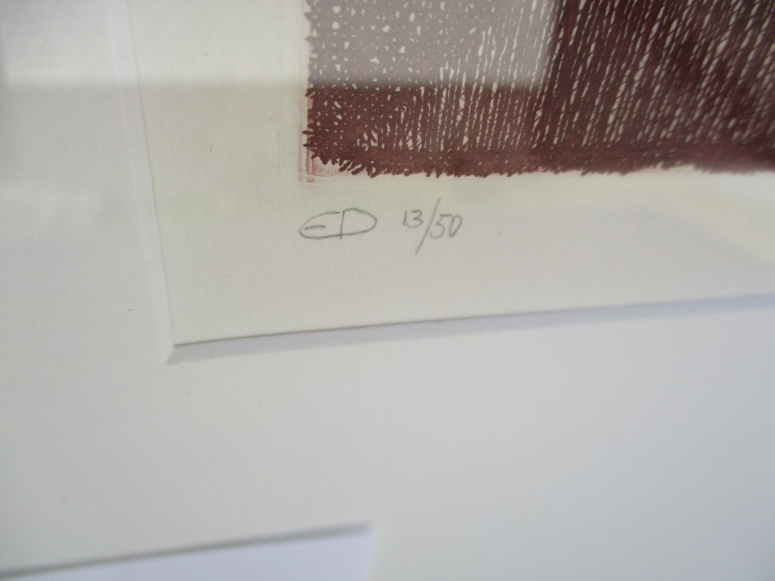 Deze kleuren ets is rechtsonder gesigneerd en gedateerd. Linksonder staat: ED 13/50. Het werk is ingelijst met passepartout in een aluminium wissellijst.