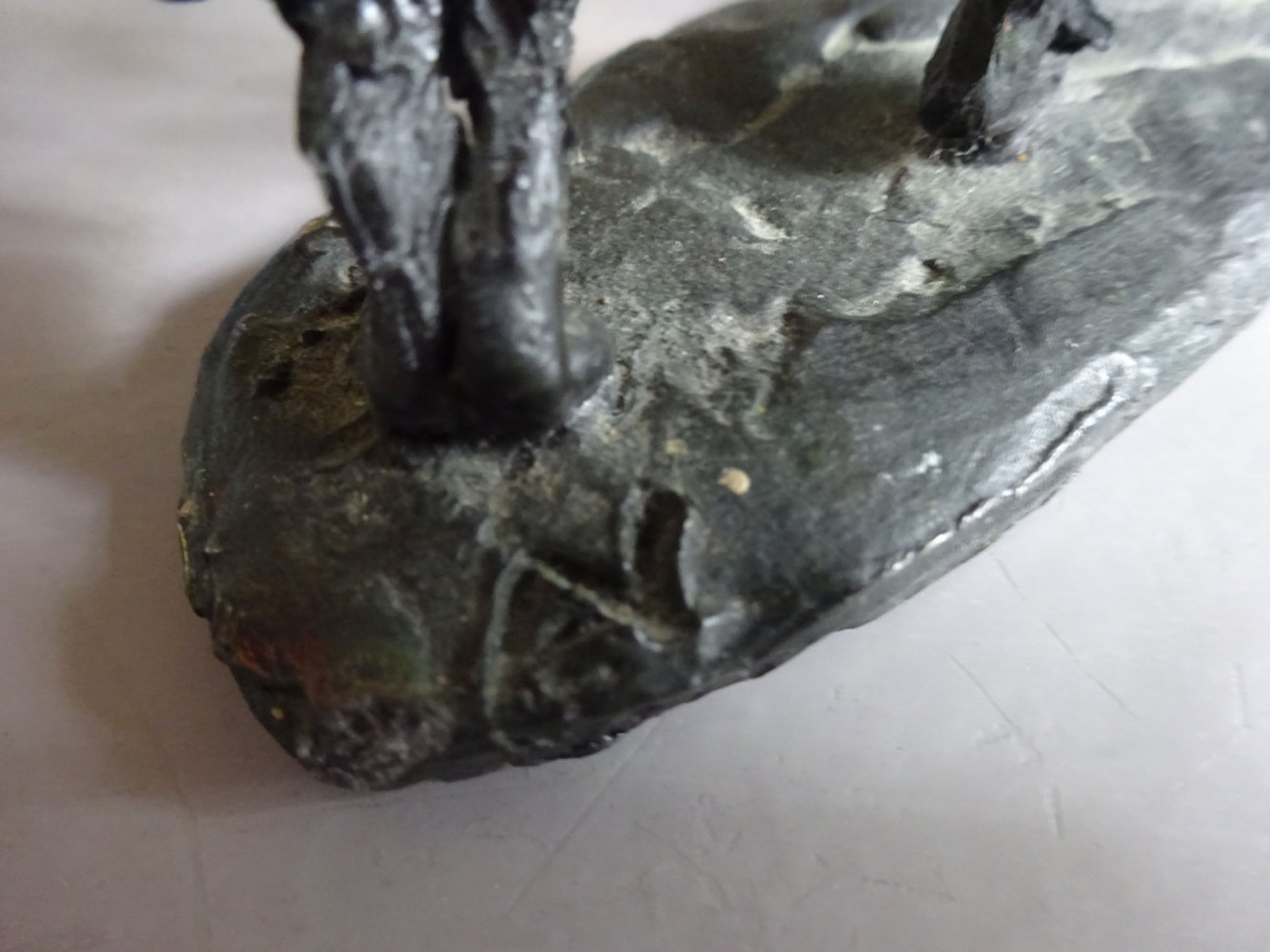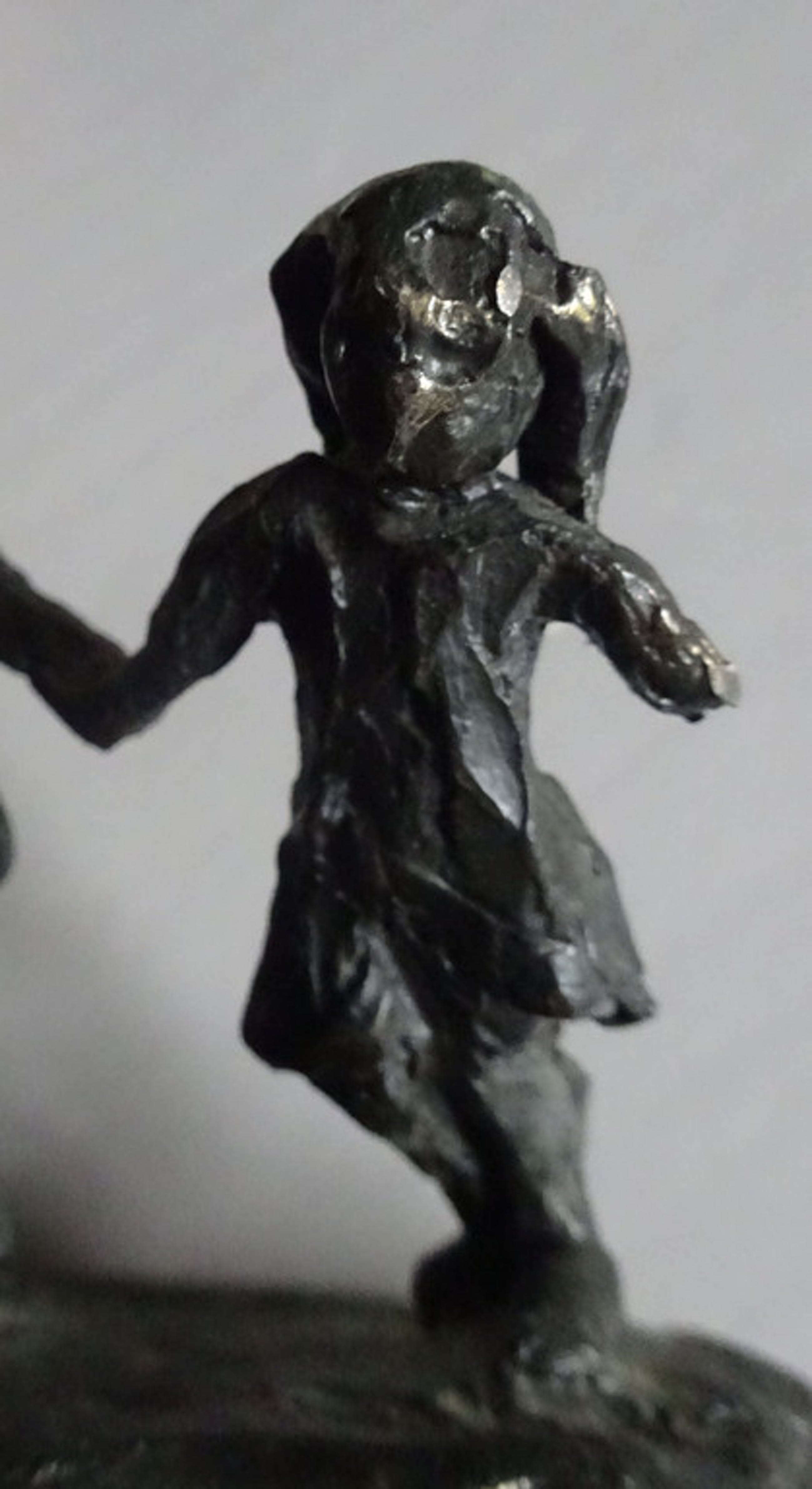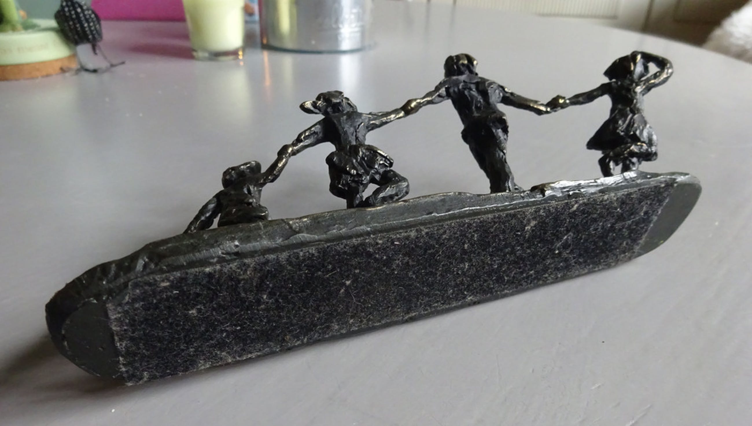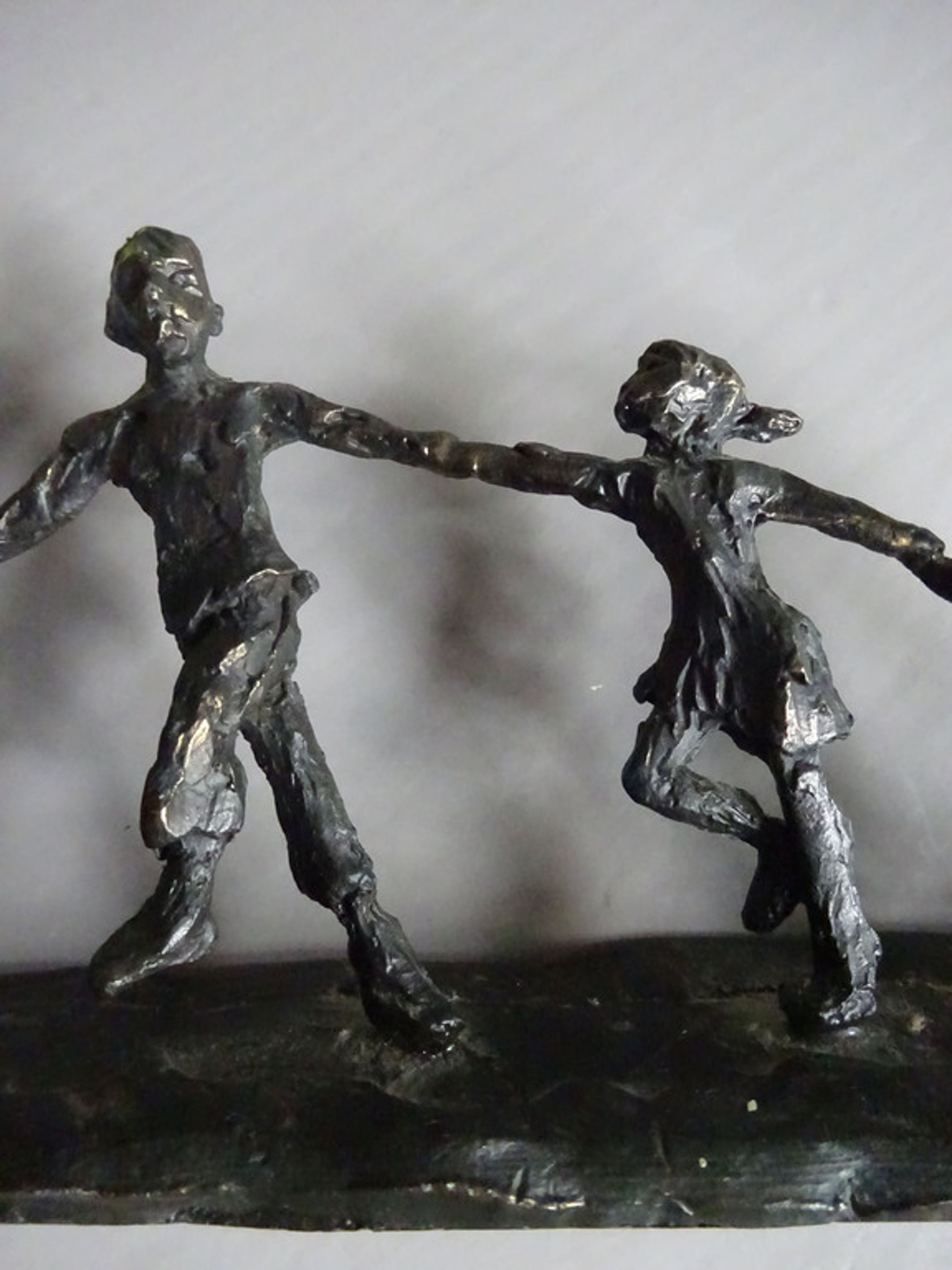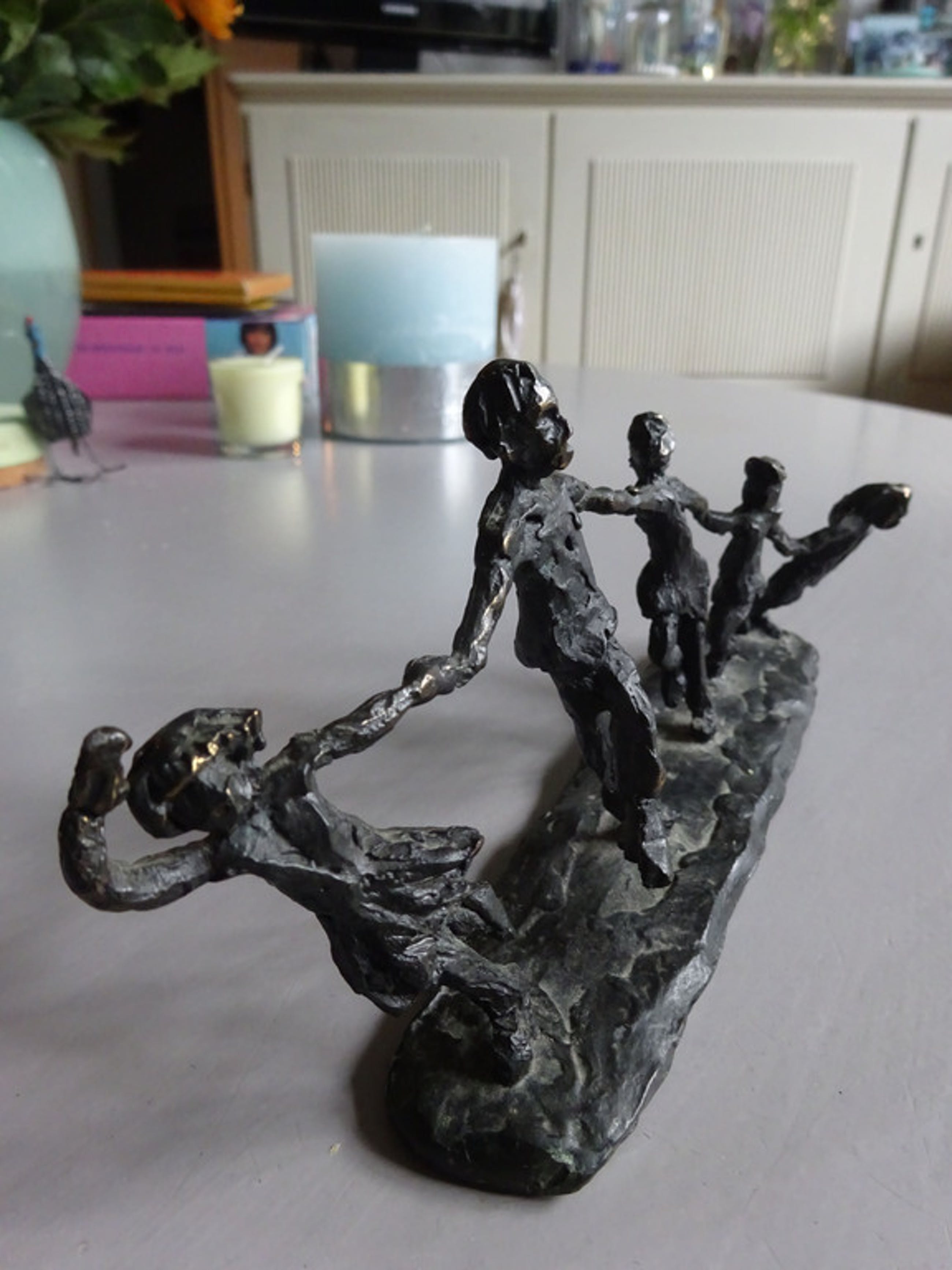 Bronzen beeldje van vijf spelende kinderen op een rij