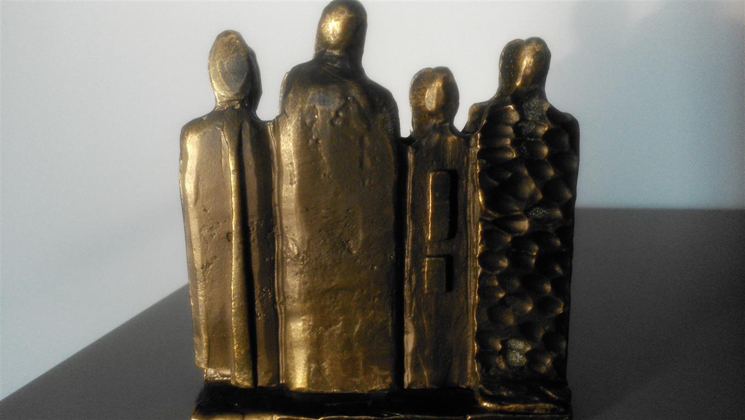 Een staander met silhouet van 4 personen en kleurige accenten met twee losse delen die daar aan beide zijden precies op passen Ook mogelijk om in de complete lengte neer te zetten
