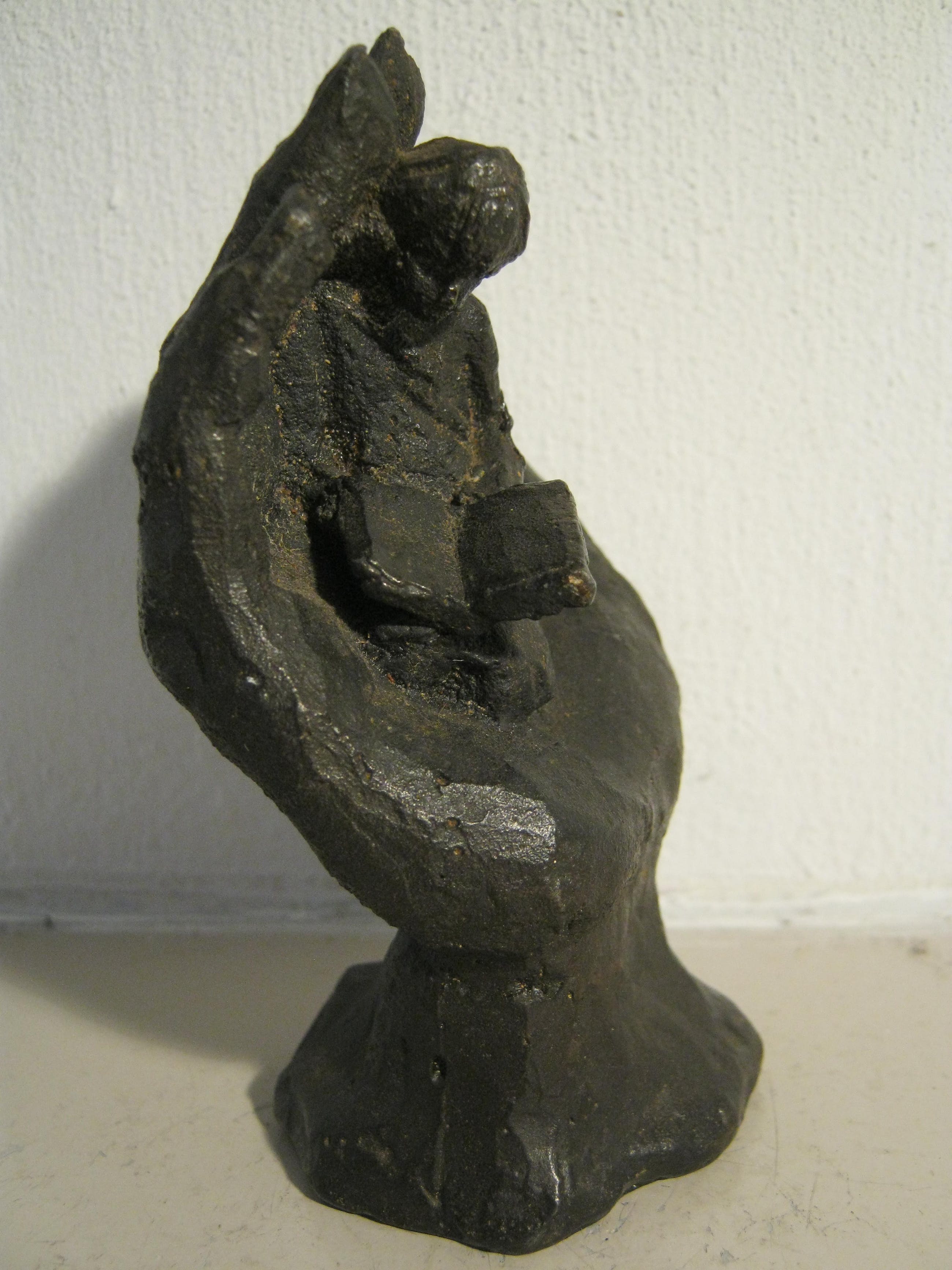 Aandoenlijk brons sculptuur van een lezend meisje geborgen zittend in een hand. Prachtig gedetailleerd vormgegeven zoals alle werken van de Nederlandse kunstenares Astrid Veldhuyen-Koppen. Gesigneerd.