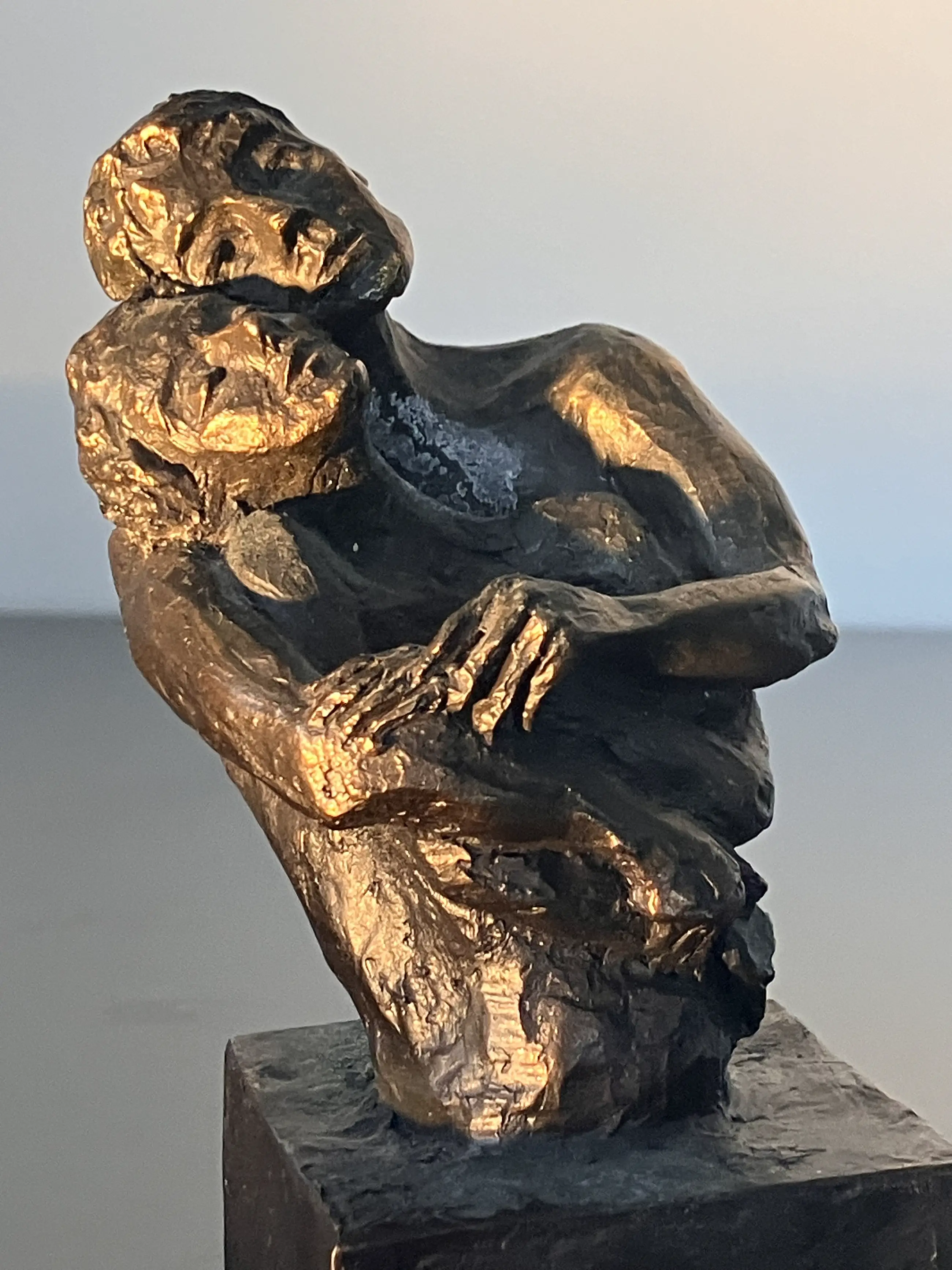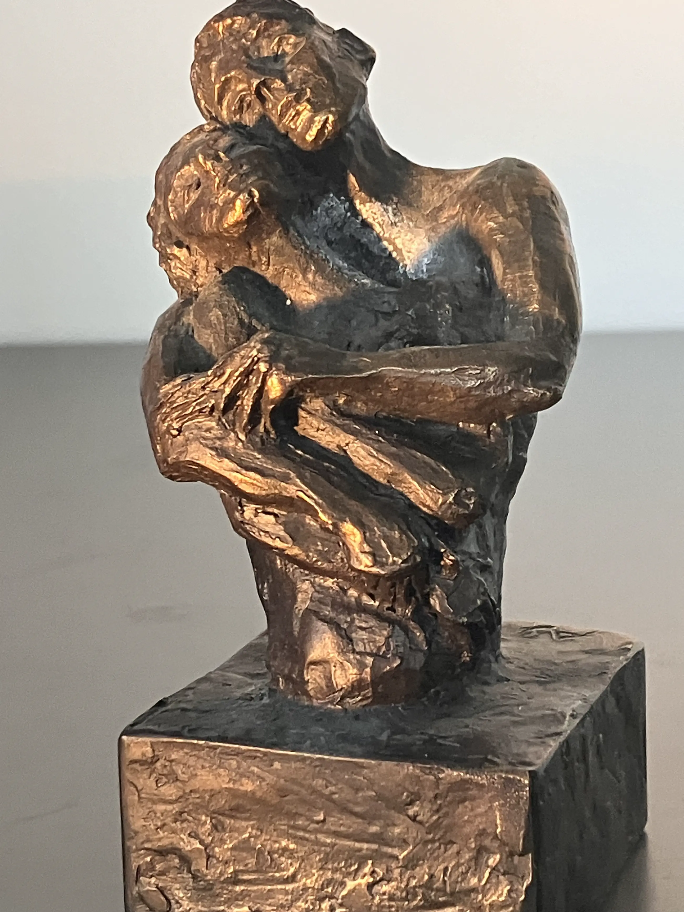 Massief bronzen beeldje van stel in volledig vertrouwde omarming Gesigneerd AV