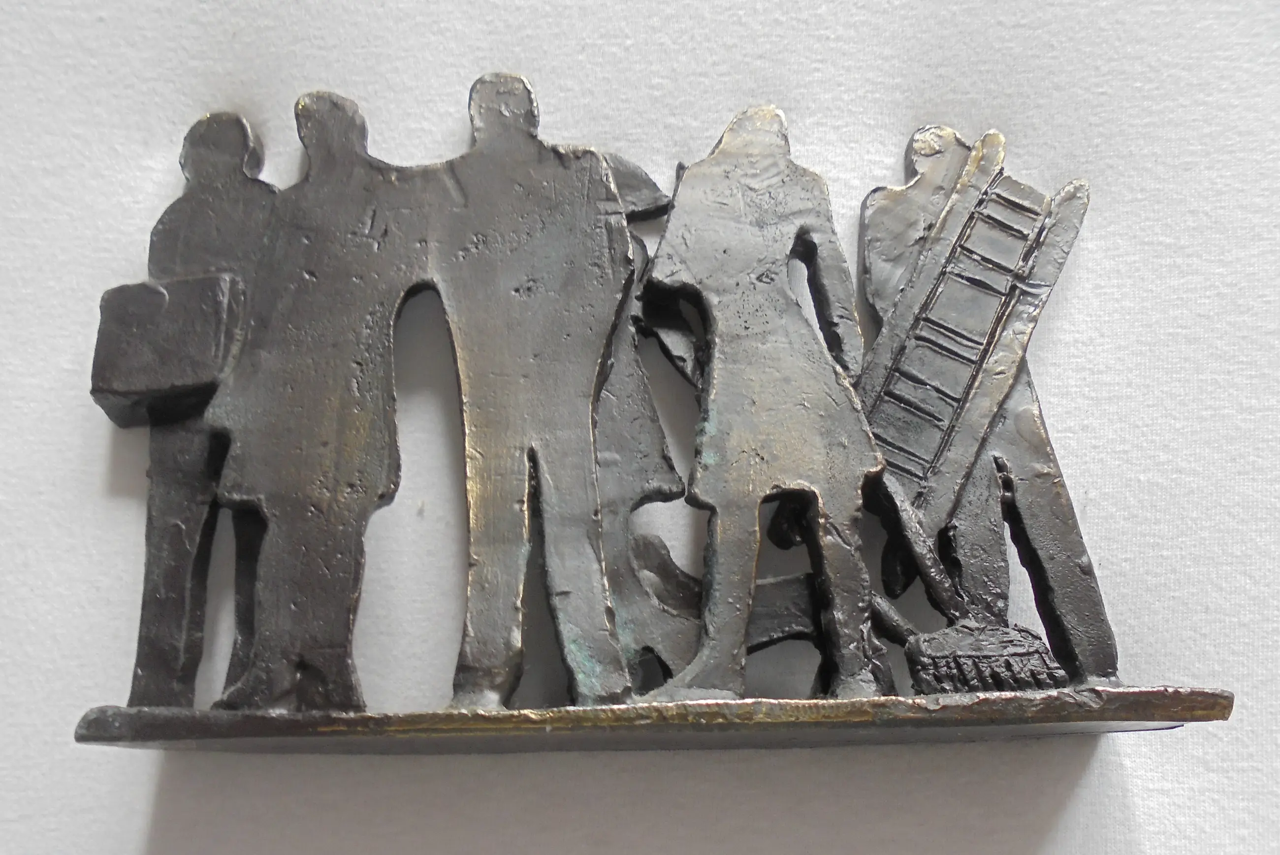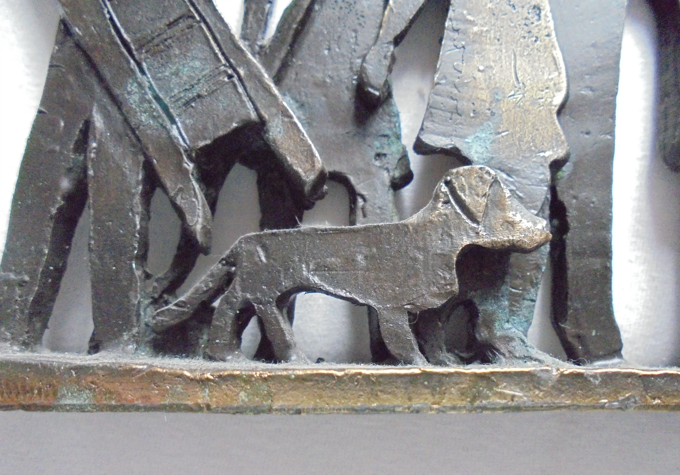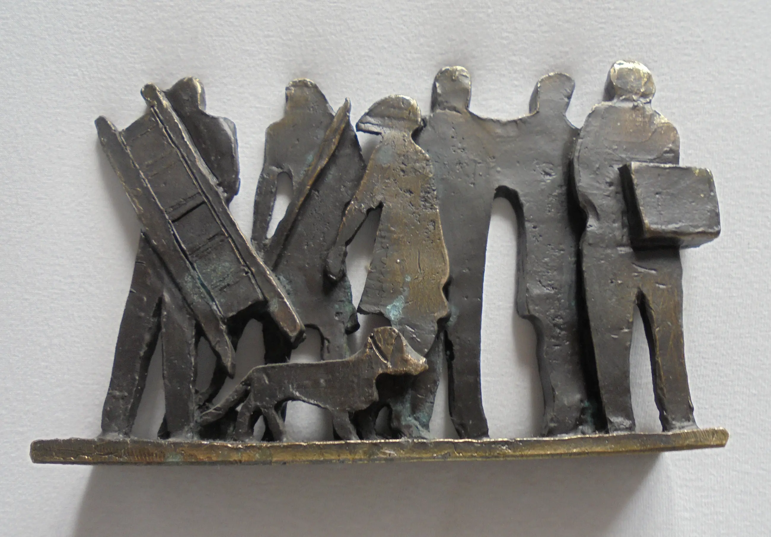 Prachtig, stilistisch sculptuur van een zestal mensfiguren en hond, ieder met hun eigen verhaal.