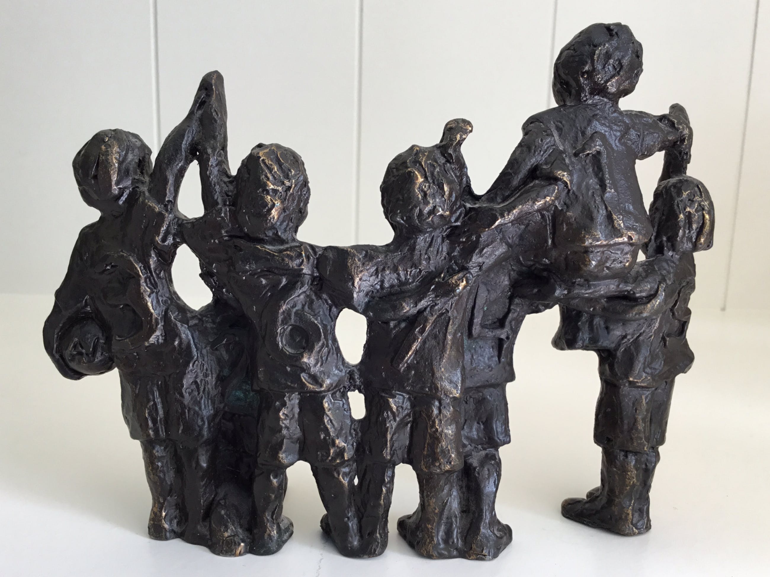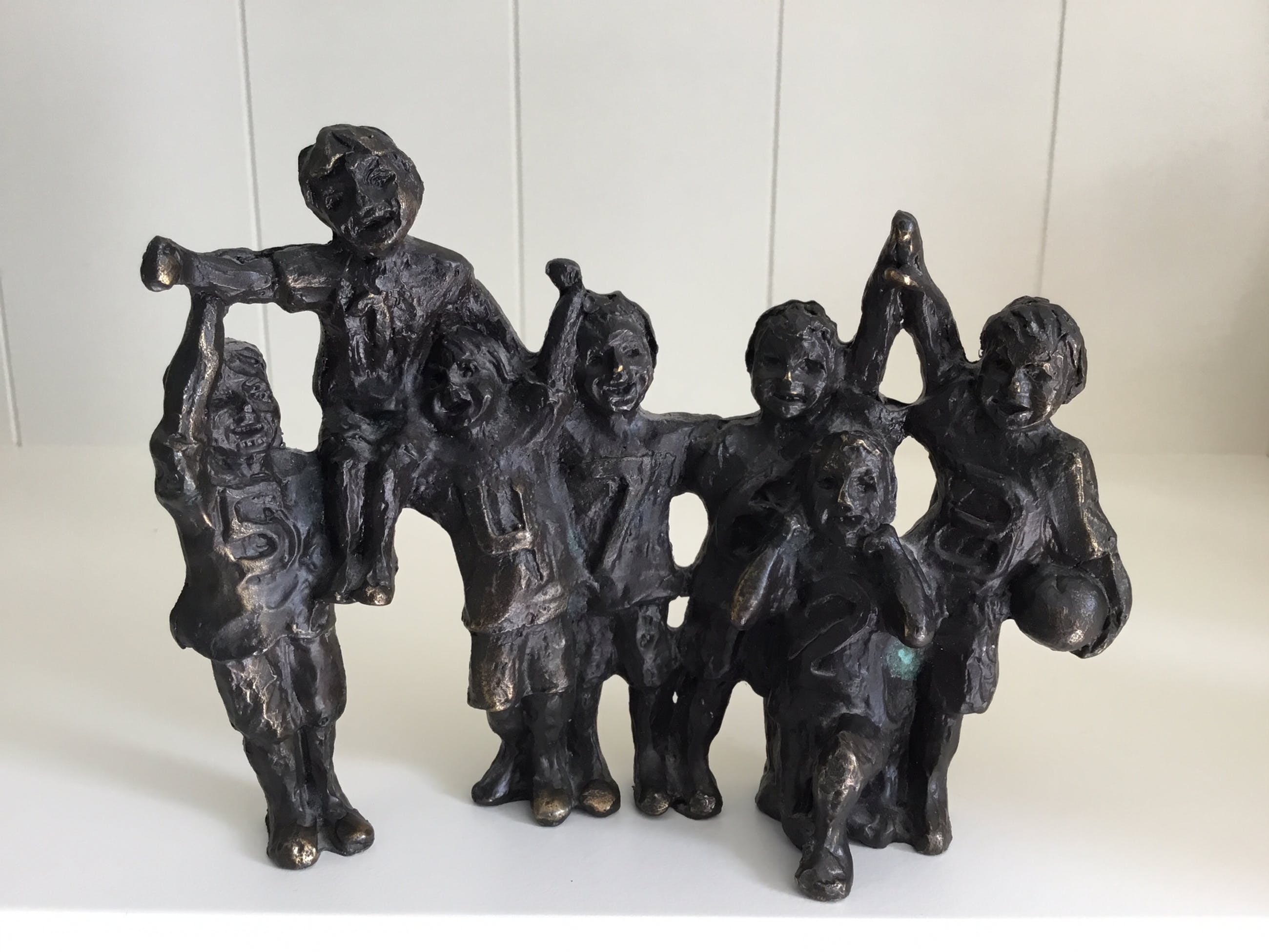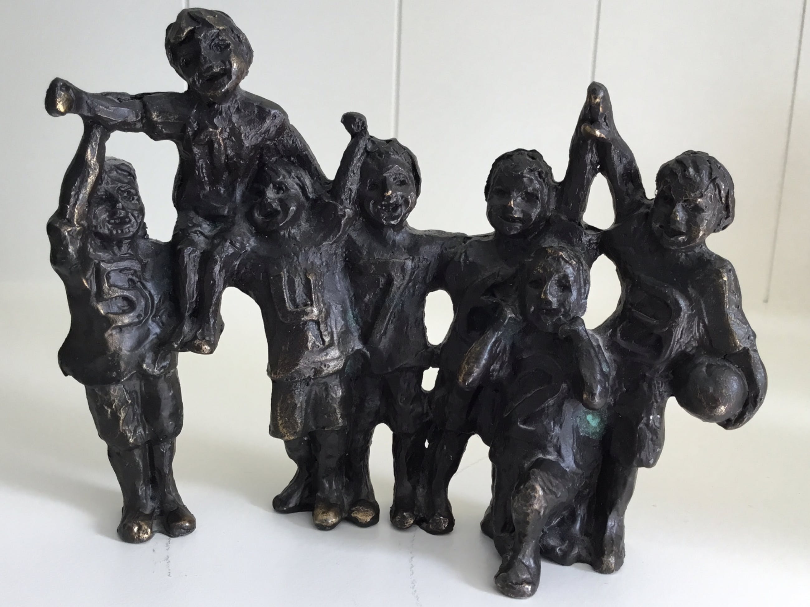 Zeer fraai sculptuur van zevental kinderen die uitbundig de overwinning vieren. Titel “ A winning team “ Kunstenares : Astrid Veldhuyzen Het beeld is gesigneerd: AV Materiaal: verbronsd metaal Het beeld verkeert in goede staat en wordt zorgvuldig verpakt en aangetekend verzonden.