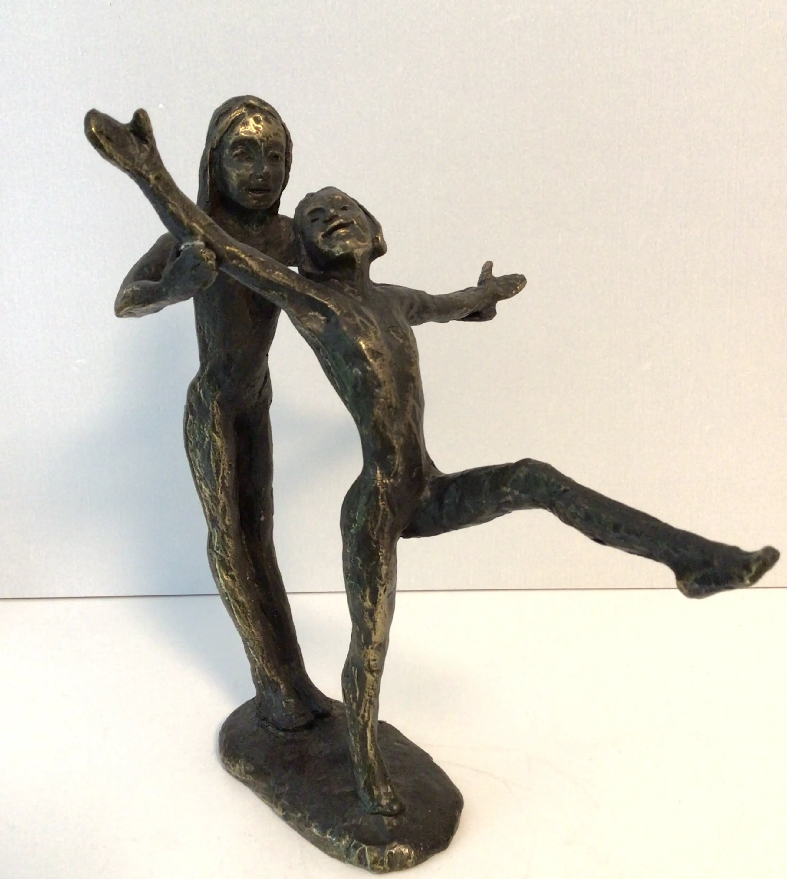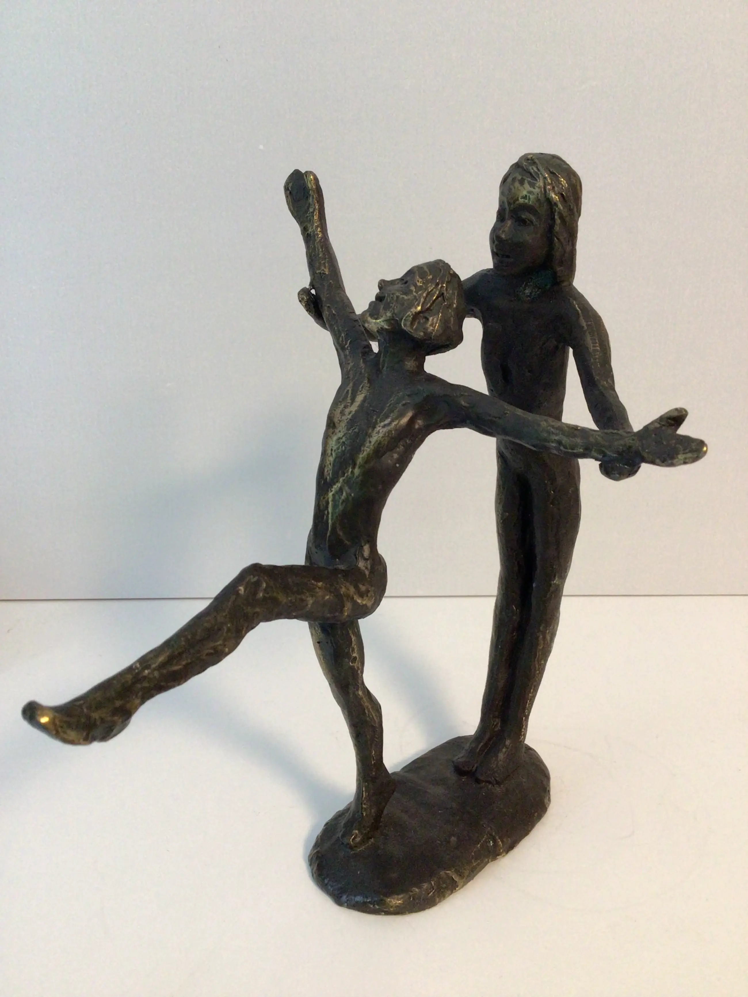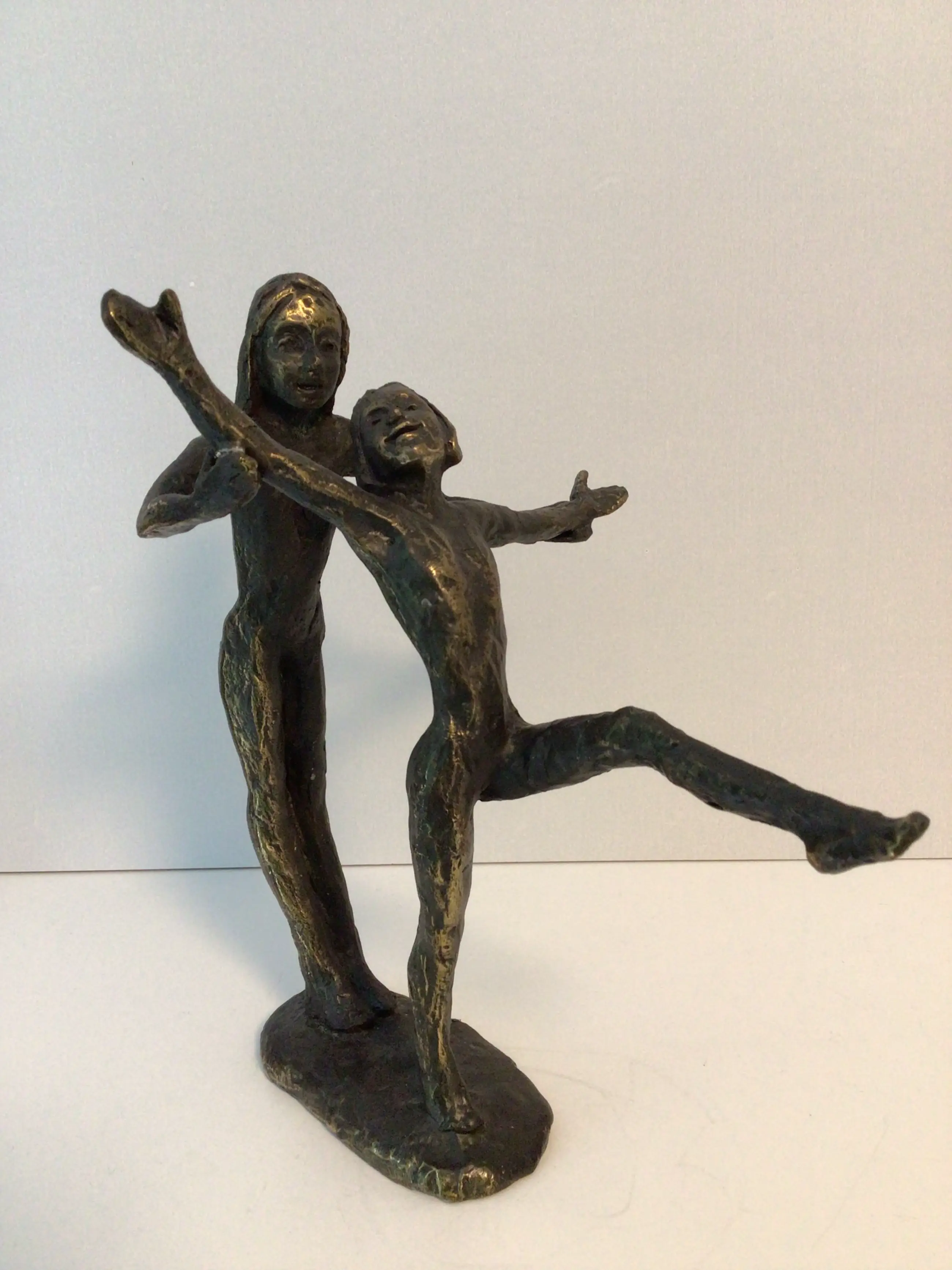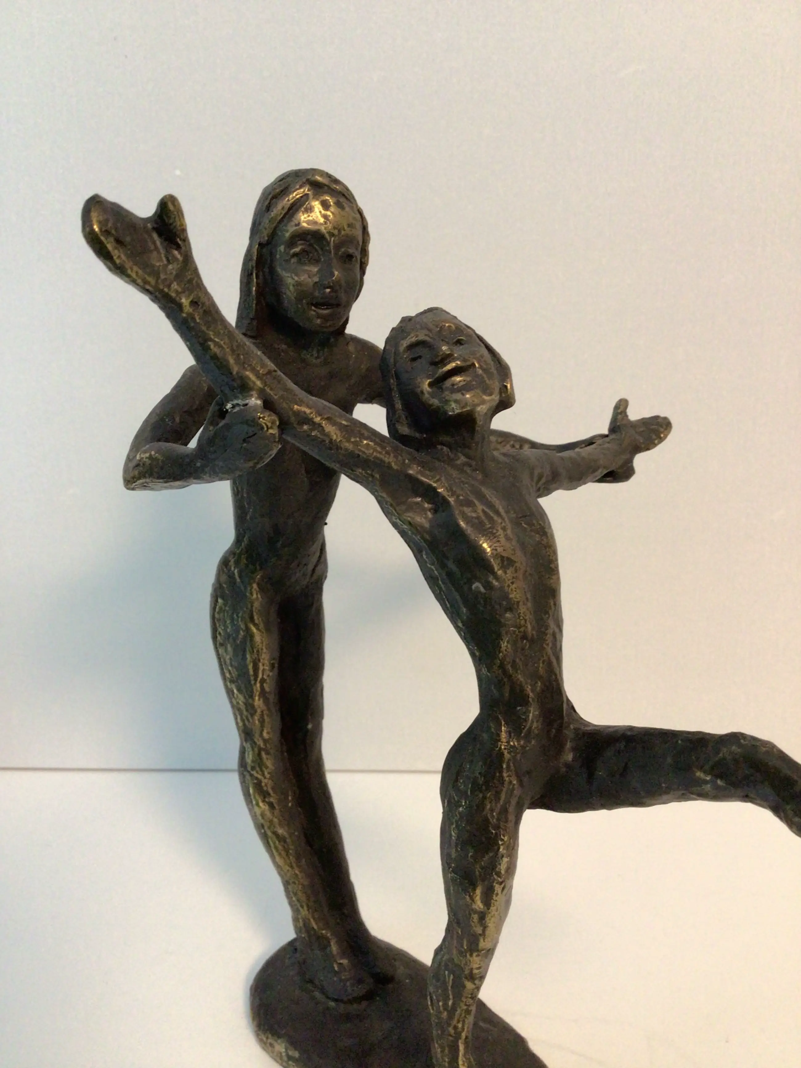 Zeer fraai en gedetailleerd uitgevoerd sculptuur van twee mensfiguren die helemaal op gaan in een vrolijke dans Kunstenares: Astrid Veldhuyzen Koppen Het beeld is gesigneerd: AV Titel : “ Beweging in emotie “ Achtergrondgedachte kunstenares “ Dans en beweging maken de geest vrij, het brengt ons samen “ Hoogte: 19 cm Materiaal: legering Het beeld verkeert in zeer goede staat en wordt zorgvuldig verpakt verzonden.