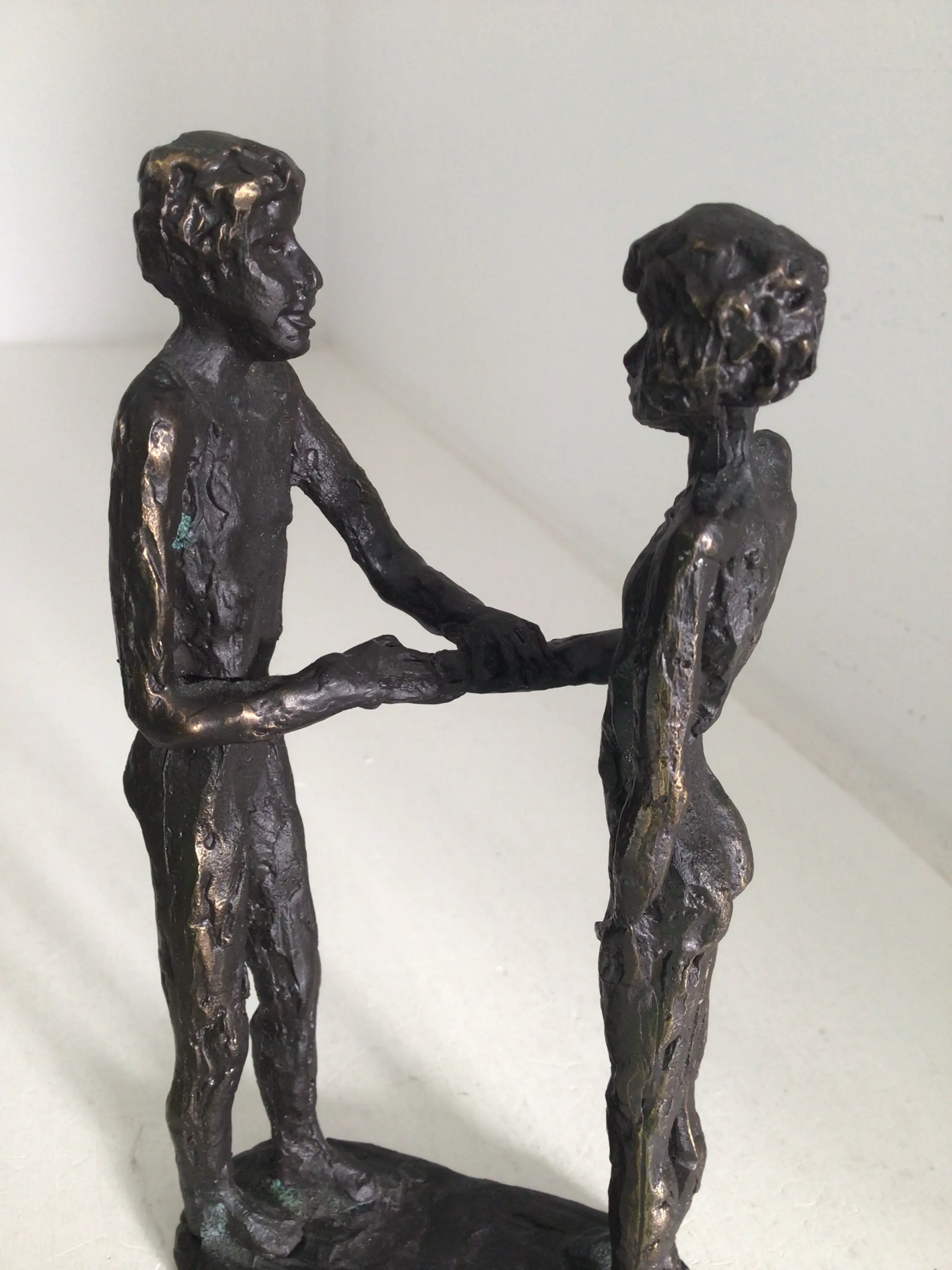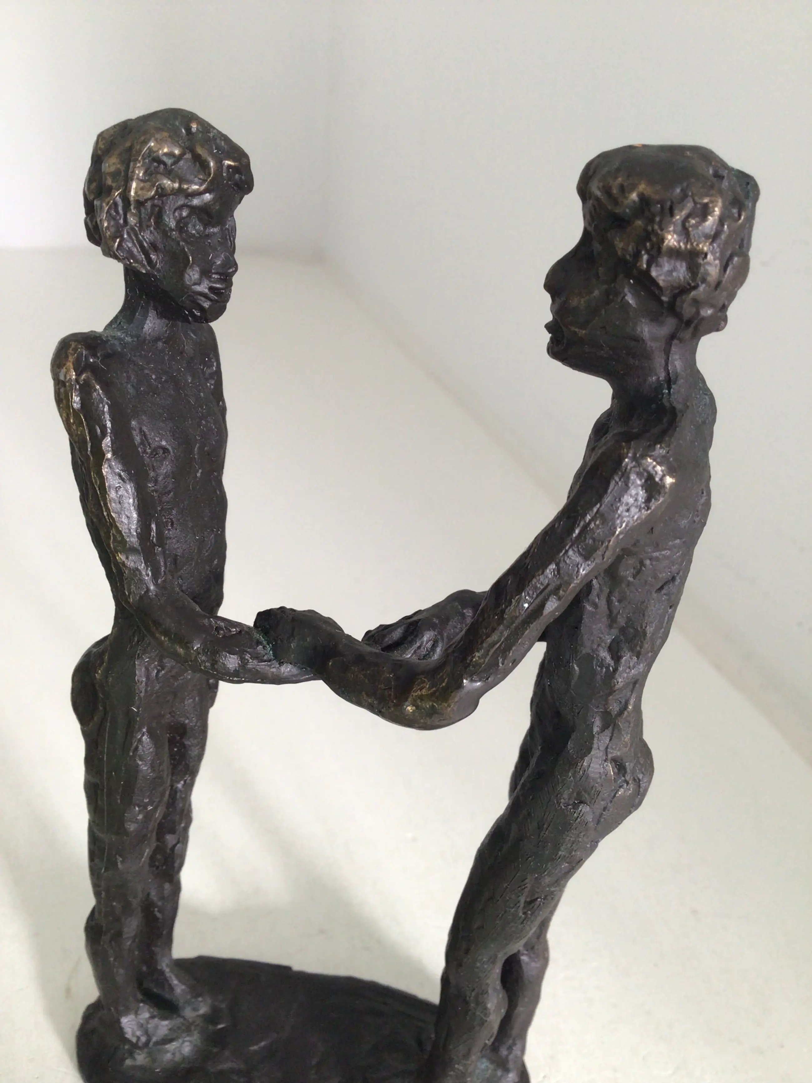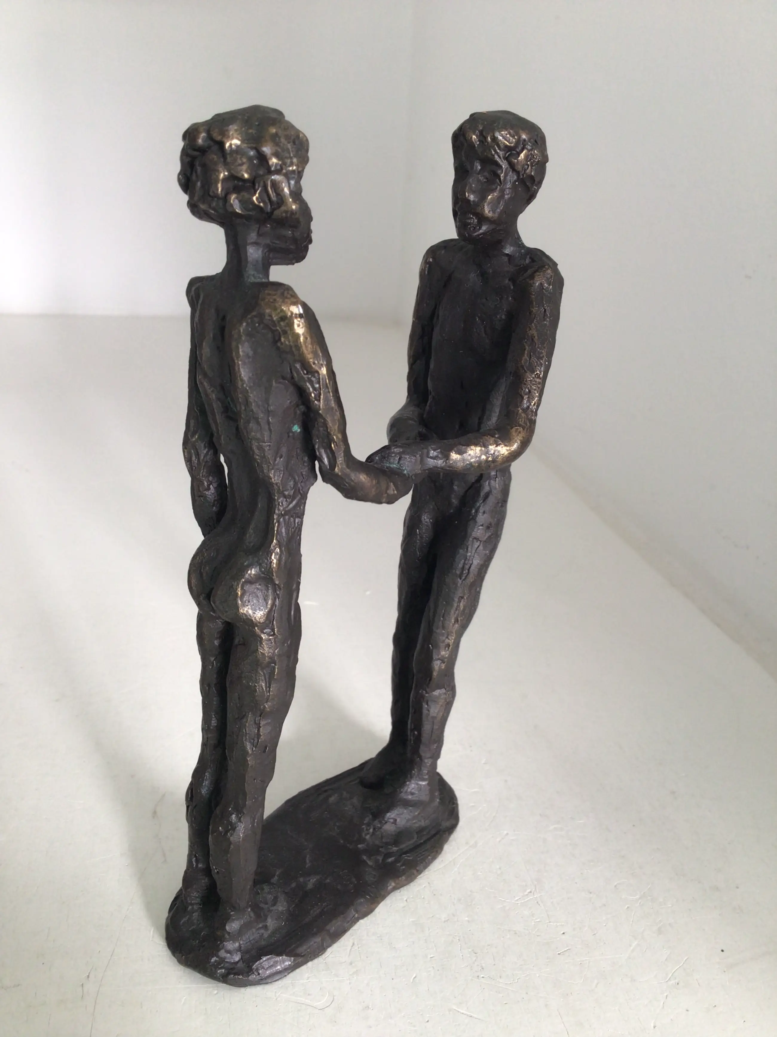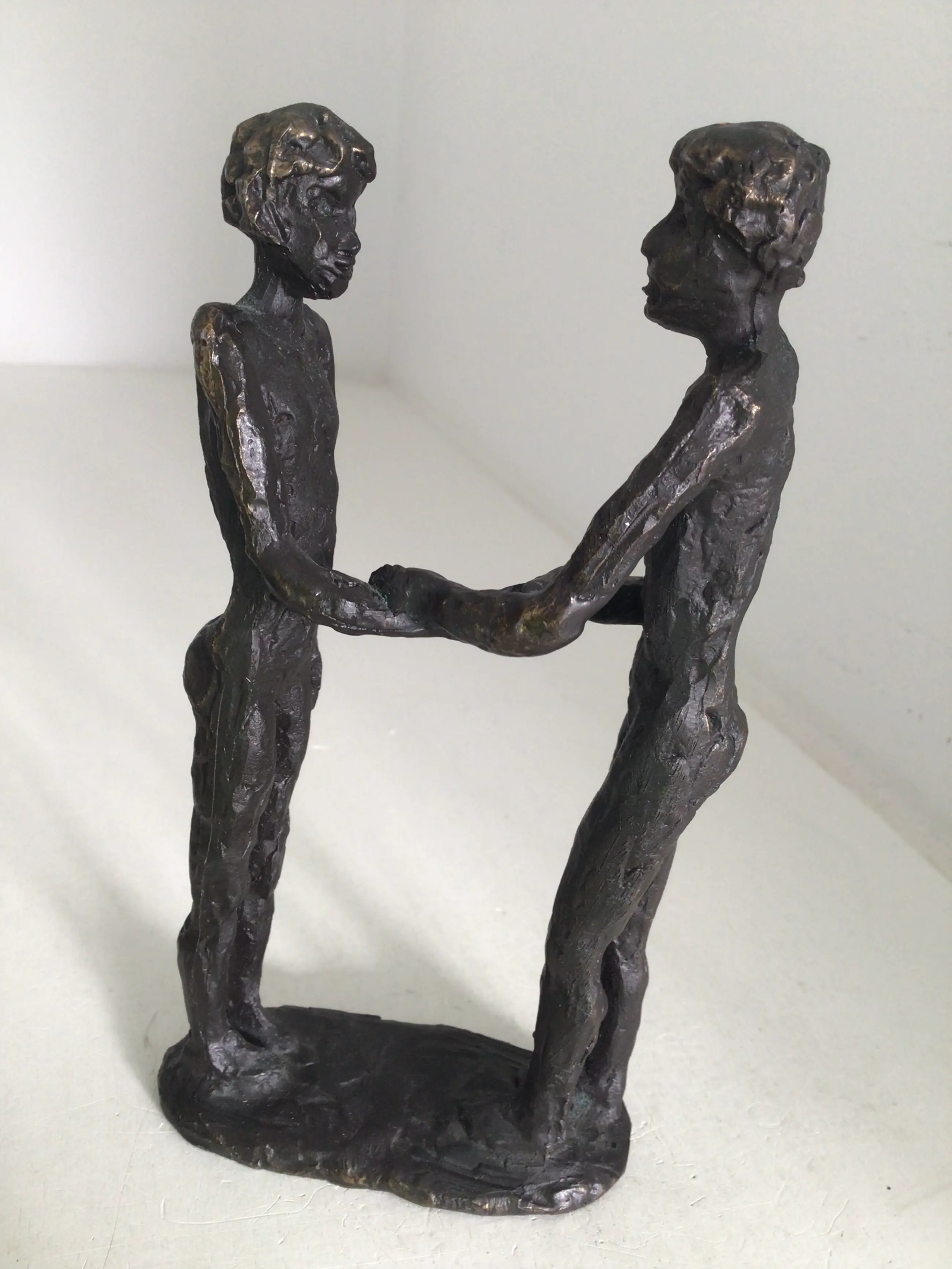 Zeer fraai en gedetailleerd uitgevoerd sculptuur van twee mensfiguren die elkaar hartelijk de hand schudden. Titel “ Dank voor je inzet en vertrouwen “ Kunstenares: Astrid Veldhuyzen Koppen Hoogte : 15 cm Materiaal: Alloy Het beeld verkeert in zeer goede staat en wordt zorgvuldig verpakt verzonden