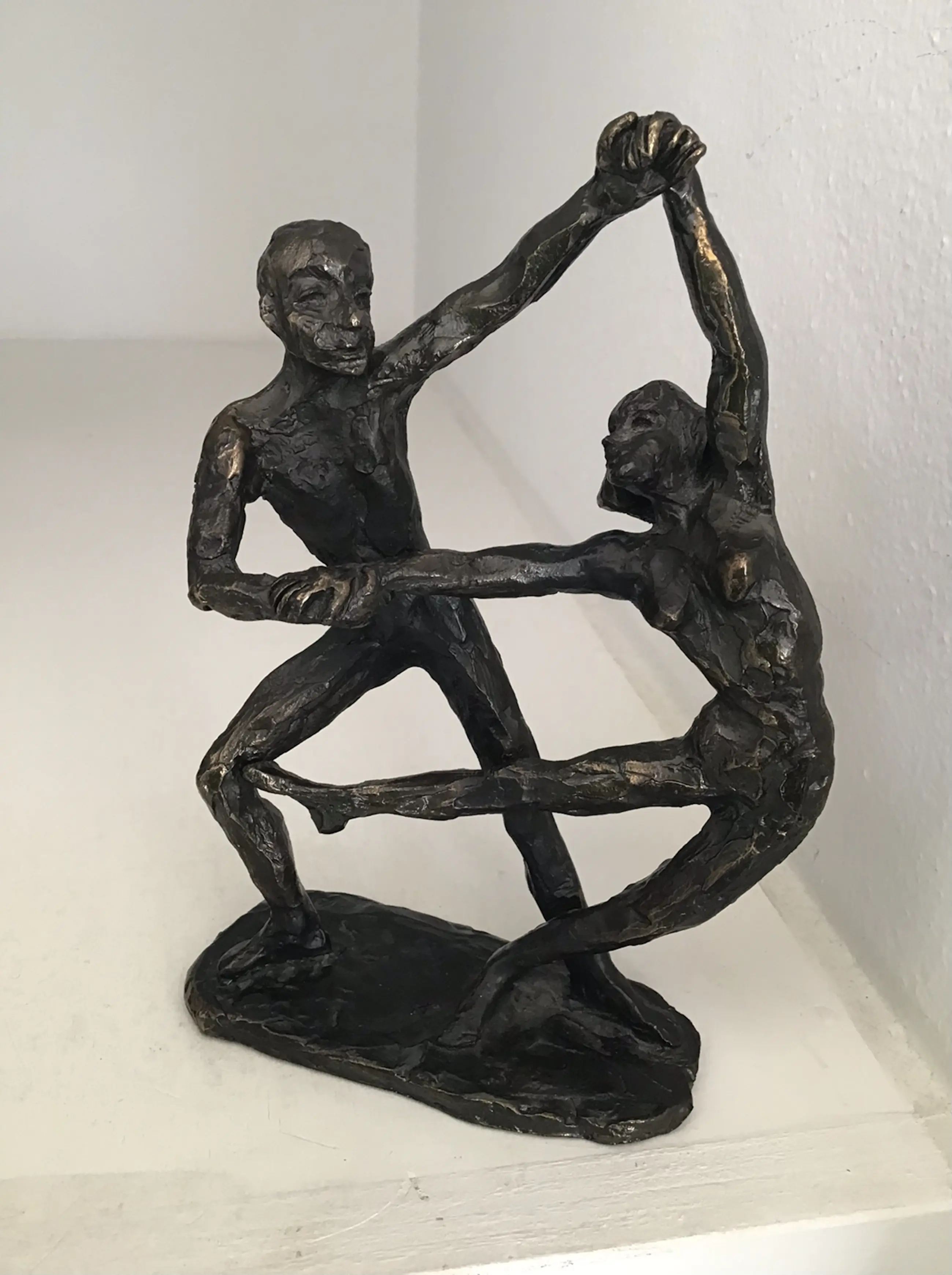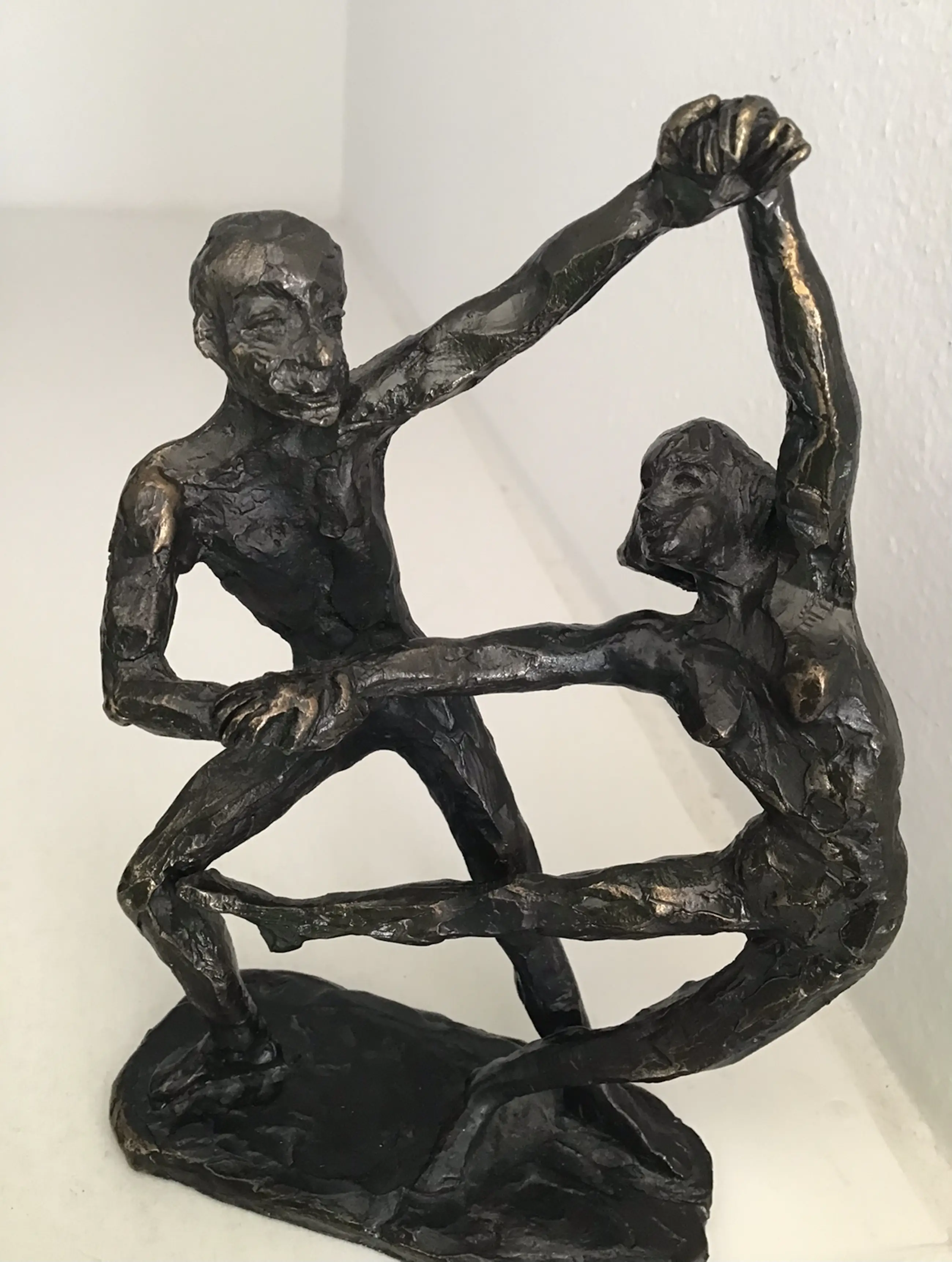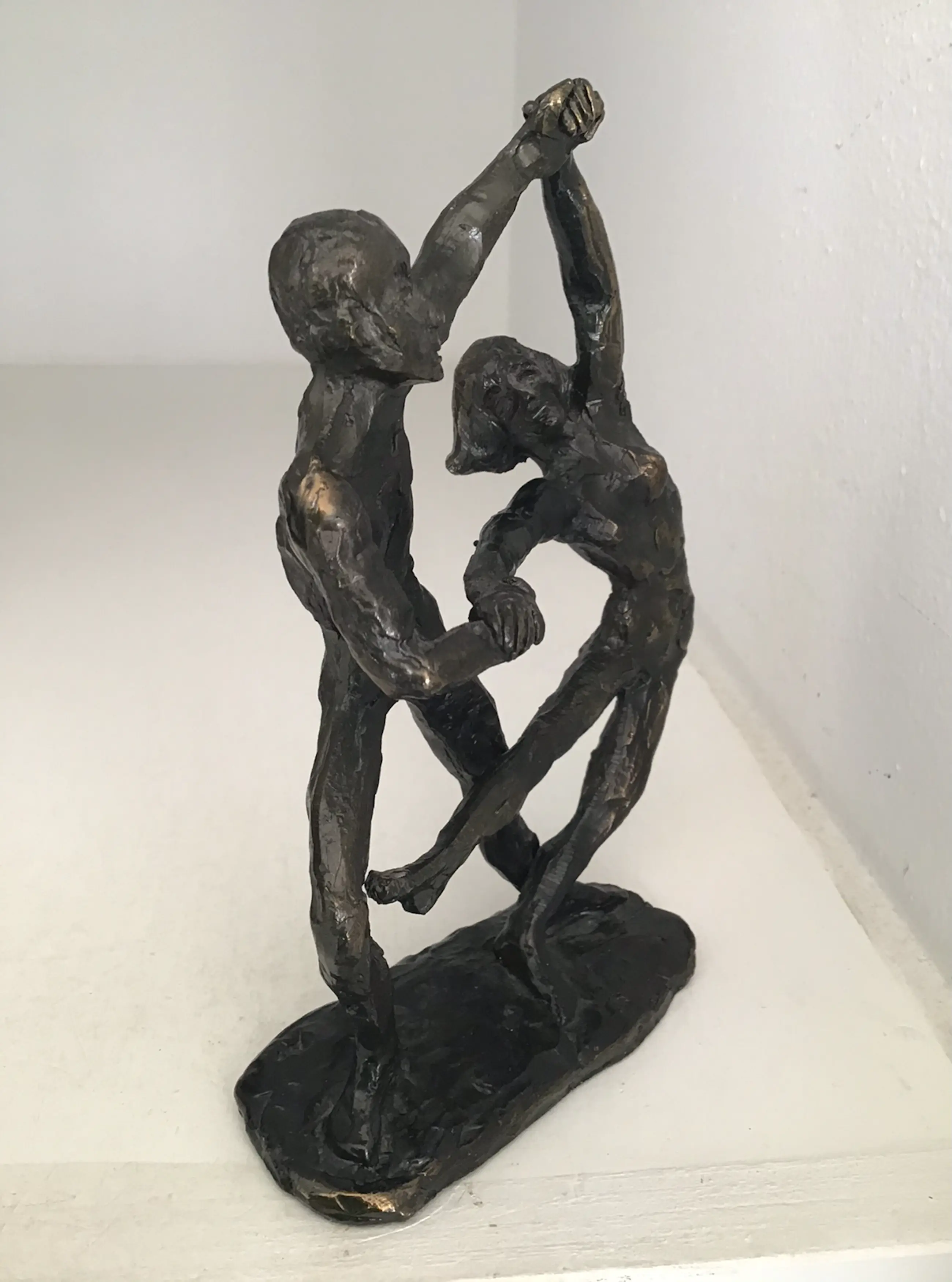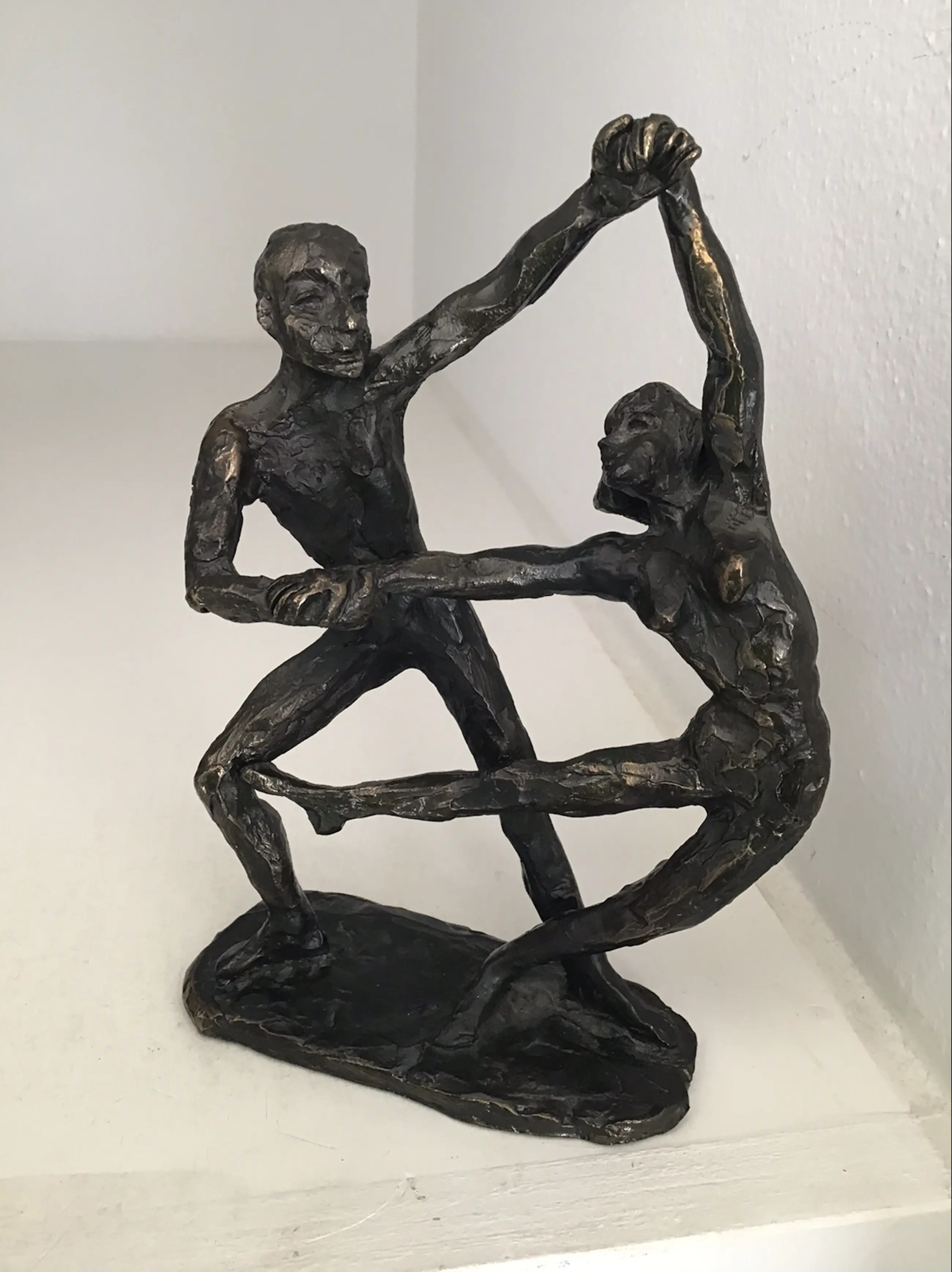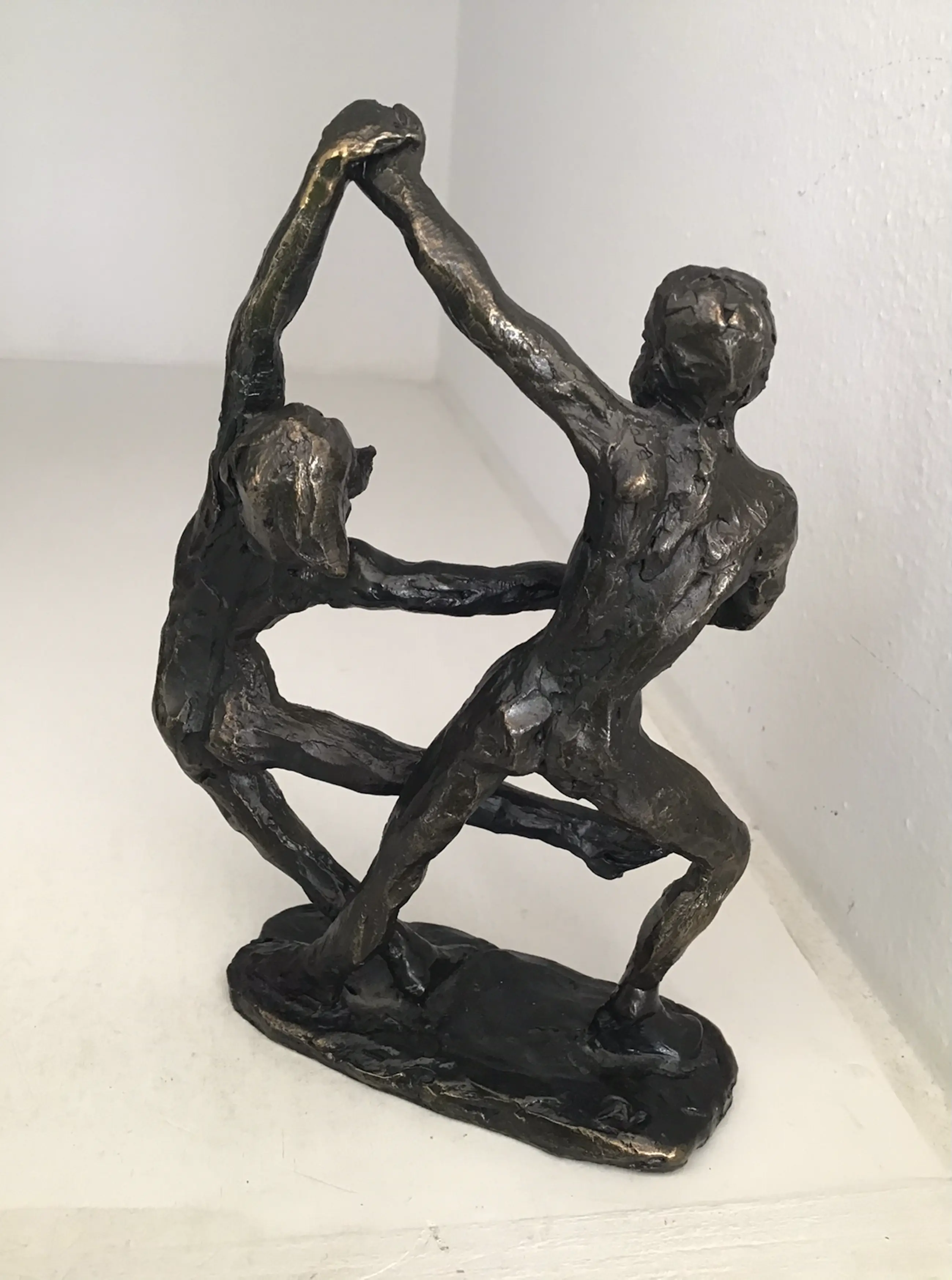 Zeer fraai en sierlijk sculptuur van twee mensen die vrolijk een dansje wagen. Kunstenares: Astrid Veldhuyzen Het beeld is gesigneerd: AV Hoogte : 16 cm Materiaal: verbronsd metaal Het sculptuur verkeert in goede staat en wordt zorgvuldig verpakt en aangetekend verzonden.