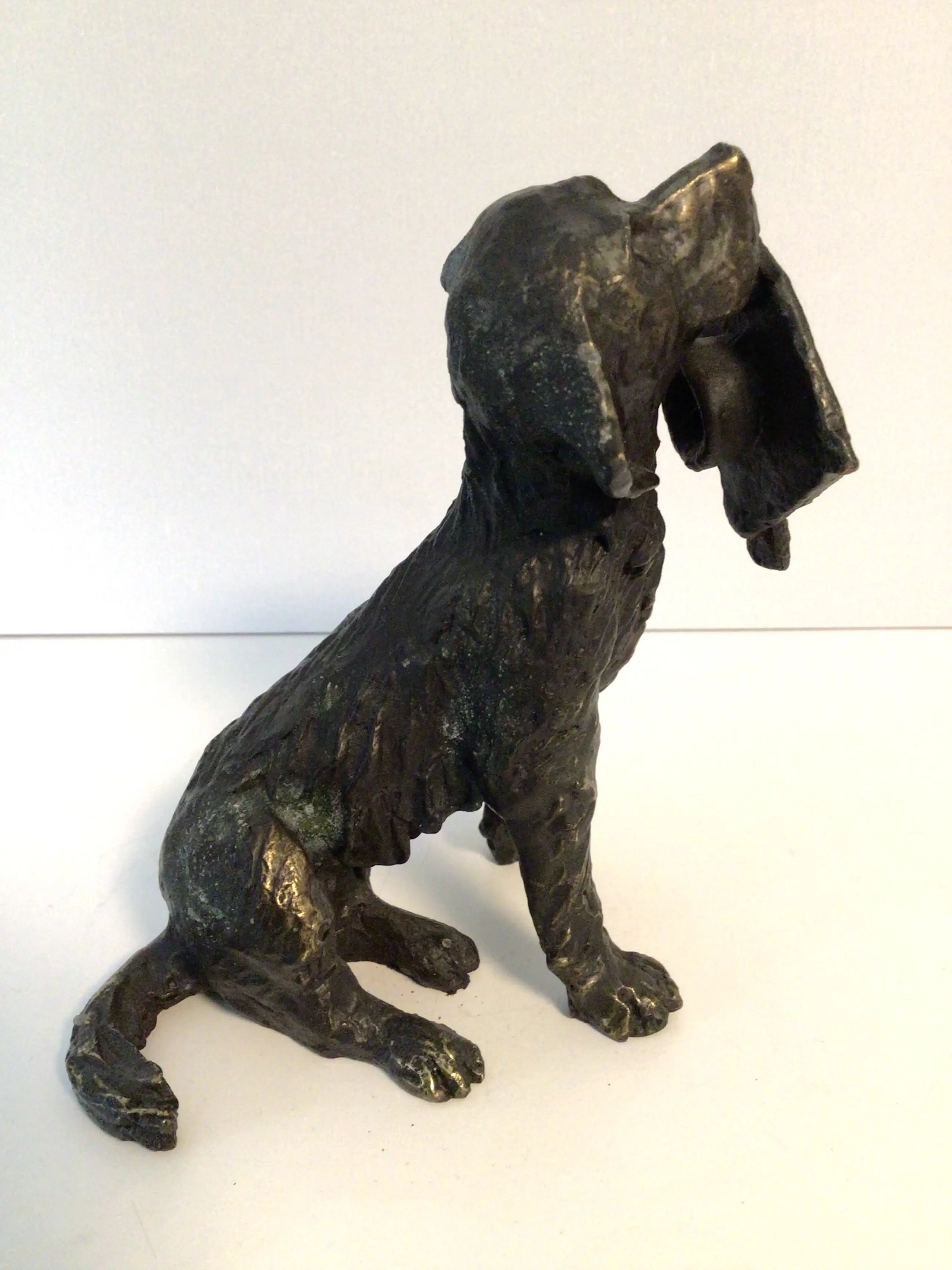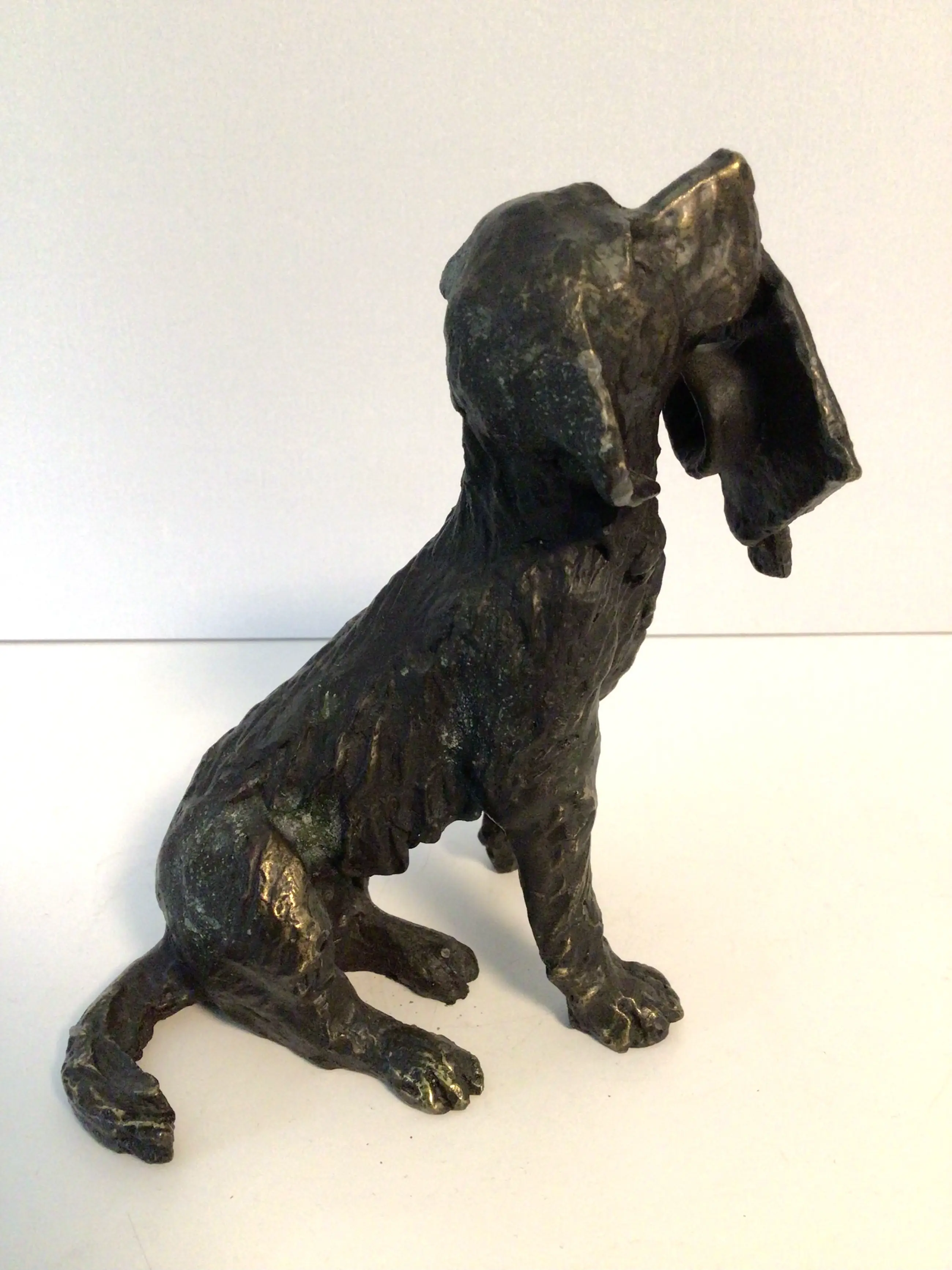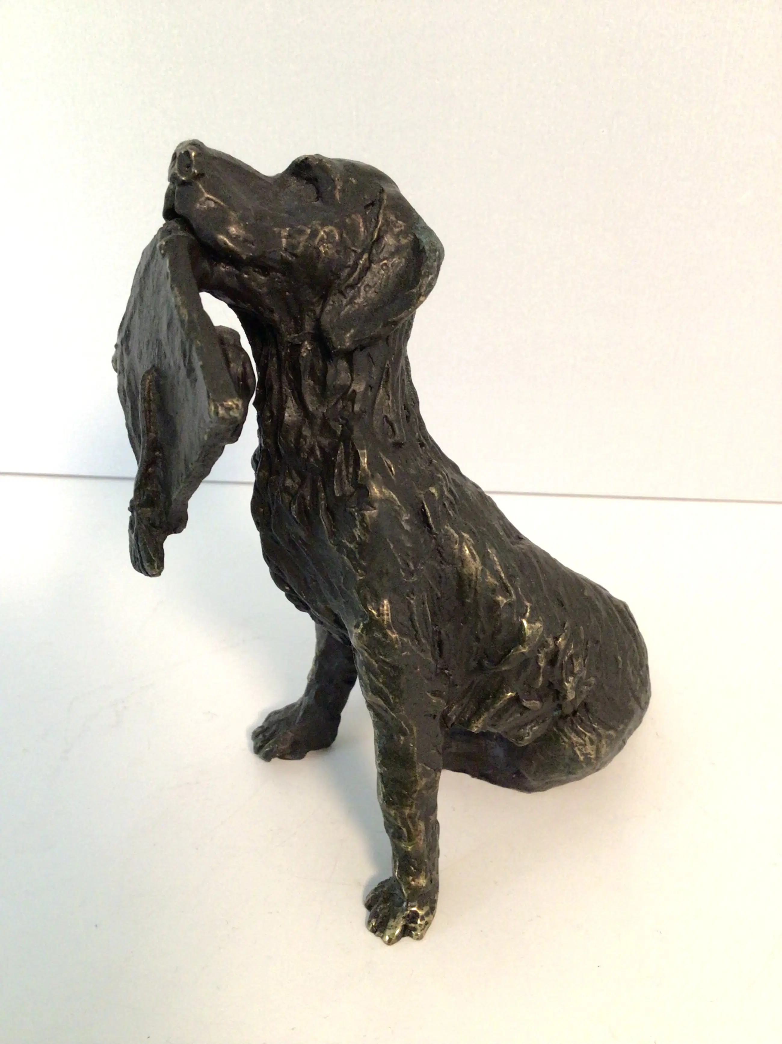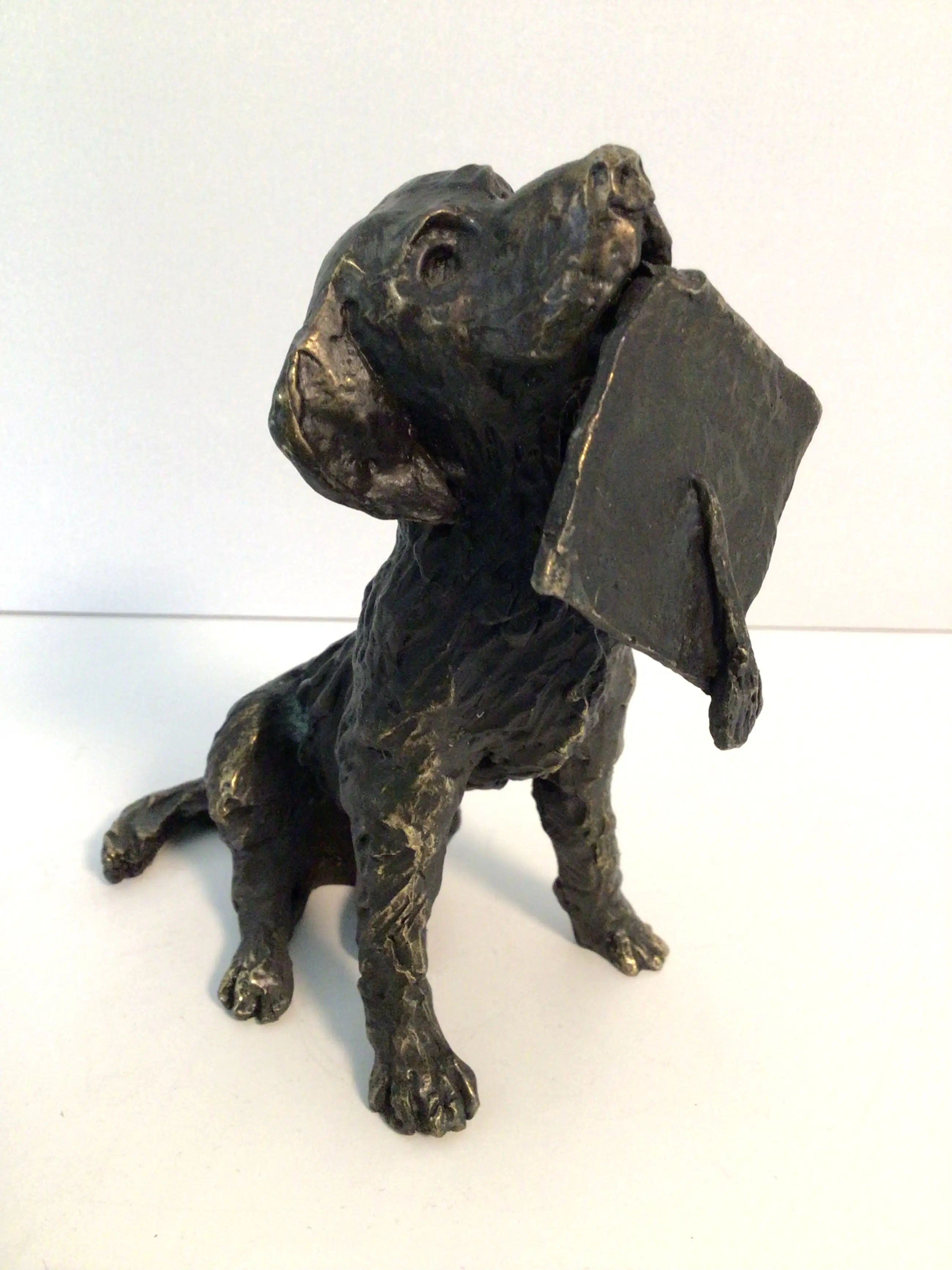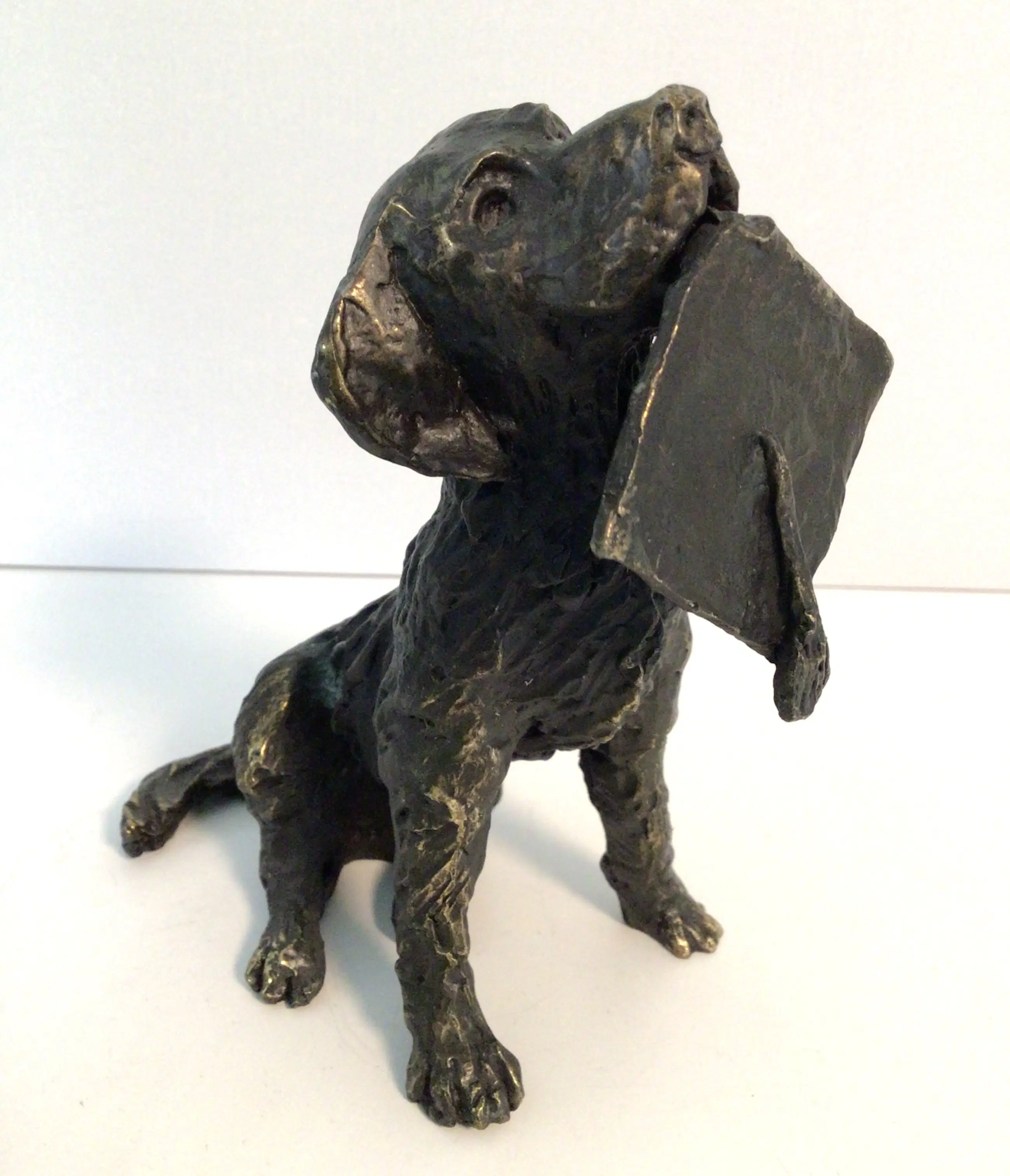 Zeer fraai en gedetailleerd vormgegeven sculptuur van zittende hond met in de bek een afstudeer baret. Titel “ De beloning “ Kunstenares: Astrid Veldhuyzen koppen Het beeld is gesigneerd: AV Hoogte: 13 cm Materiaal: brons Het beeld verkeert in goede staat en wordt zorgvuldig verpakt verzonden