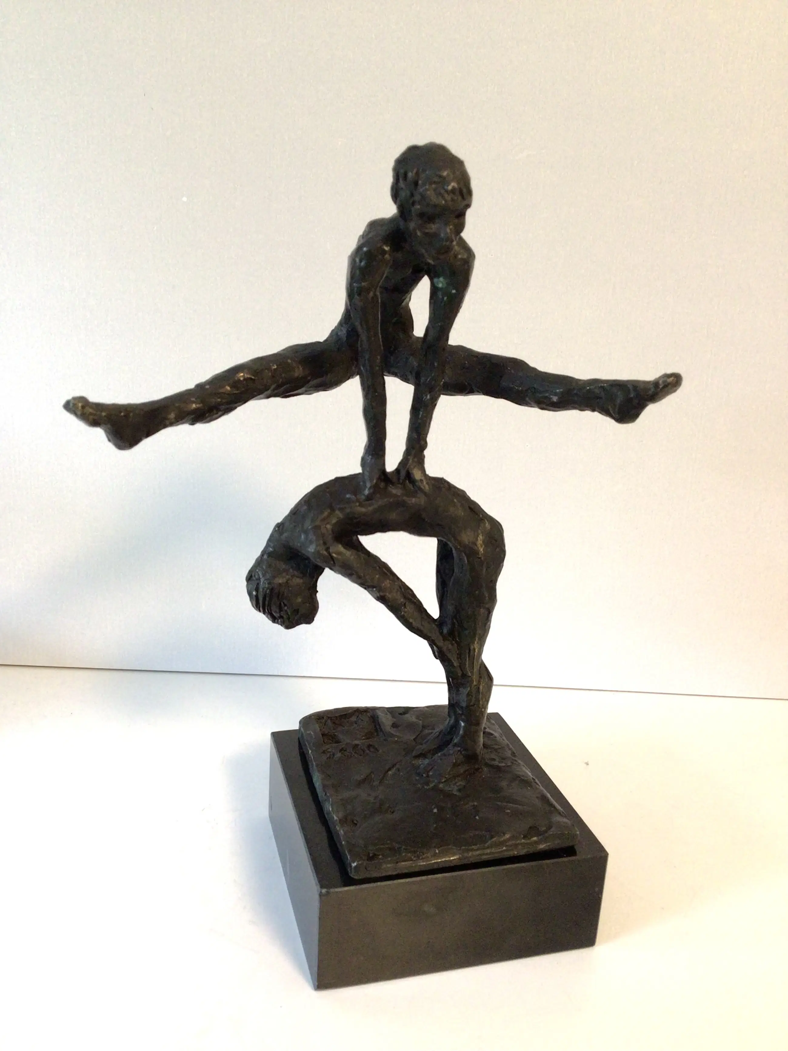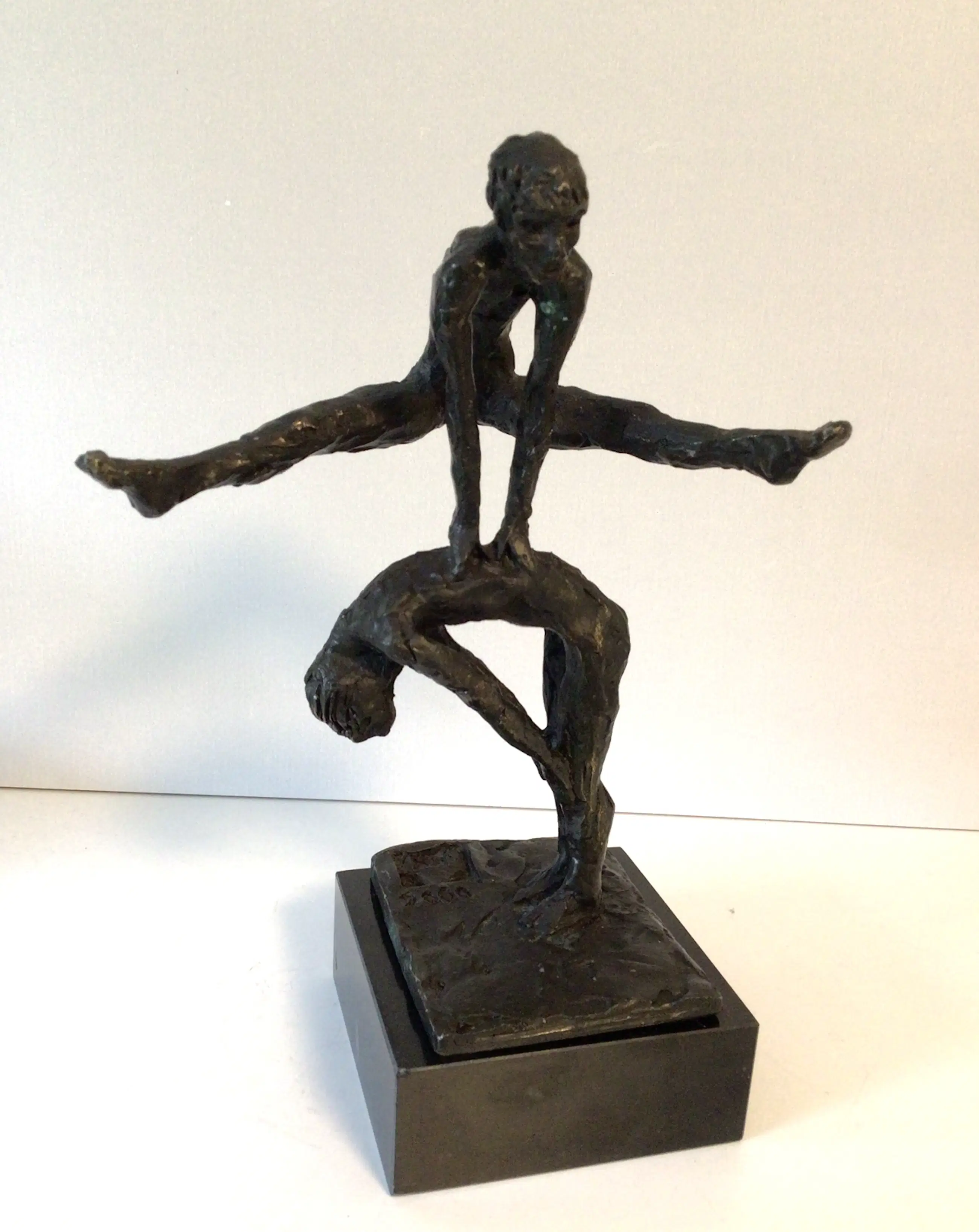 Zeer fraai en gedetailleerd vormgegeven sculptuur van twee kinderen die haasje-over spelen Kunstenares: Astrid Veldhuyzen- Koppen Het is op voet gesigneerd: AV. 2000 Titel “ De Bokkensprong “ Hoogte : 20 cm Materiaal: brons op marmeren sokkel Het beeld verkeert in goede staat en wordt zorgvuldig verpakt verzonden