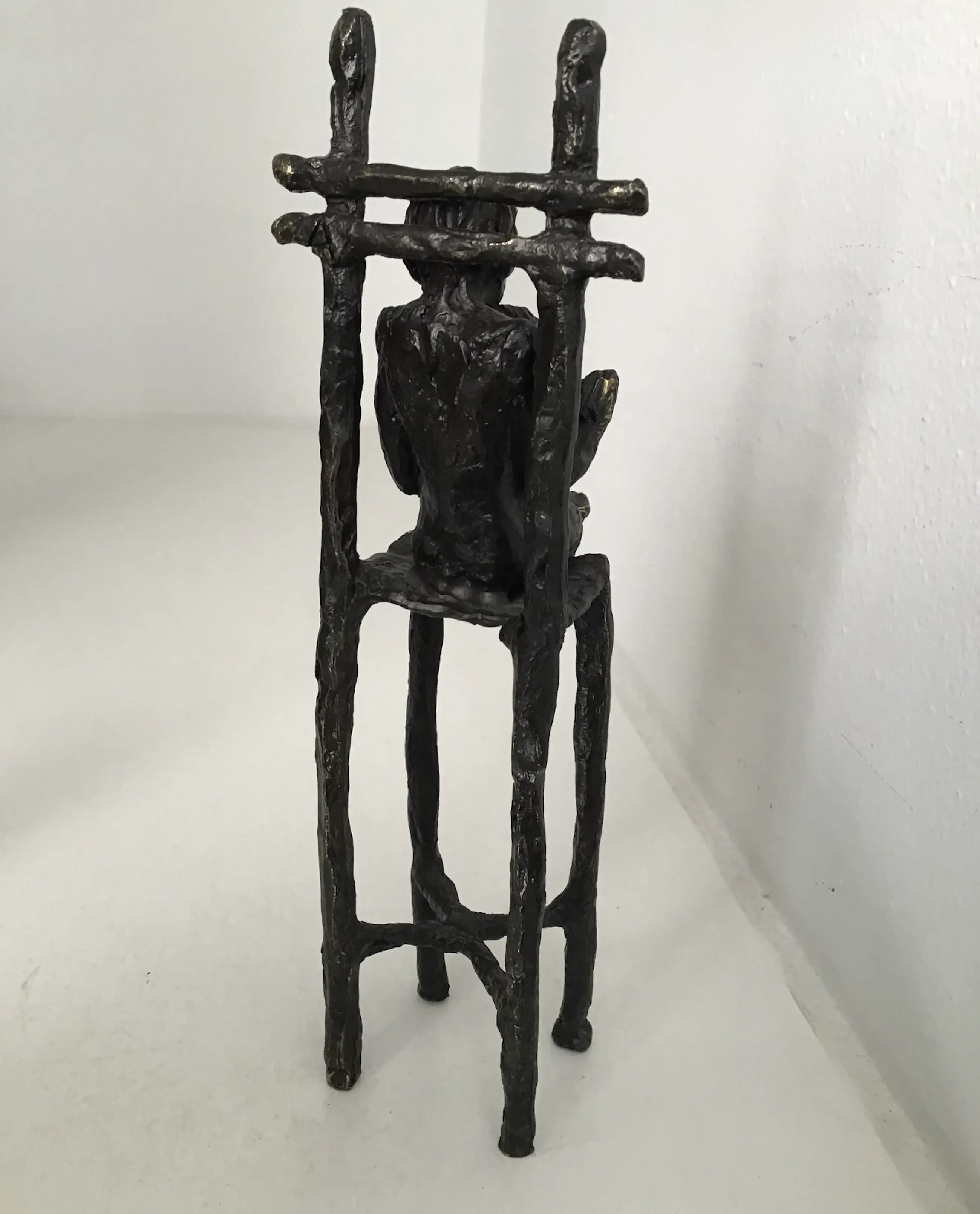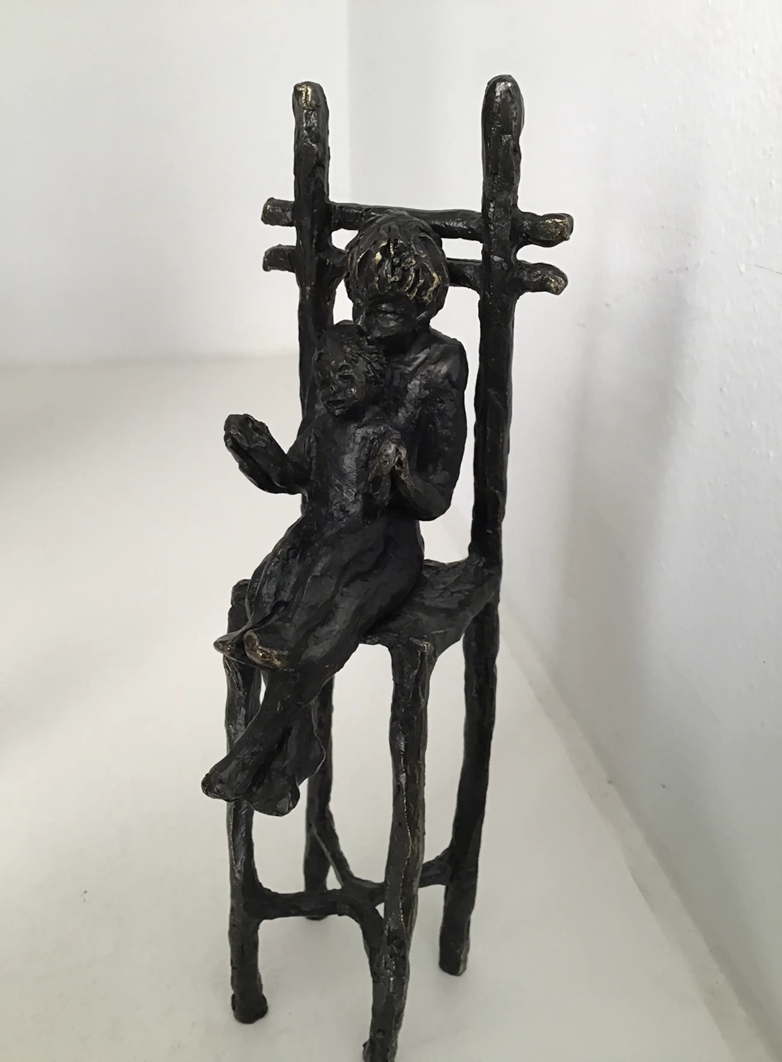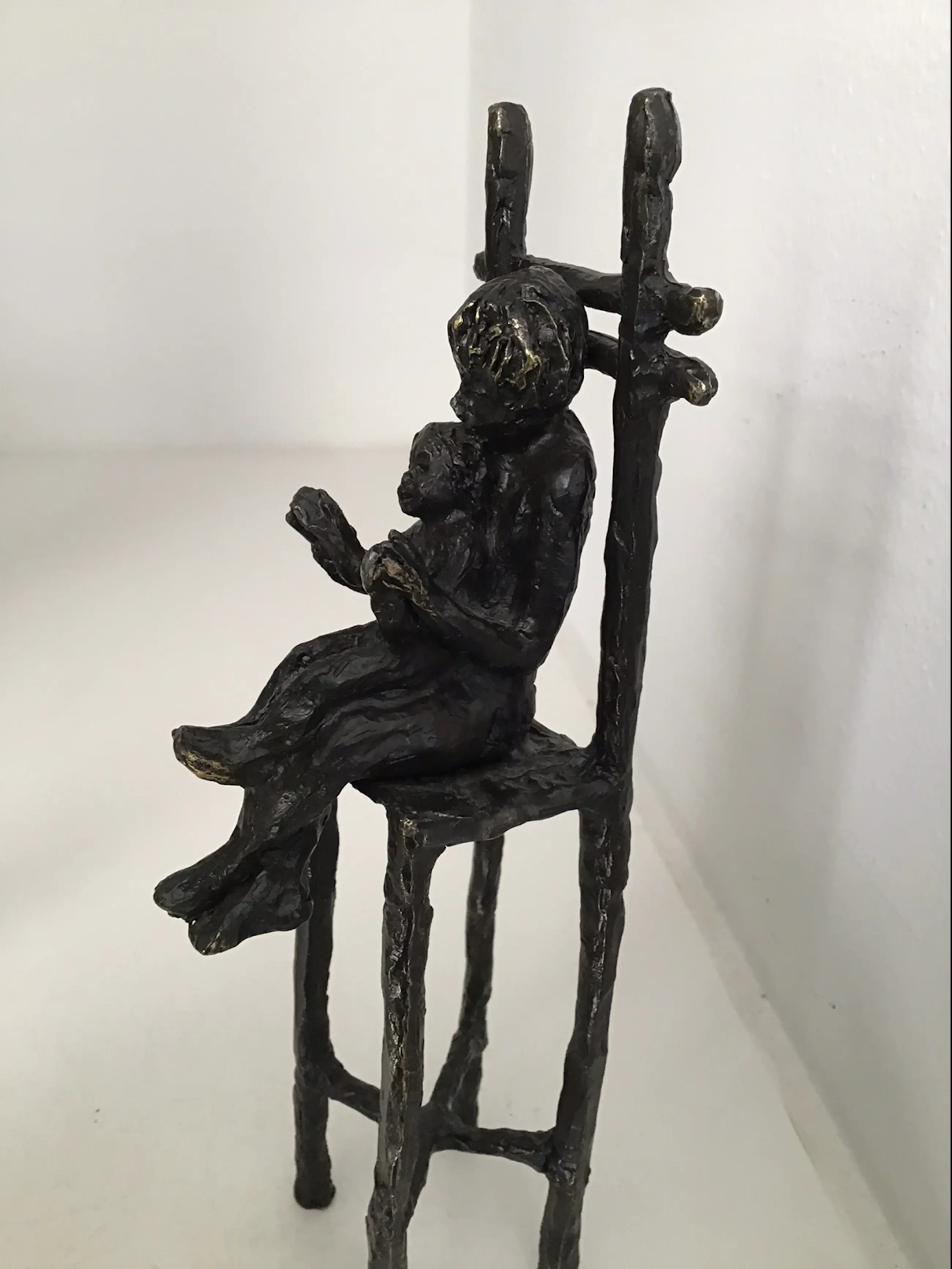 Zeer fraai en vertederend sculptuur van twee kindjes samen zittend op een hoge stoel Titel “ Ereplaats “ Kunstenares: Astrid Veldhuyzen Koppen Materiaal: Alloy Het beeld is gesigneerd: AV Hoogte: 21 cm Het beeld verkeert in goede staat en wordt zorgvuldig verpakt en aangetekend verzonden.