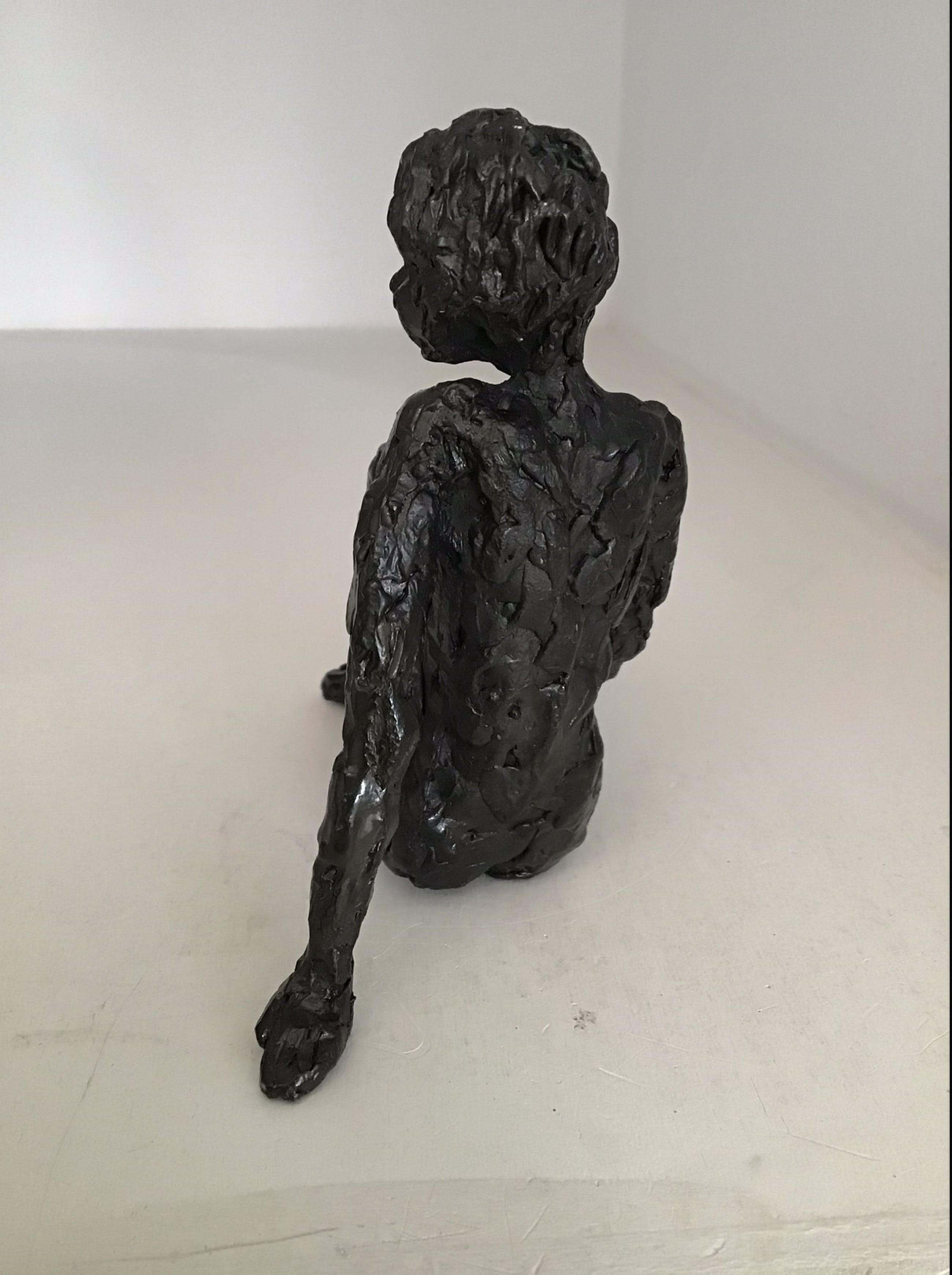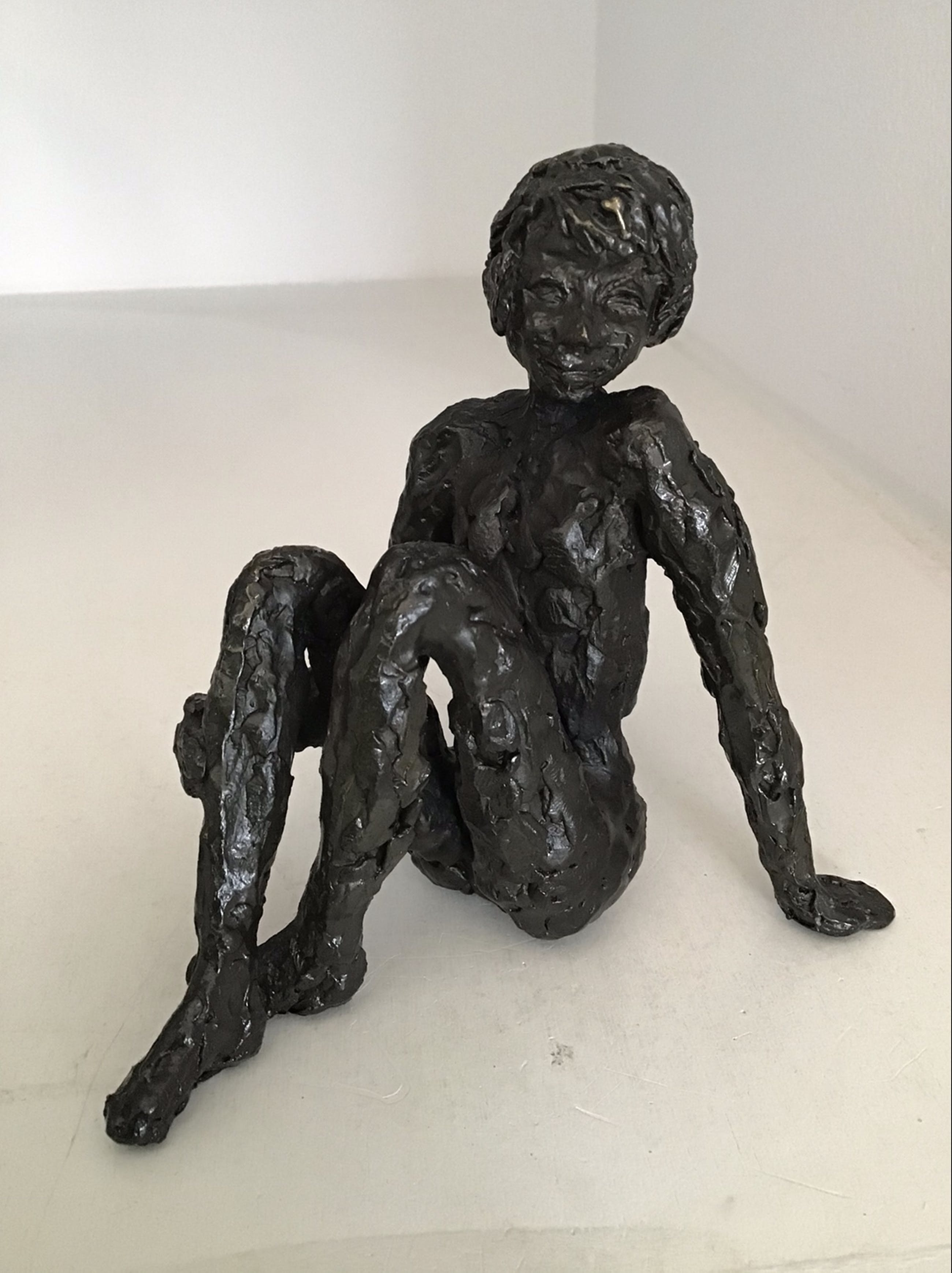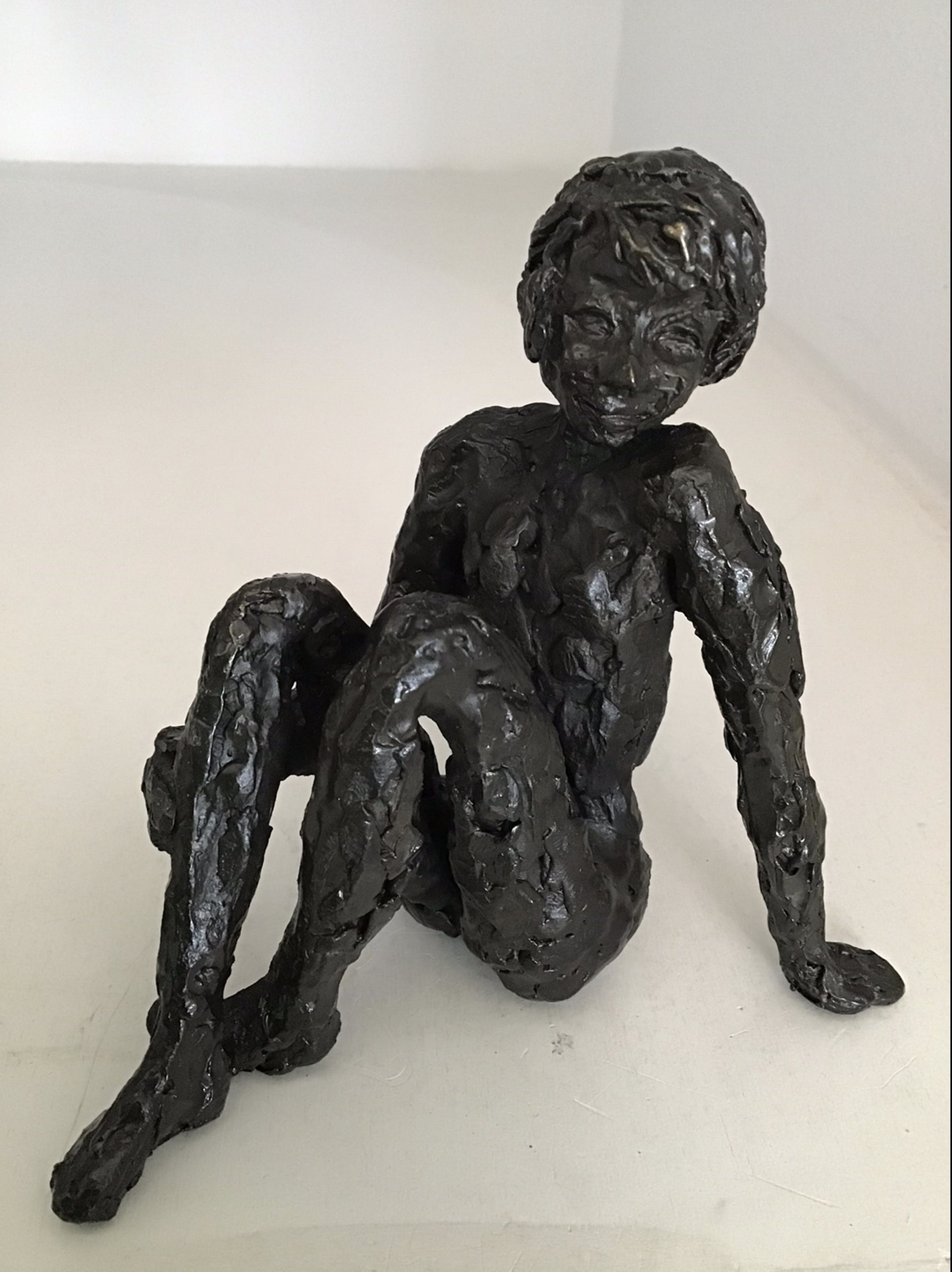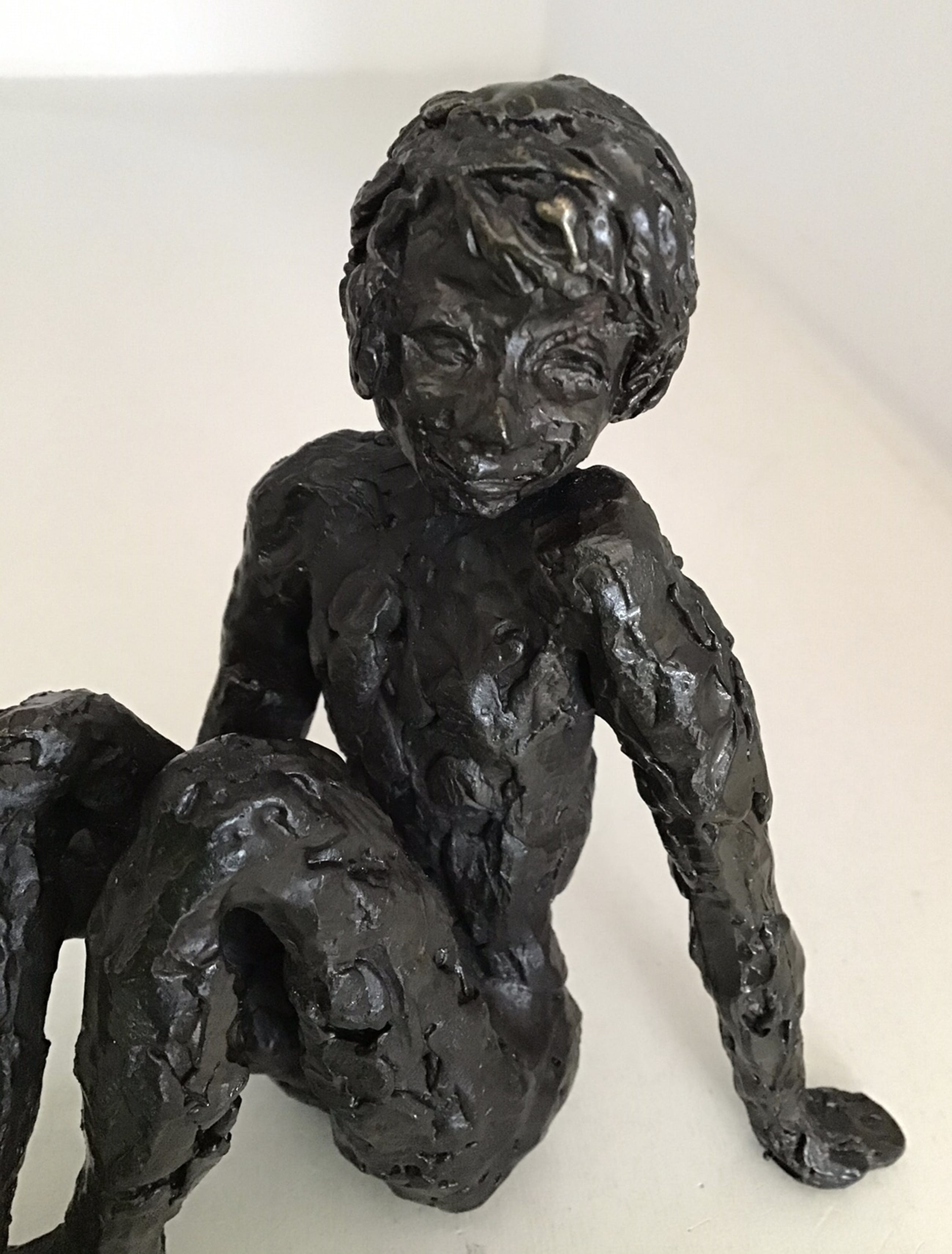 Prachtig mooi gedetailleerd sculptuur van een meisje dat zittend op de grond in gedachten is verzonken . Kunstenares : Astrid Veldhuyzen - Koppen Materiaal : brons Gewicht : 980 gram Het beeld verkeert in zeer goede staat en wordt zorgvuldig verpakt en aangetekend verzonden .