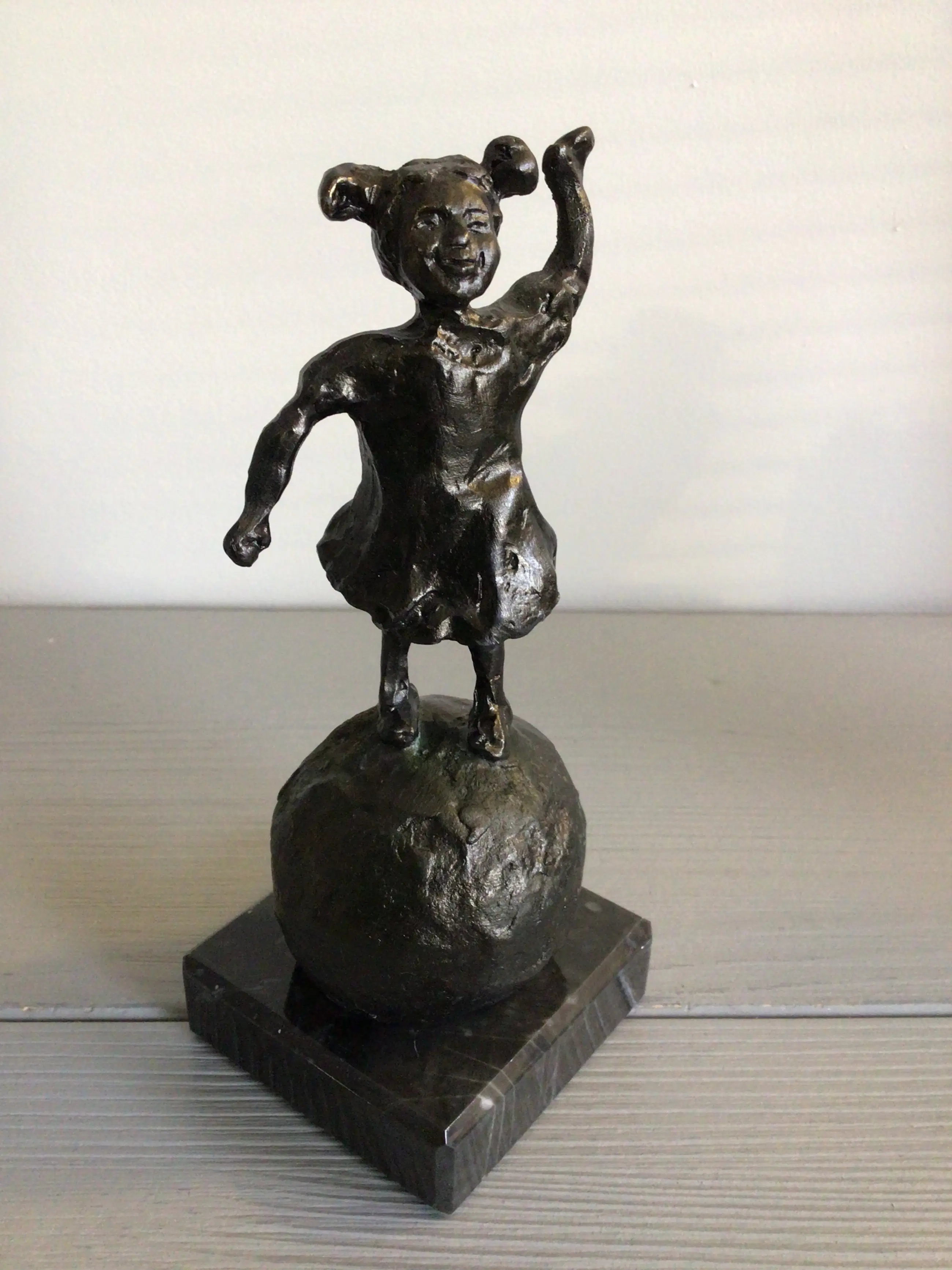Zeer fraai en gedetailleerd vormgegeven sculptuur van een vrolijk zwaaiend meisje staande op een grote bal. Kunstenares: Astrid Veldhuyzen- Koppen Gewicht : 655 gram Het beeld staat los op een marmeren sokkel, u kunt zelf beslissen of u deze wilt gaan gebruiken … Het beeld verkeert in goede staat en wordt zorgvuldig verpakt verzonden