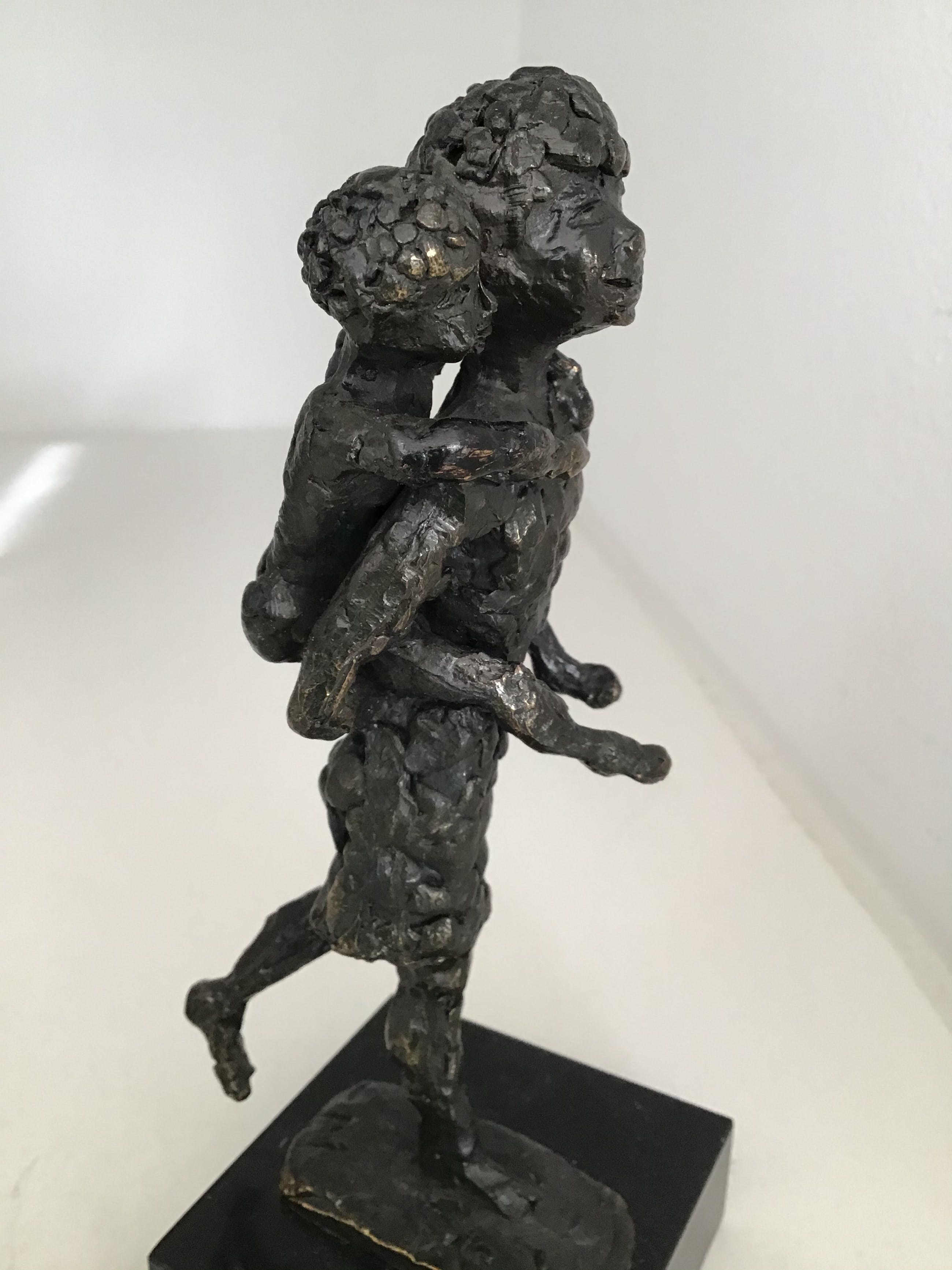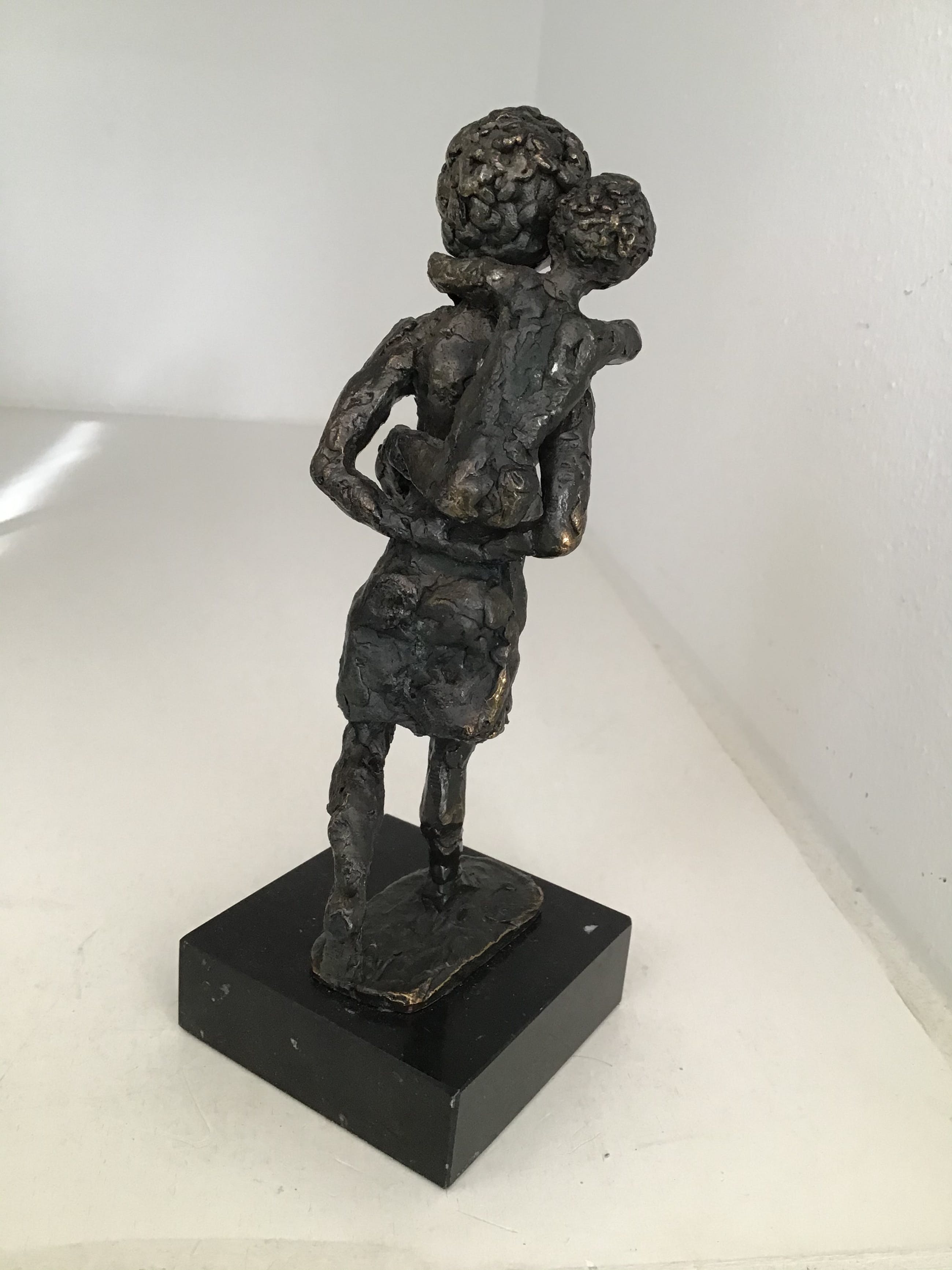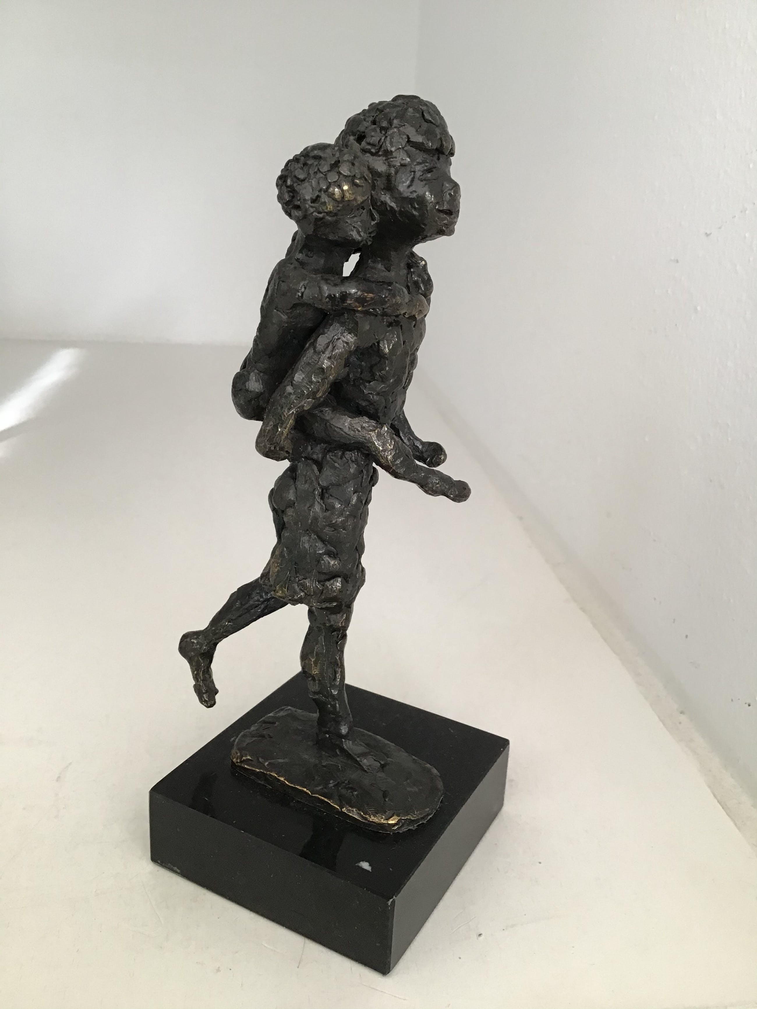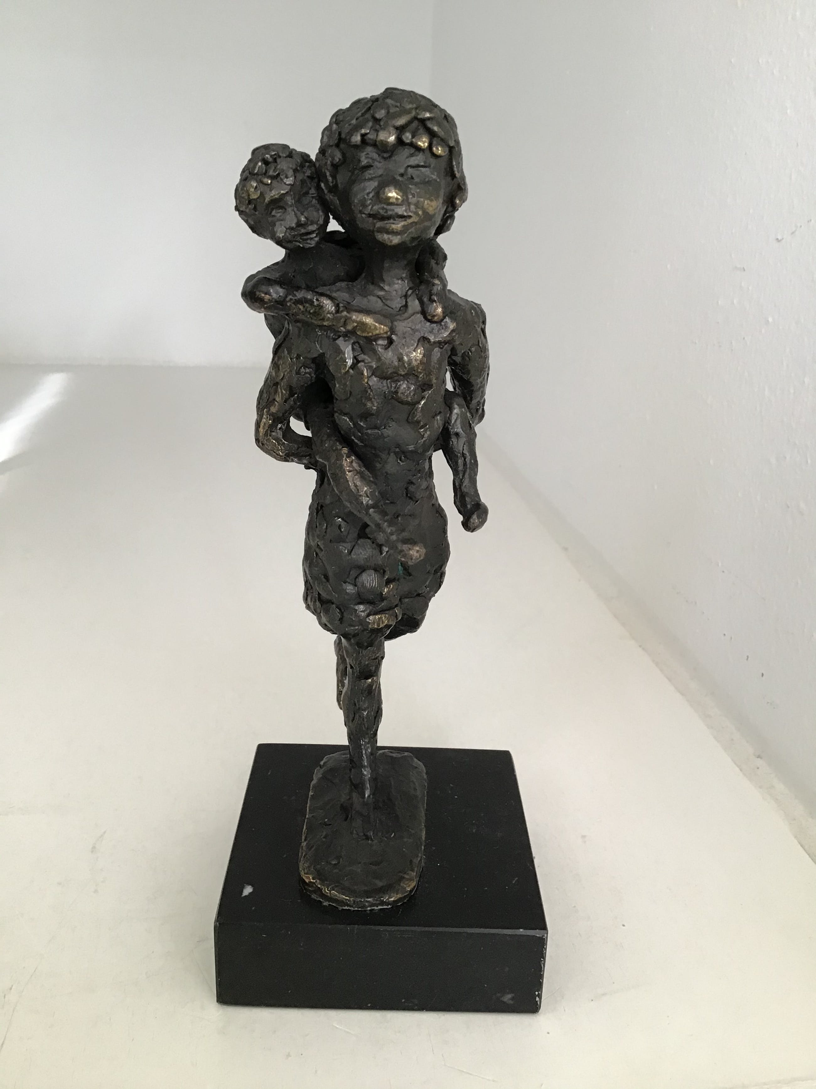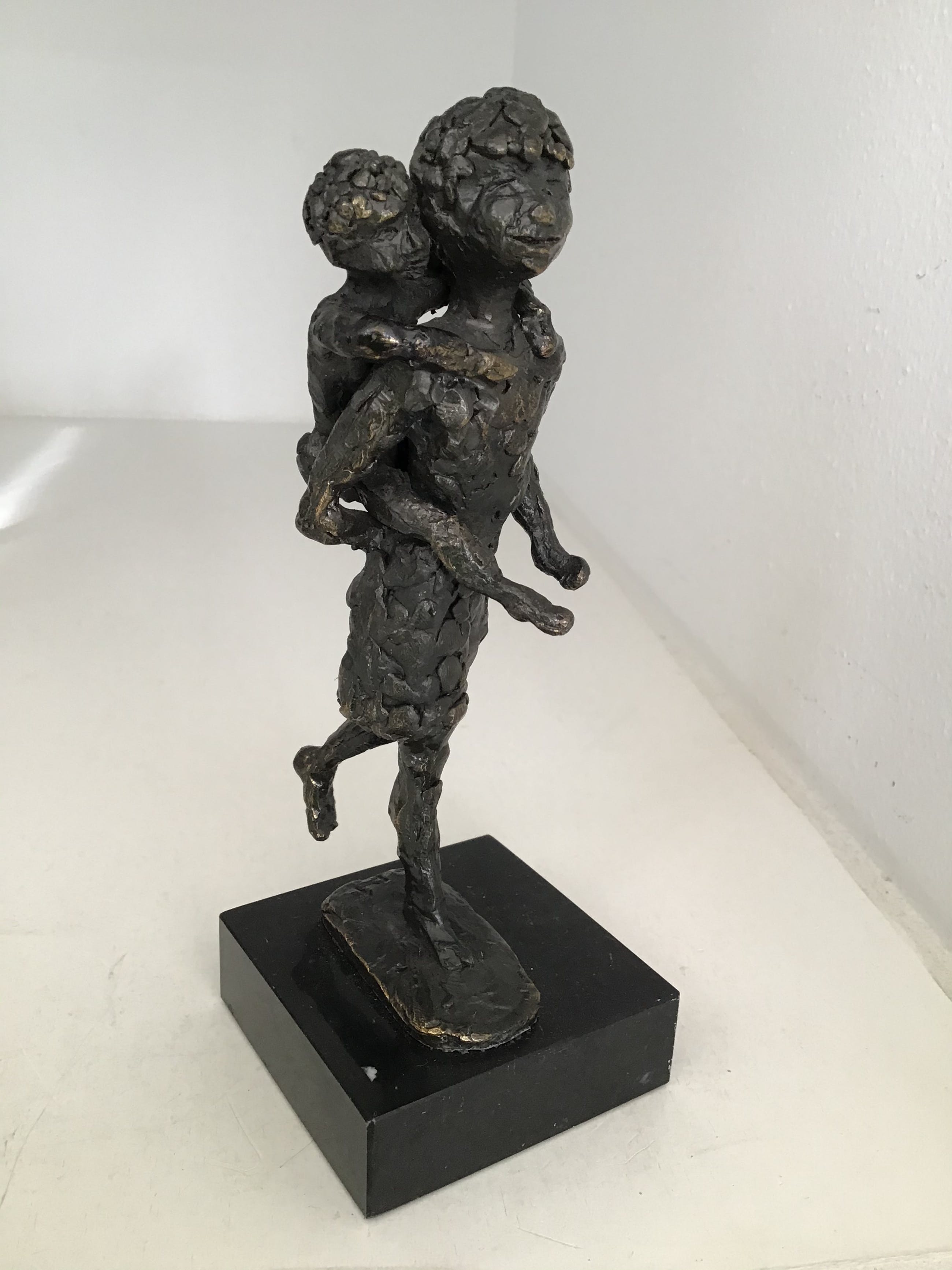 Zeer fraai en mooi gedetailleerd uitgevoerd sculptuur van een meisje met op haar rug haar kleine zusje. Kunstenares: Astrid Veldhuyzen Is gesigneerd: AV Hoogte : 18 cm Materiaal: legering op marmeren sokkel. Het beeld verkeert in zeer goede staat en wordt zorgvuldig verpakt en aangetekend verzonden