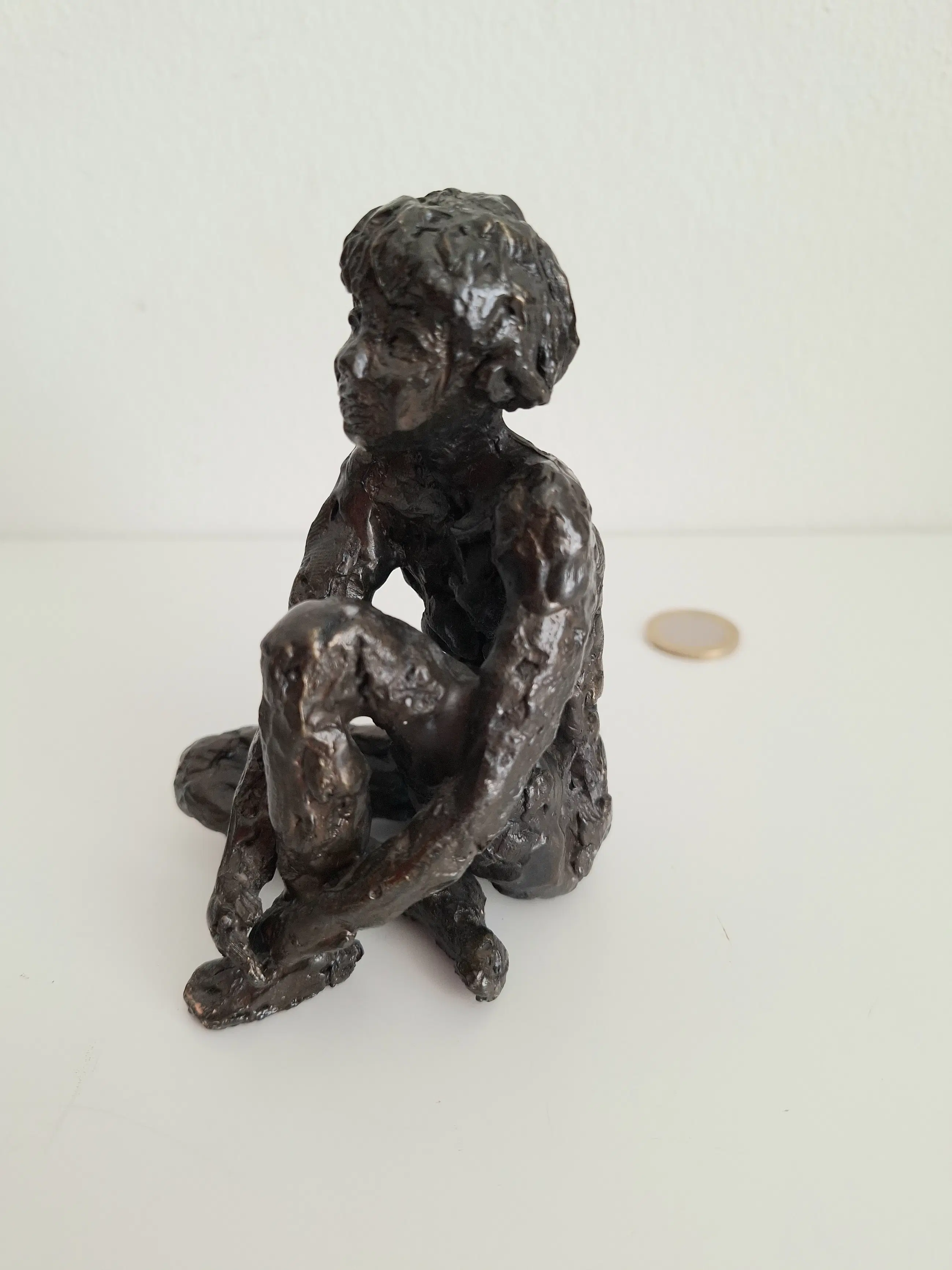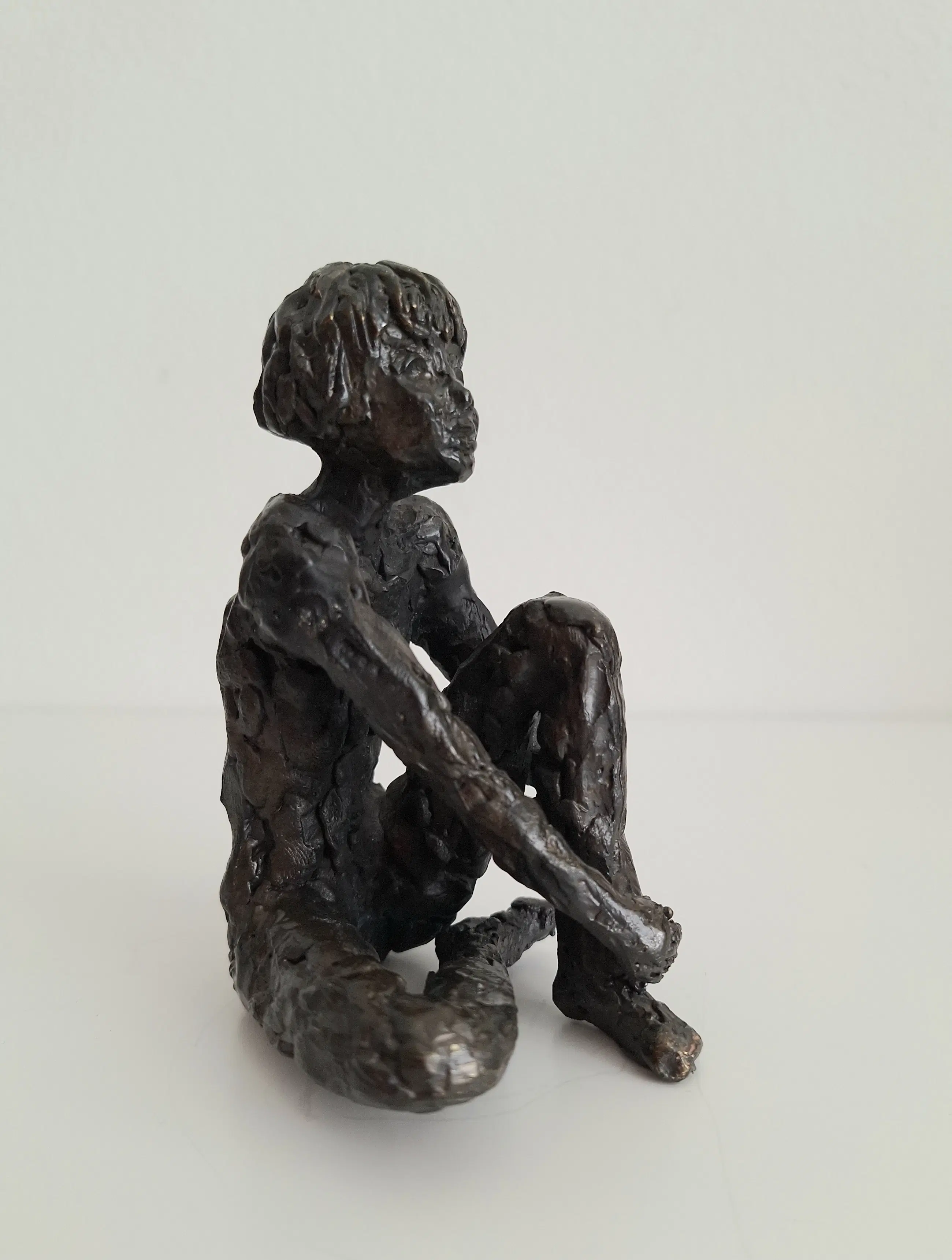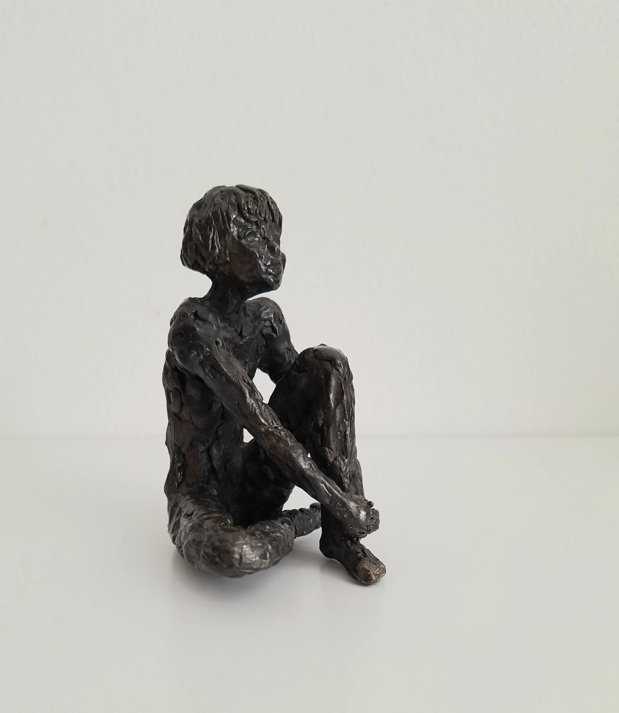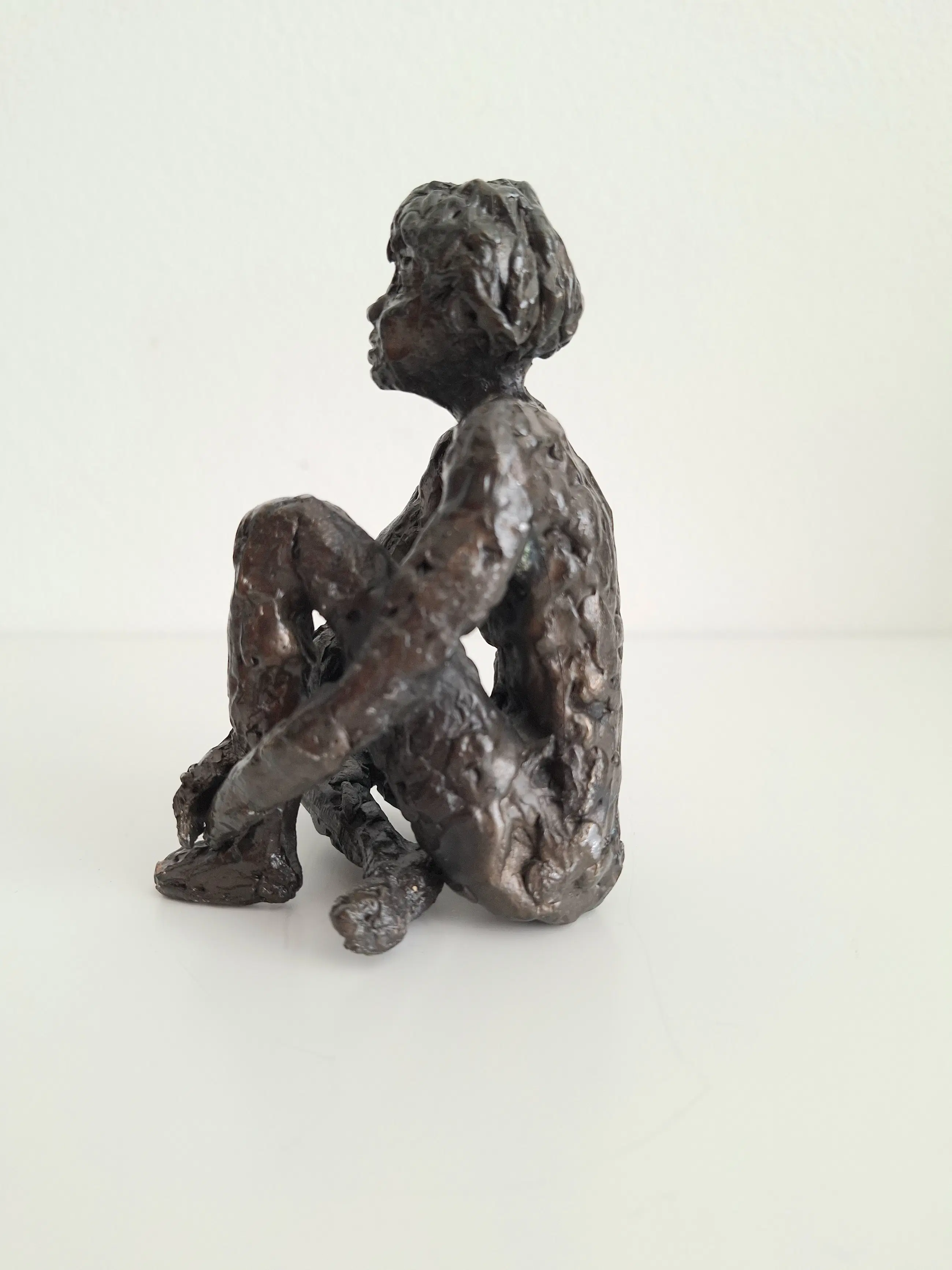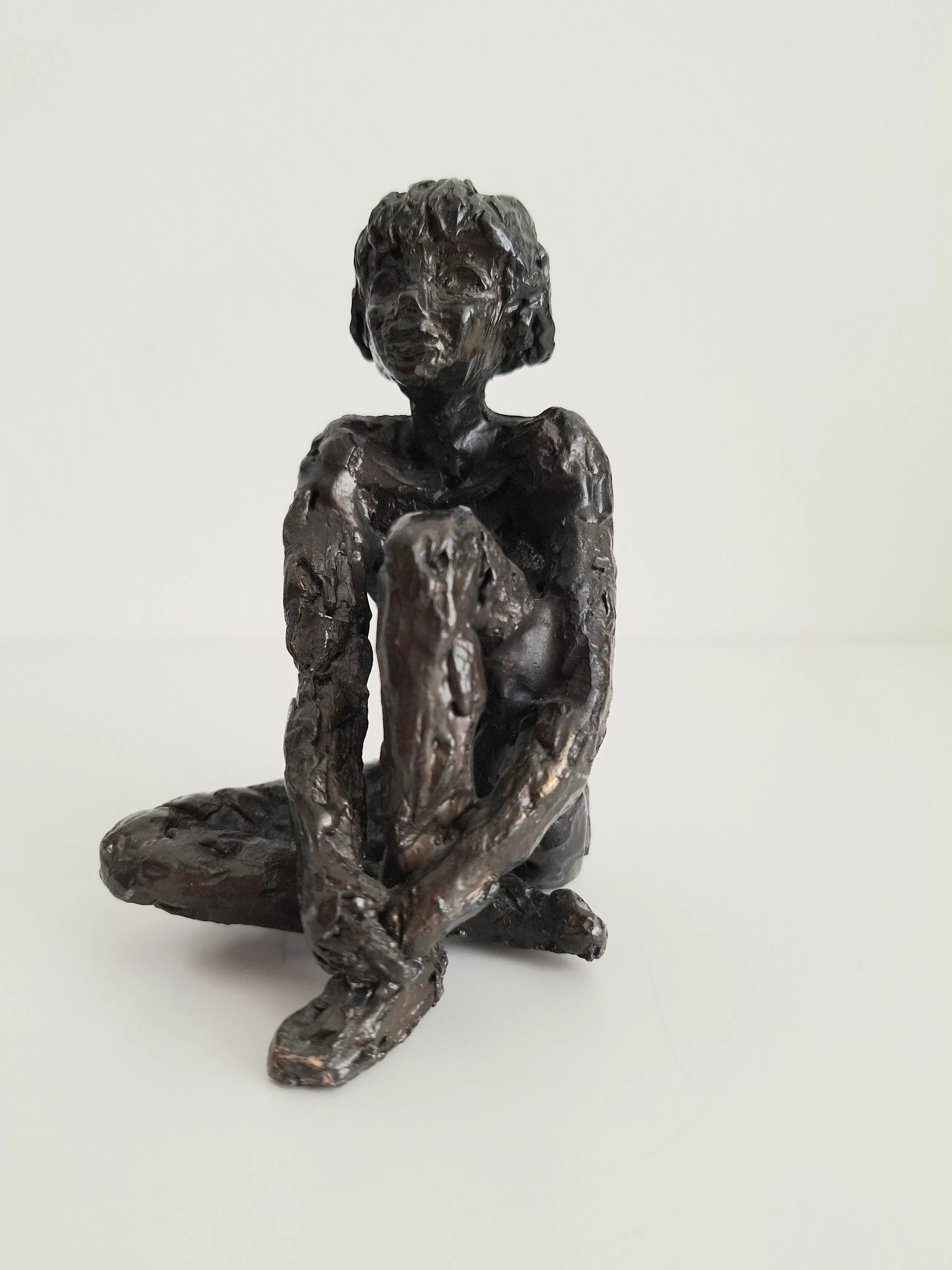 Zeer fraai en gedetailleerd vormgegeven bronzen sculptuur van een mijmerend meisje, zittend op de grond, in gedachten verzonken.
