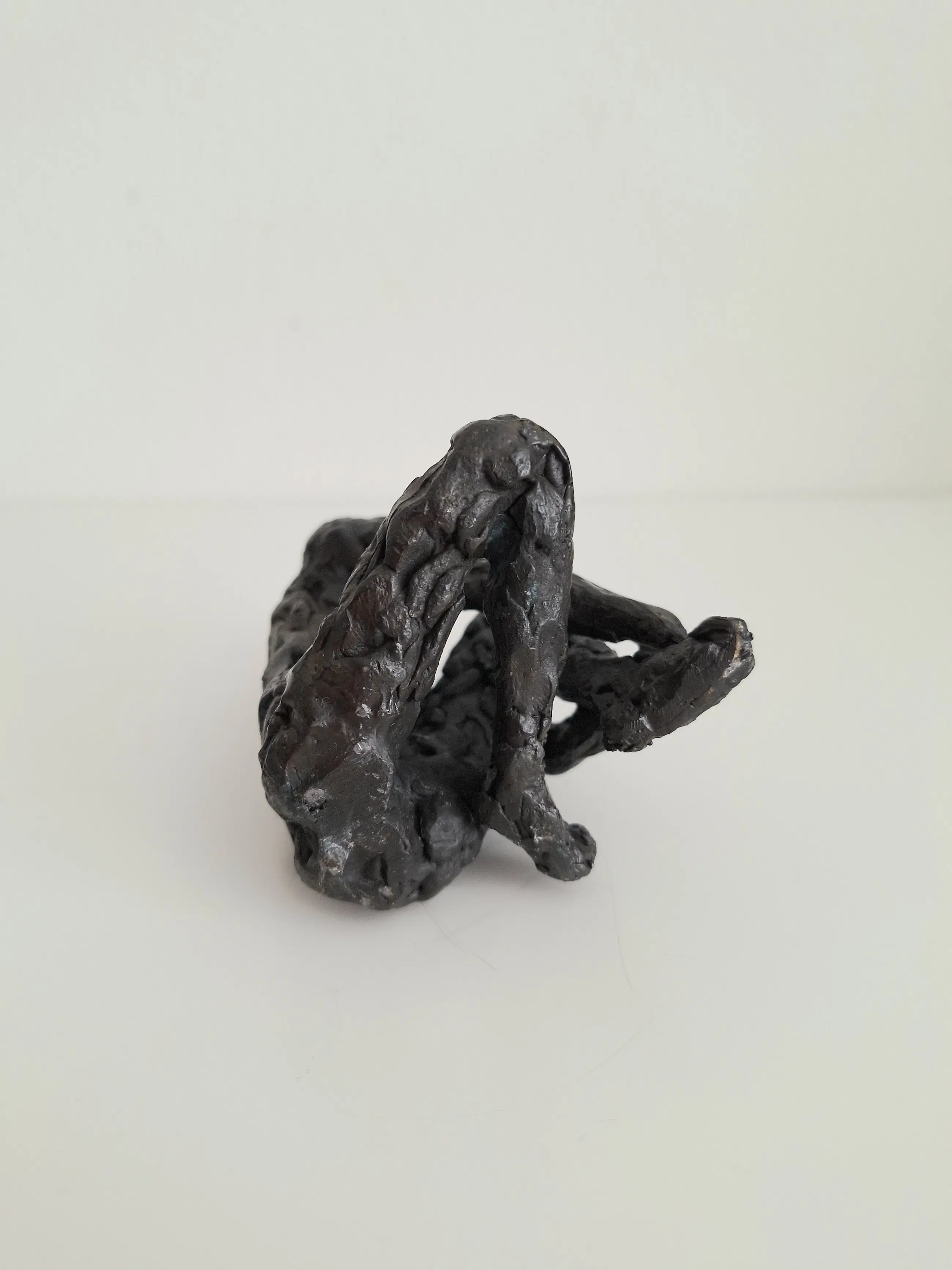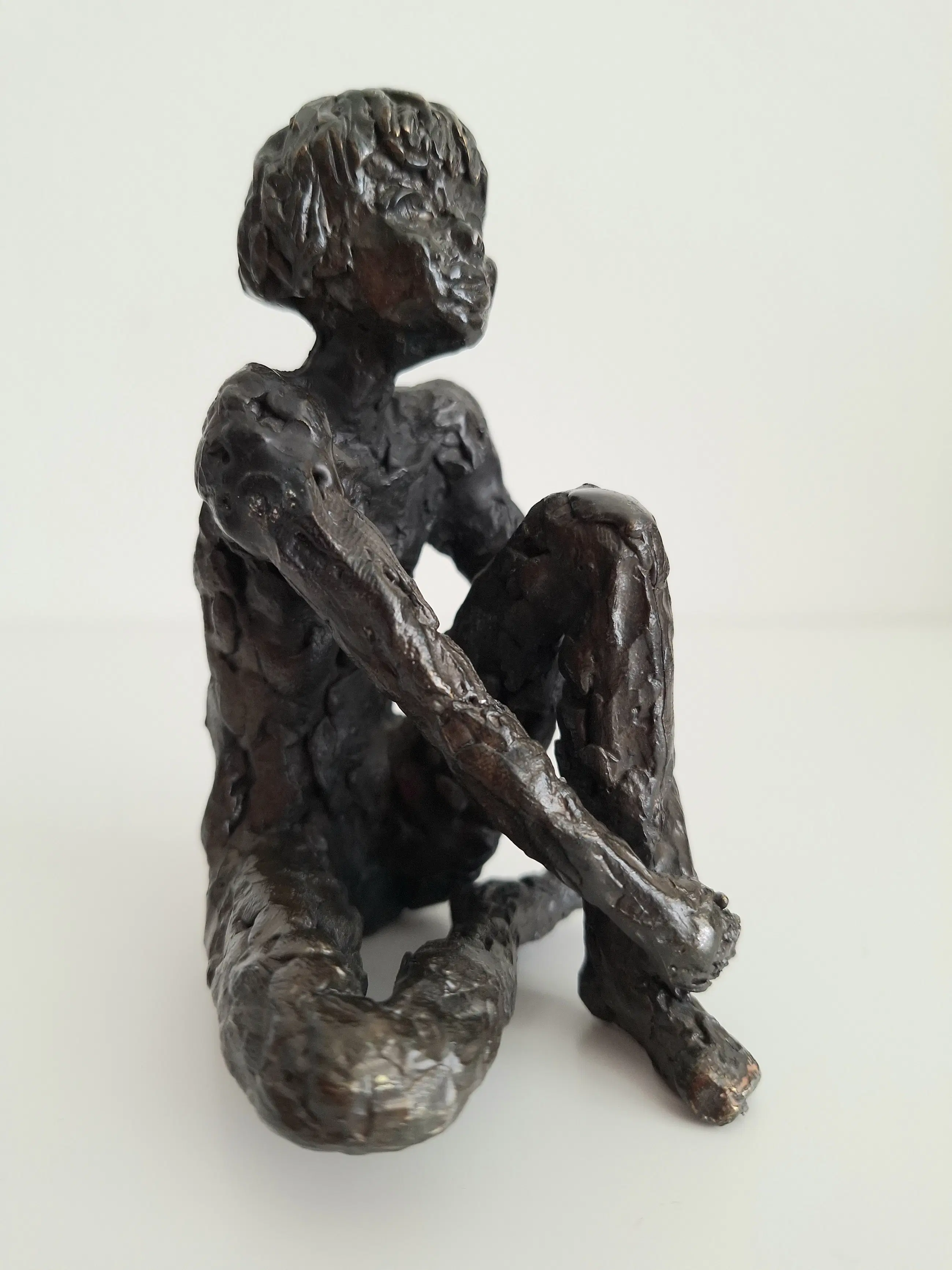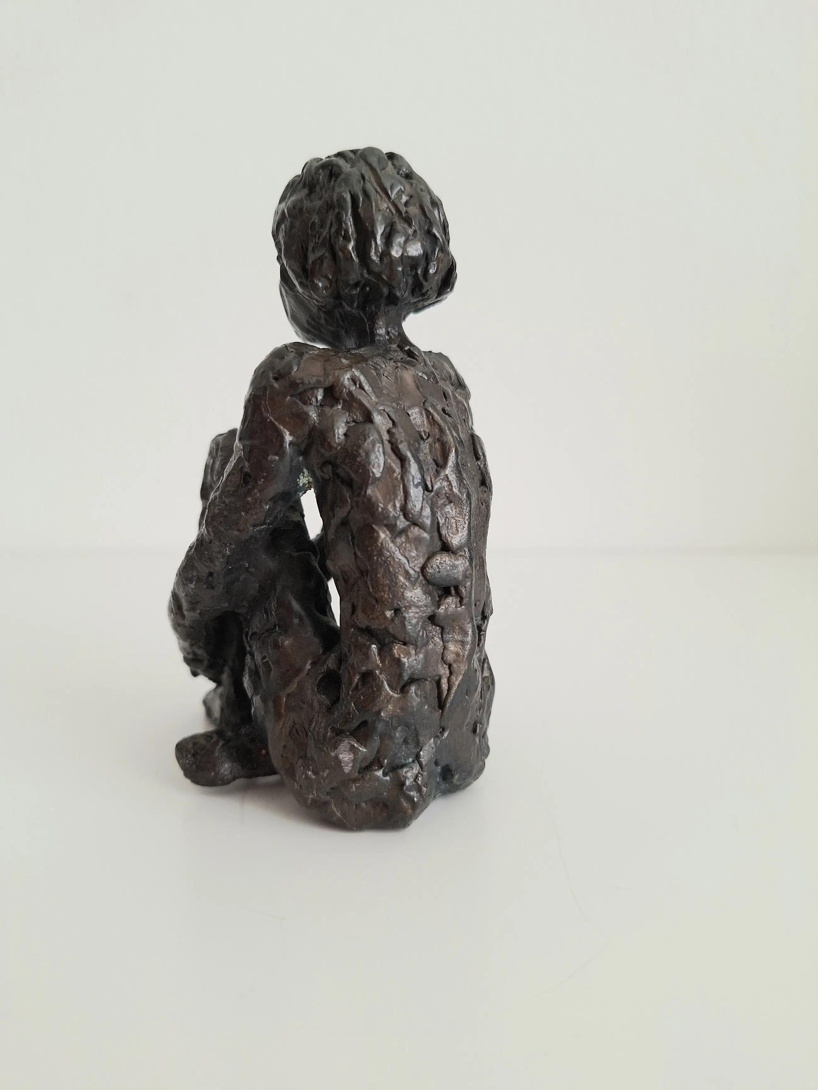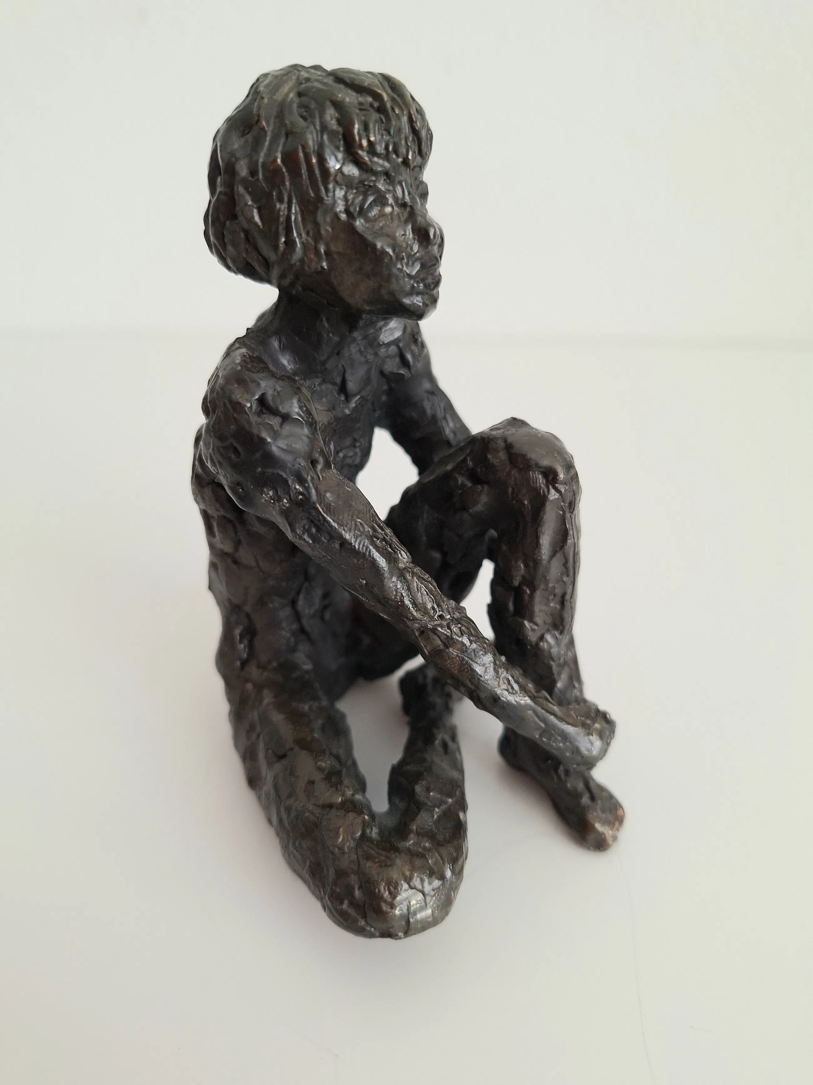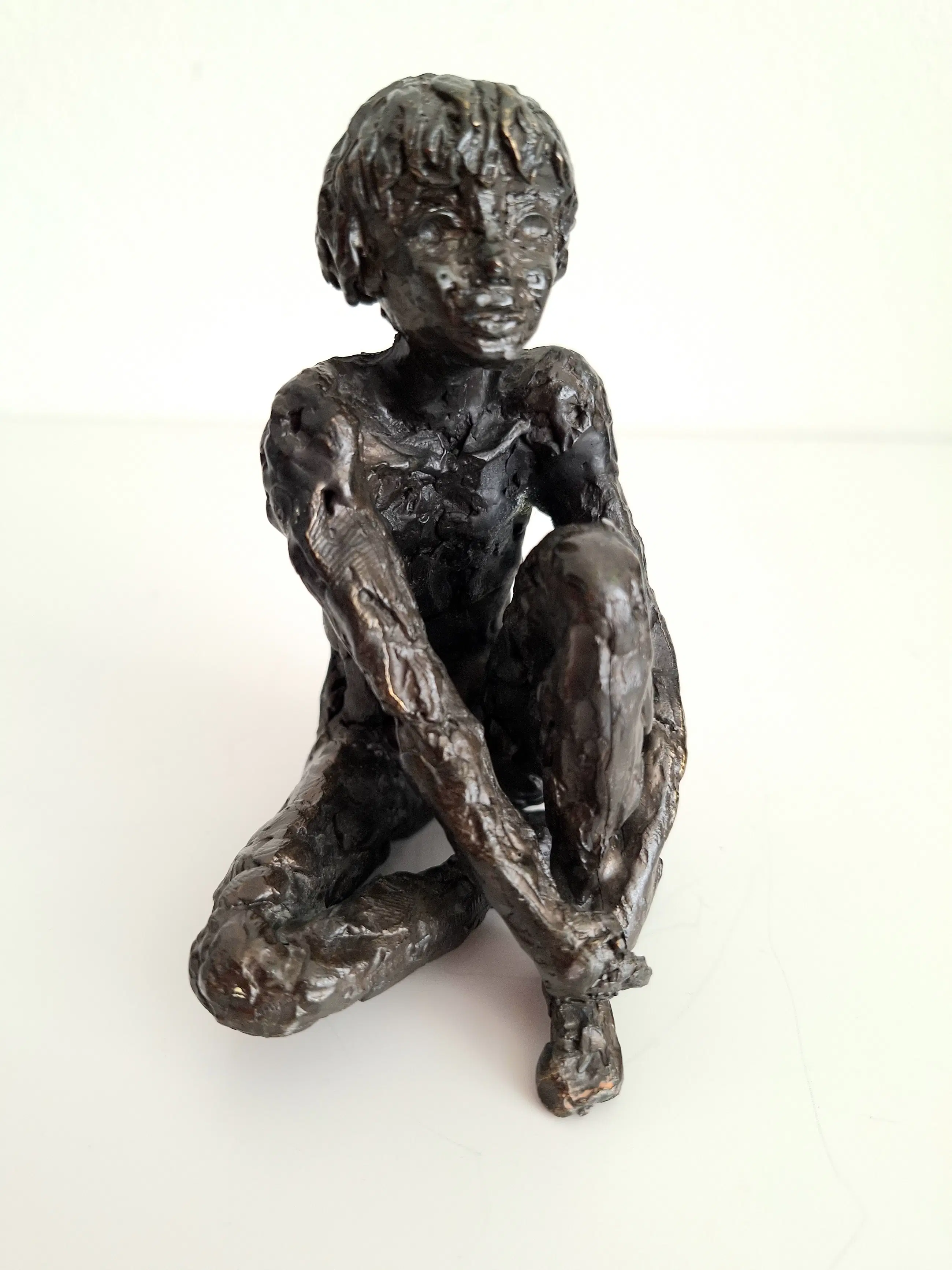 Zeer fraai en gedetailleerd vormgegeven bronzen sculptuur van een mijmerend meisje, zittend op de grond, in gedachten verzonken.