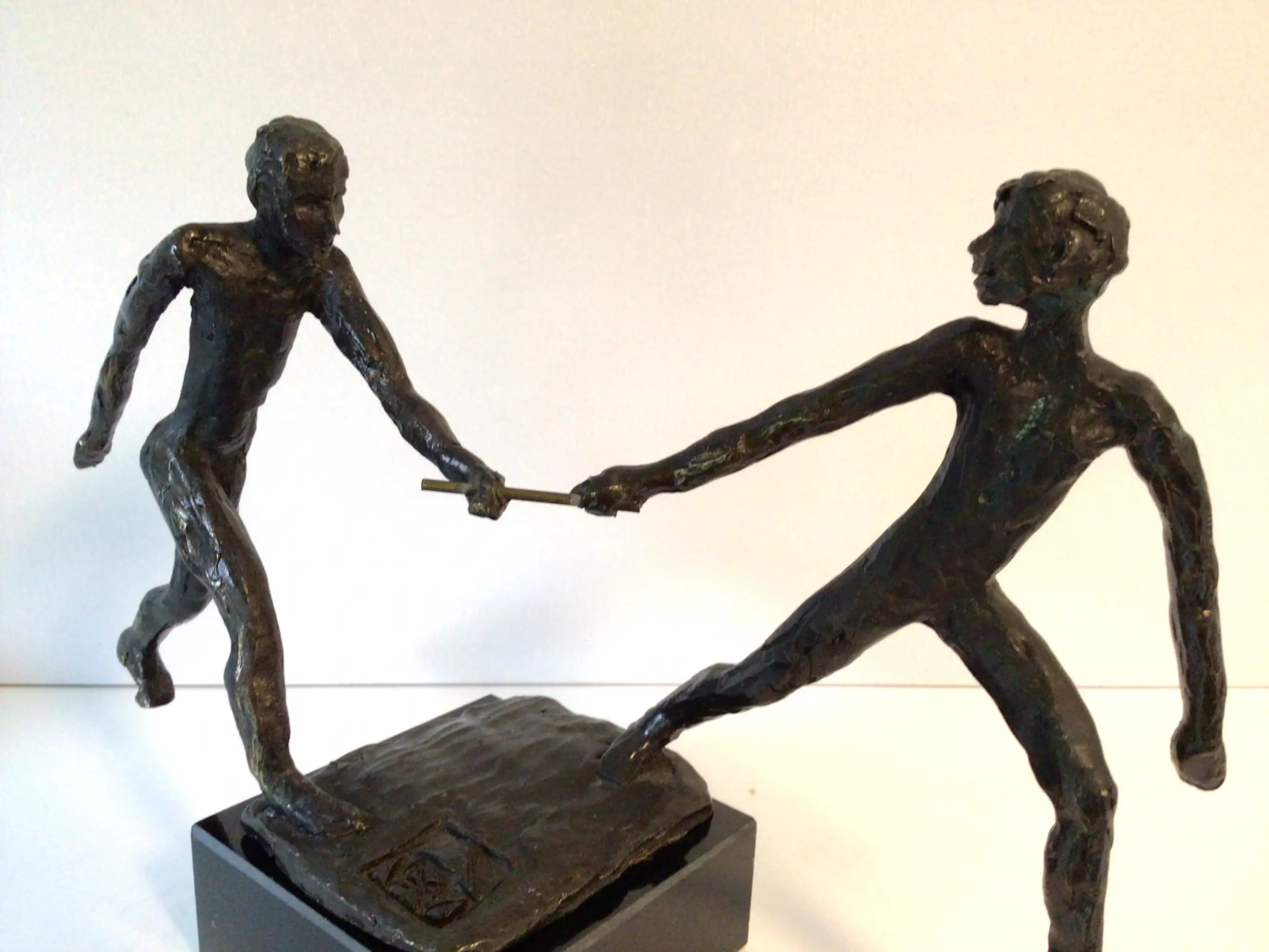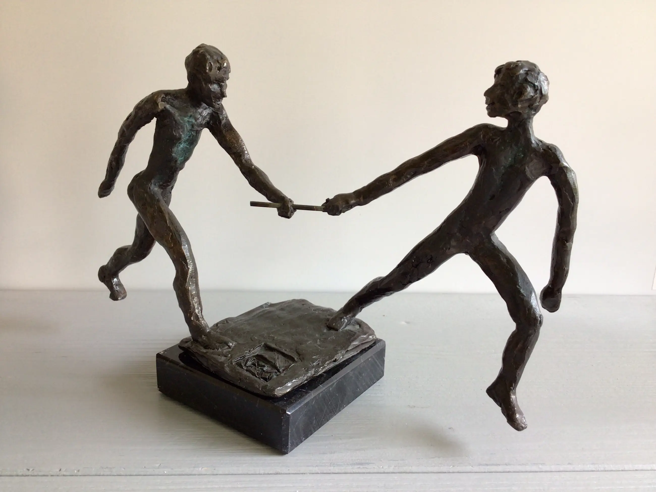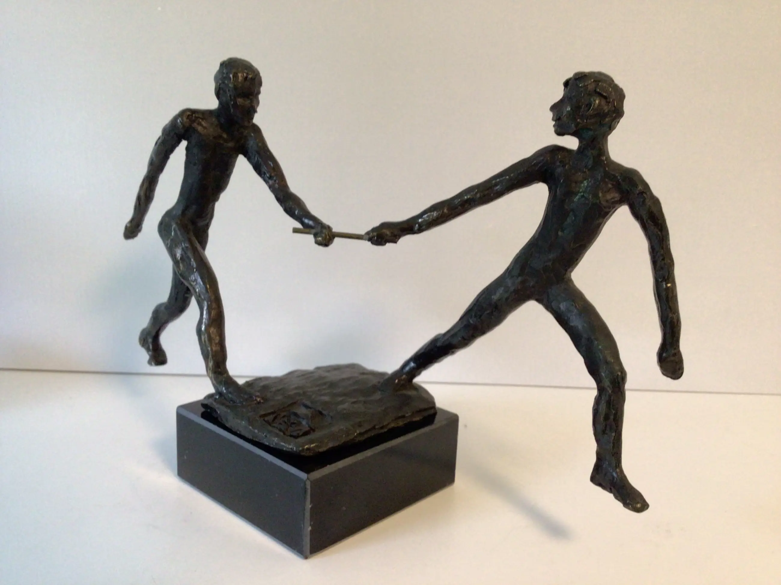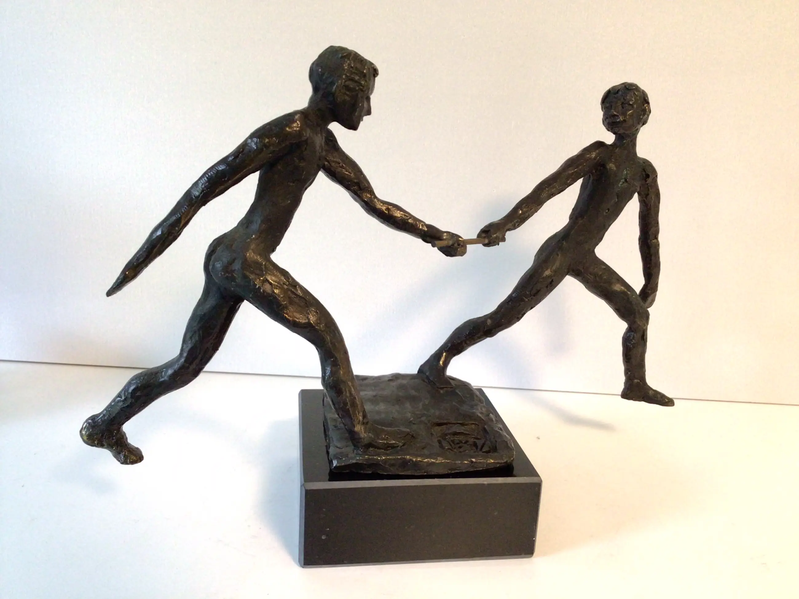 Zeer bijzonder en zeldzaam sculptuur van een twee mensfiguren die samen letterlijk het stokje over geven met als toepasselijke titel “ De Estafette lopers “ Kunstenares: Astrid Veldhuyzen- koppen Materiaal: brons op zwart marmeren sokkel Het beeld is op de voet gesigneerd: AV Het sculptuur verkeert in goede staat en wordt zorgvuldig verpakt verzonden.