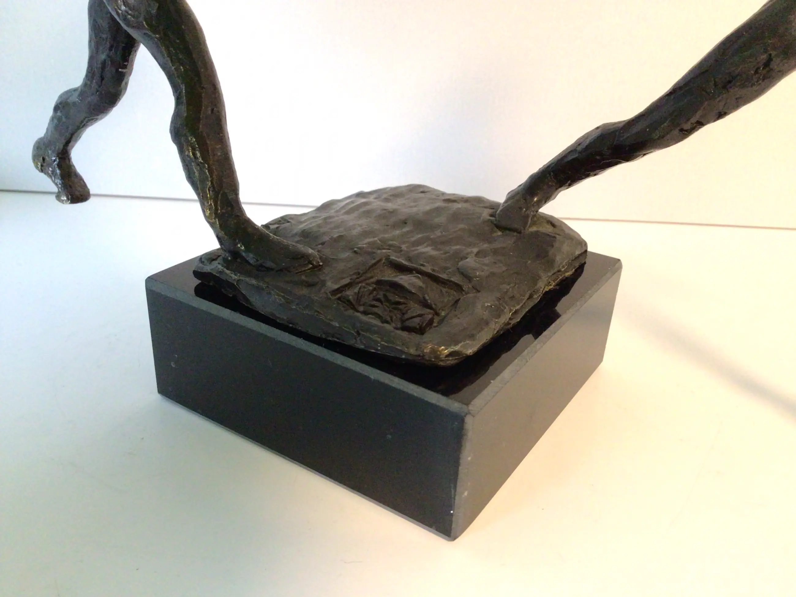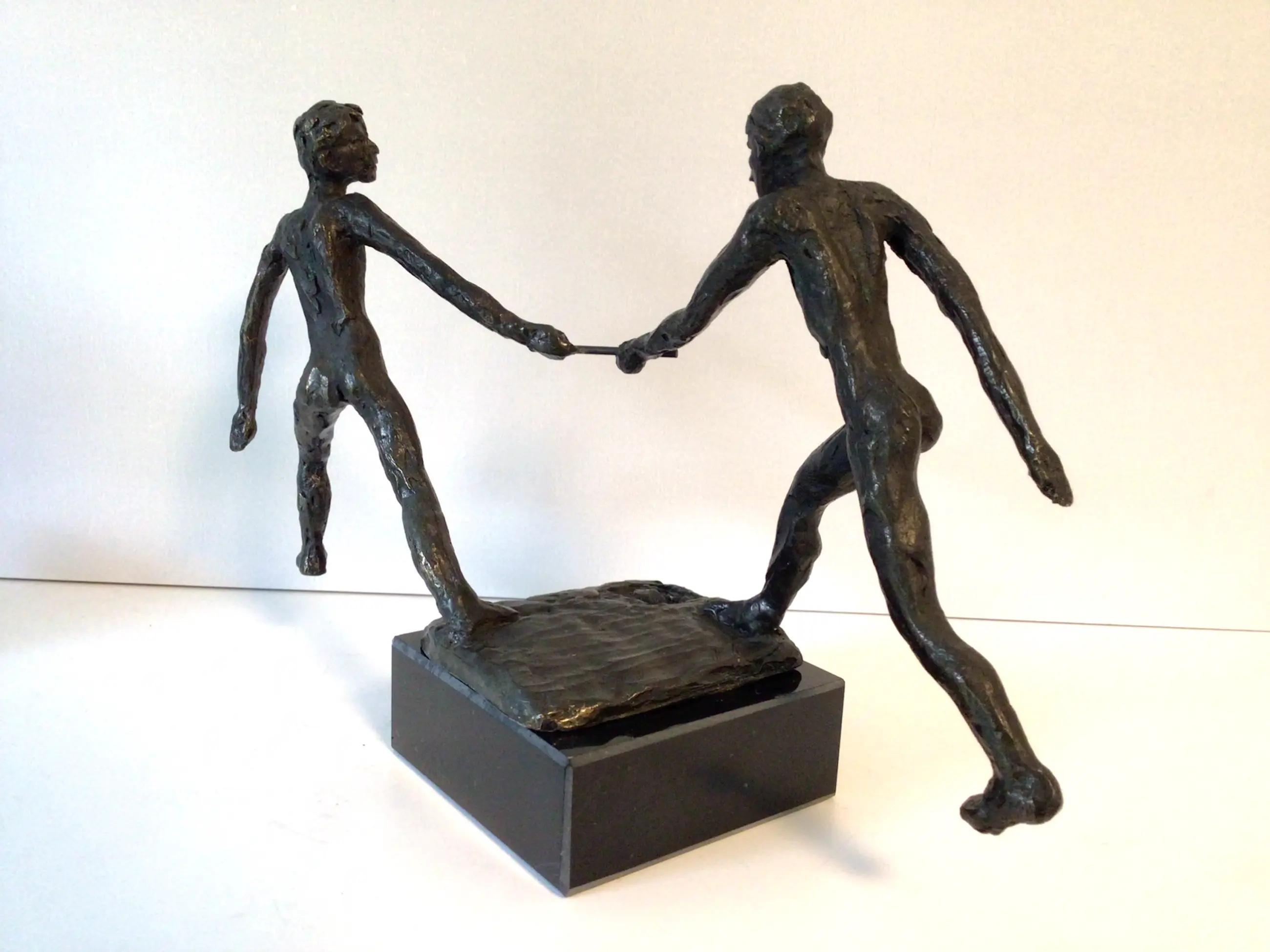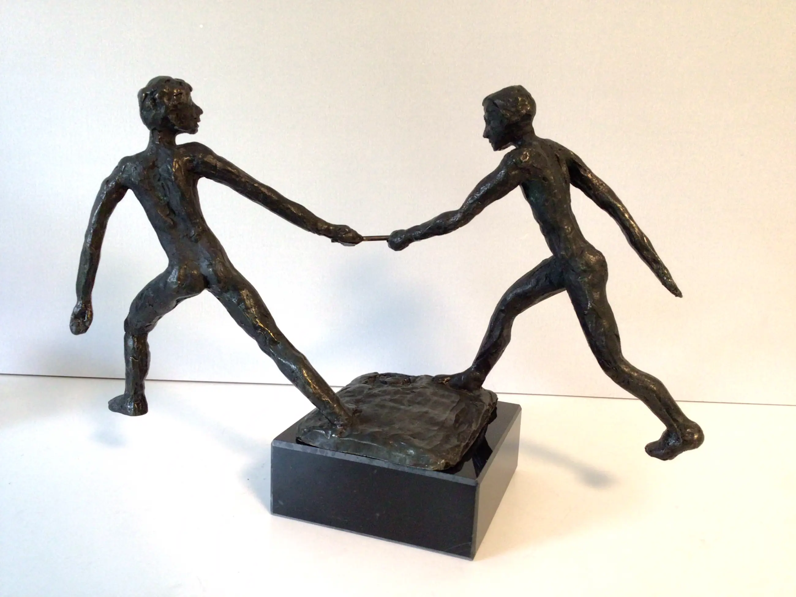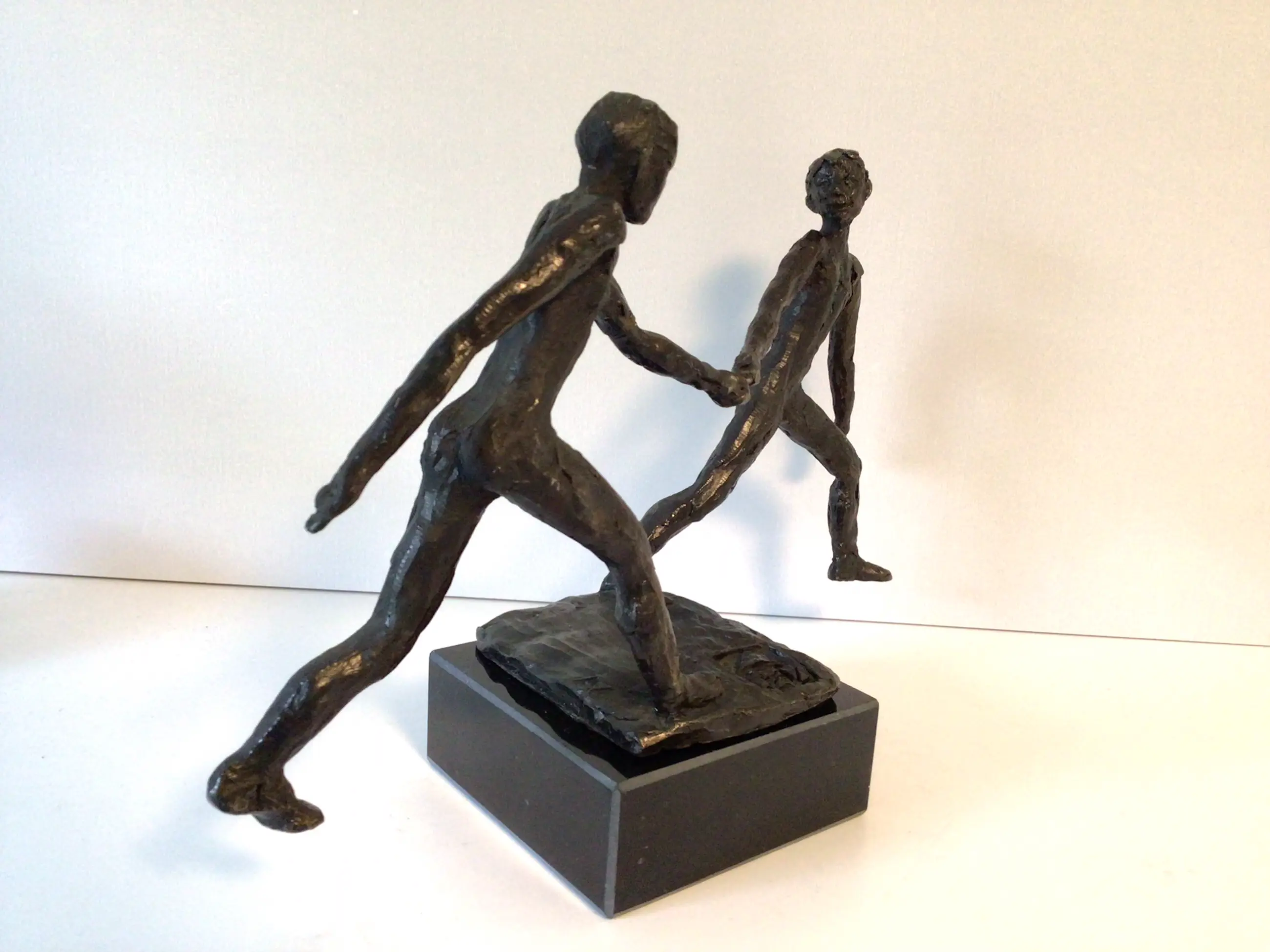 Zeer bijzonder en zeldzaam sculptuur van een twee mensfiguren die samen letterlijk het stokje over geven met als toepasselijke titel “ De Estafette lopers “ Kunstenares: Astrid Veldhuyzen- koppen Materiaal: brons op zwart marmeren sokkel Het beeld is op de voet gesigneerd: AV Het sculptuur verkeert in goede staat en wordt zorgvuldig verpakt verzonden.
