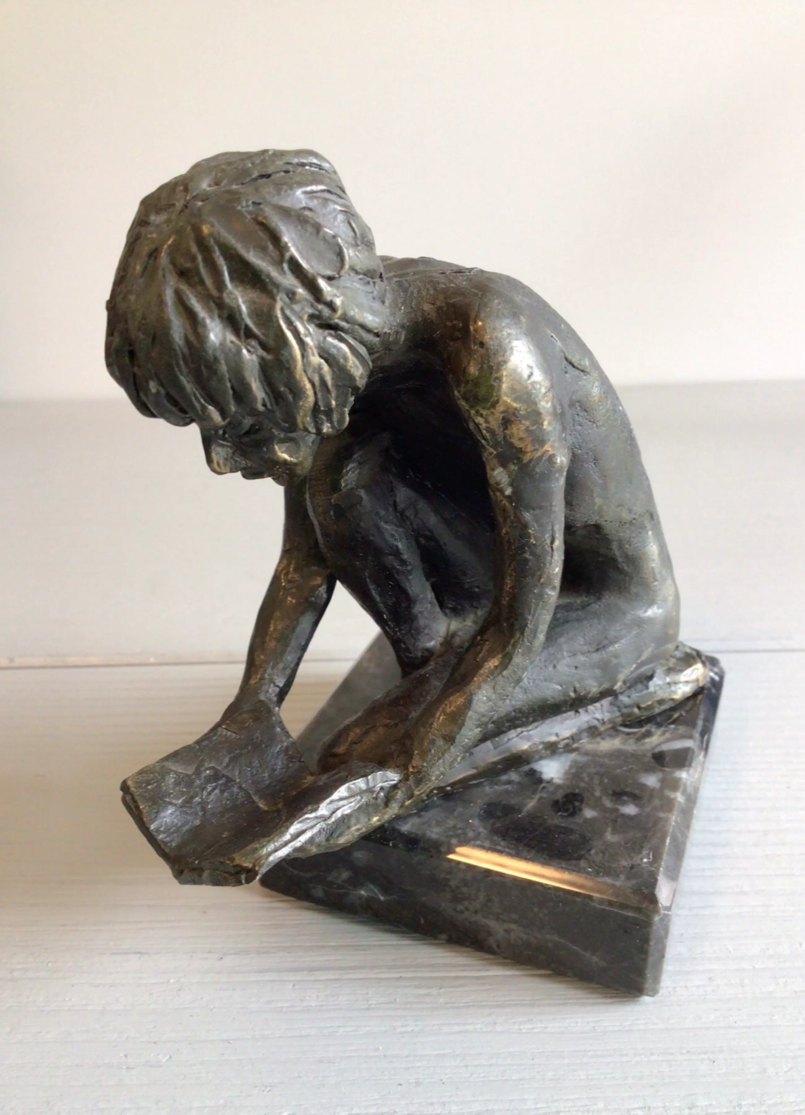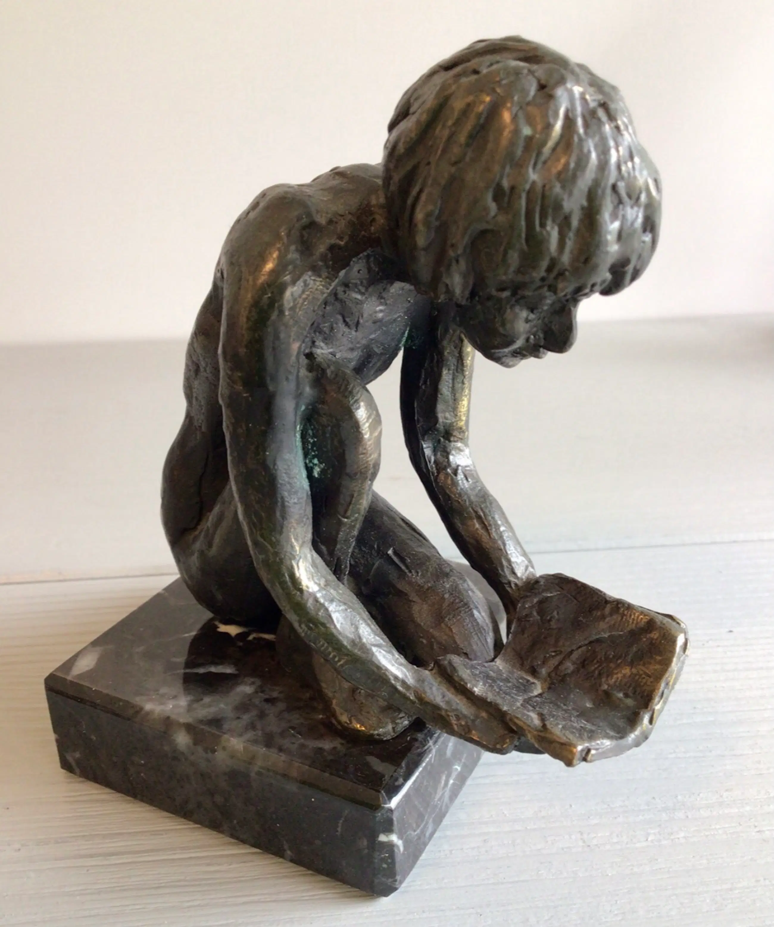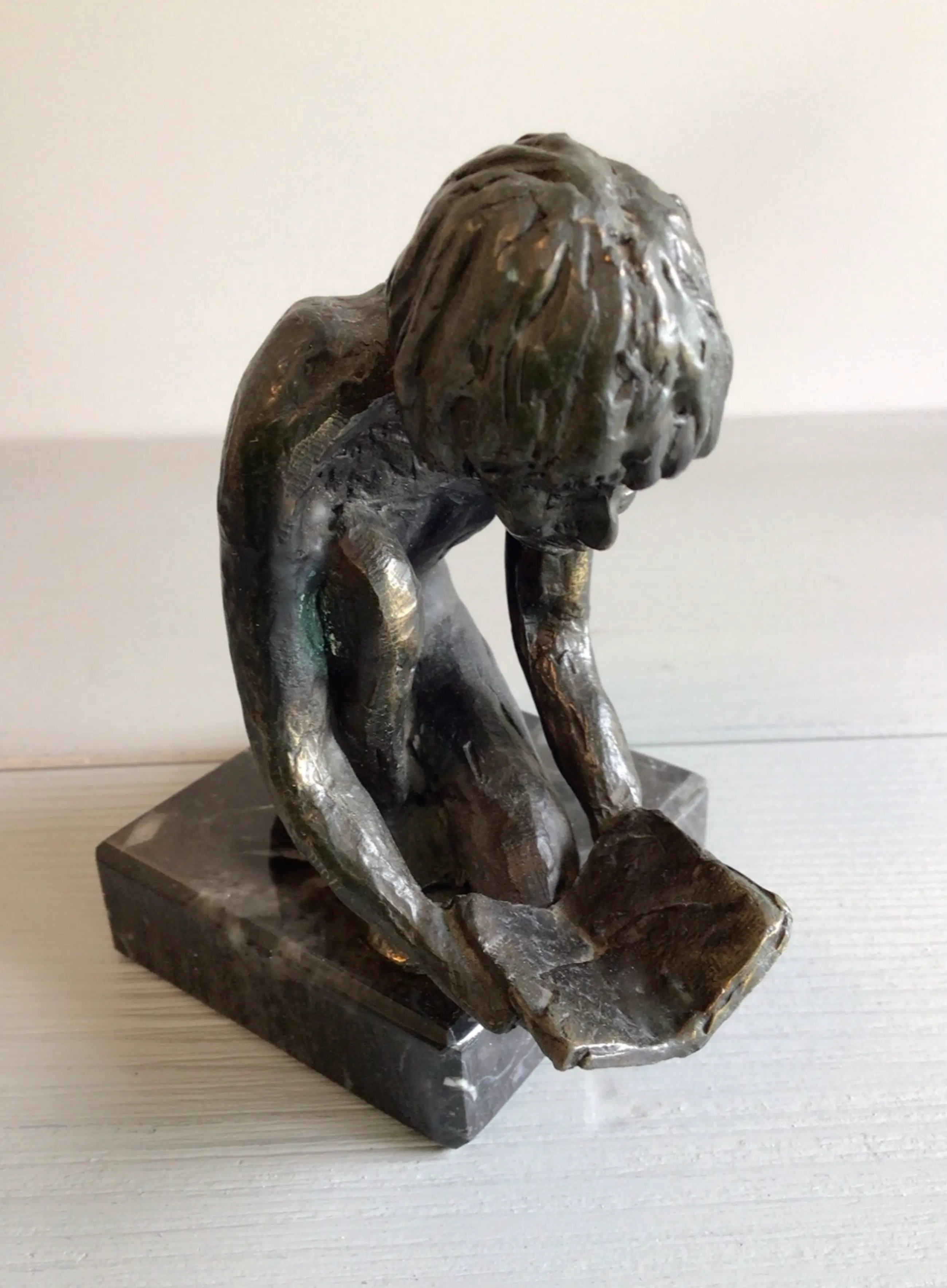 Zeer fraai en gedetailleerd vormgegeven sculptuur van een kind dat geknield vol aandacht een boek leest Titel “ De ontdekkingsreis “ Kunstenares: Astrid Veldhuyzen koppen Het beeld is gesigneerd: AV Hoogte : 12 cm. ( inclusief sokkel) Materiaal: brons Het sculptuur staat los op de sokkel, zodat u zelf kunt bepalen of u deze wilt gebruiken of niet. Het beeld verkeert in goede staat en wordt zorgvuldig verpakt verzonden