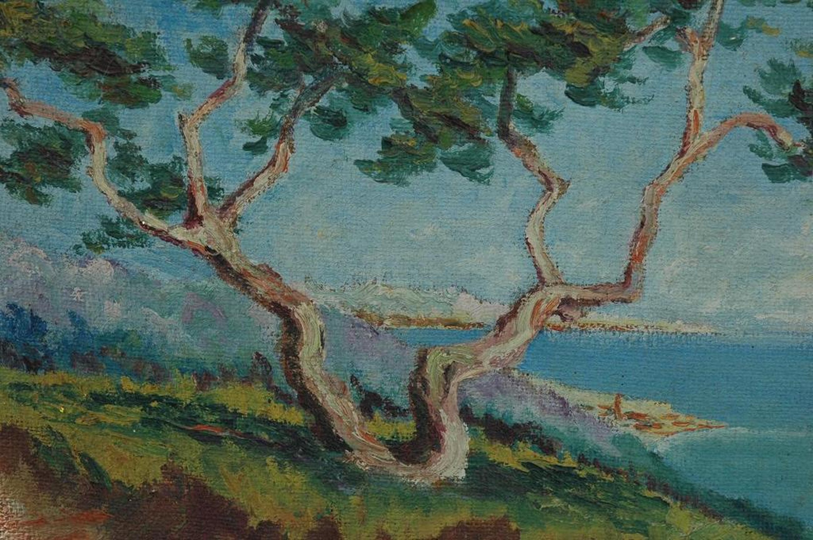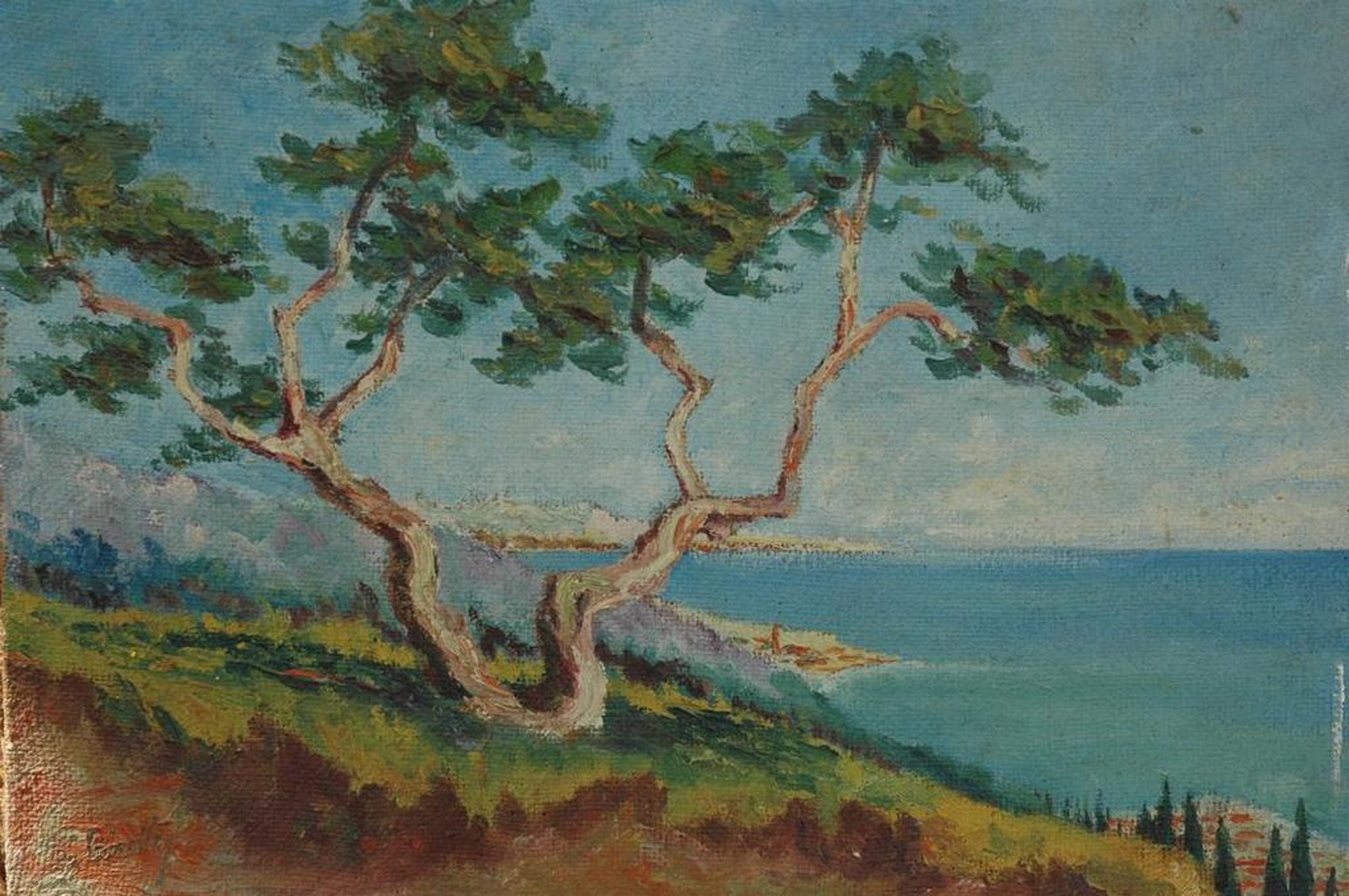Bijzonder olieverf schilderij van de engelse kunstenaar Aubrey Beardsley rond 1890 met een doorkijkje naar de zee. Het is geschilderd in een impressionistische stijl en is lo gesigneeerd.