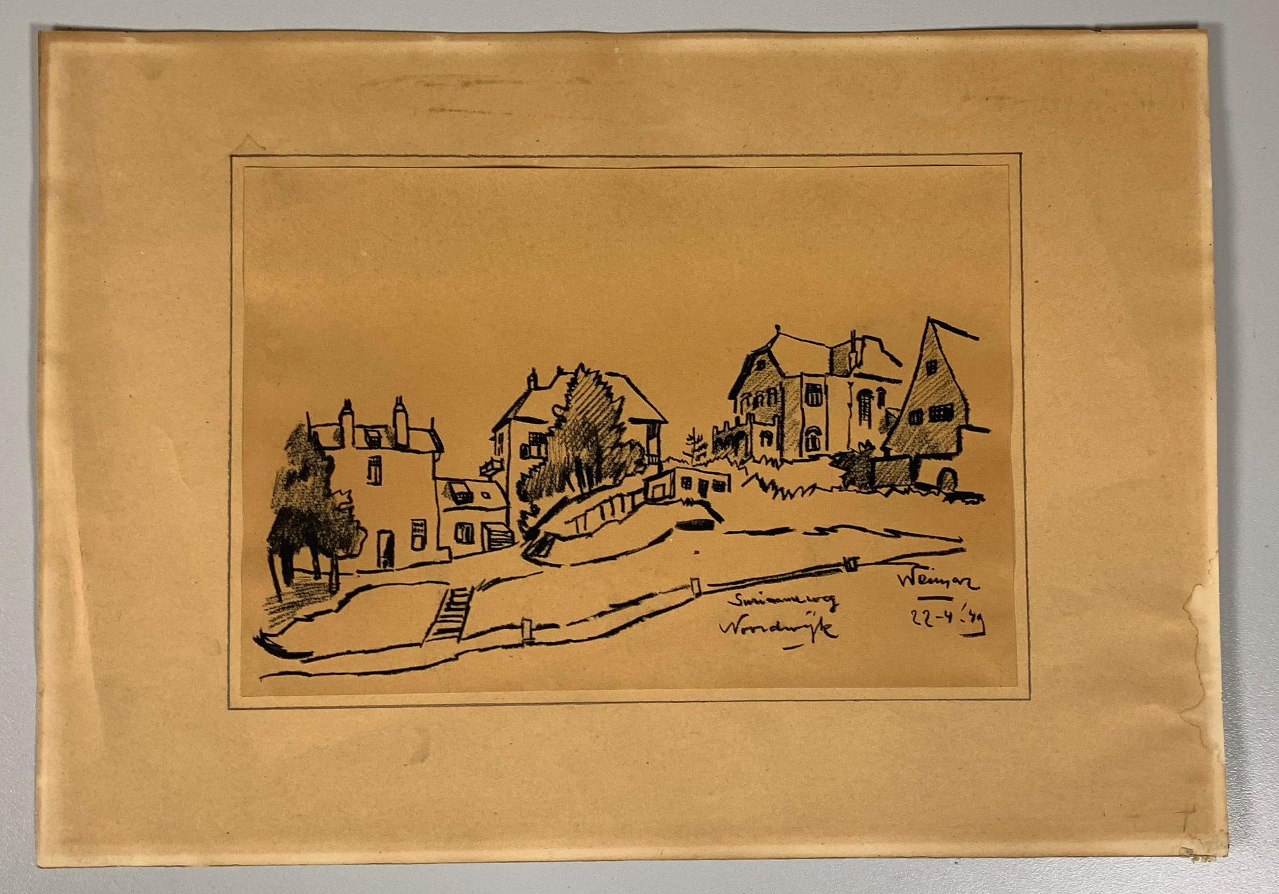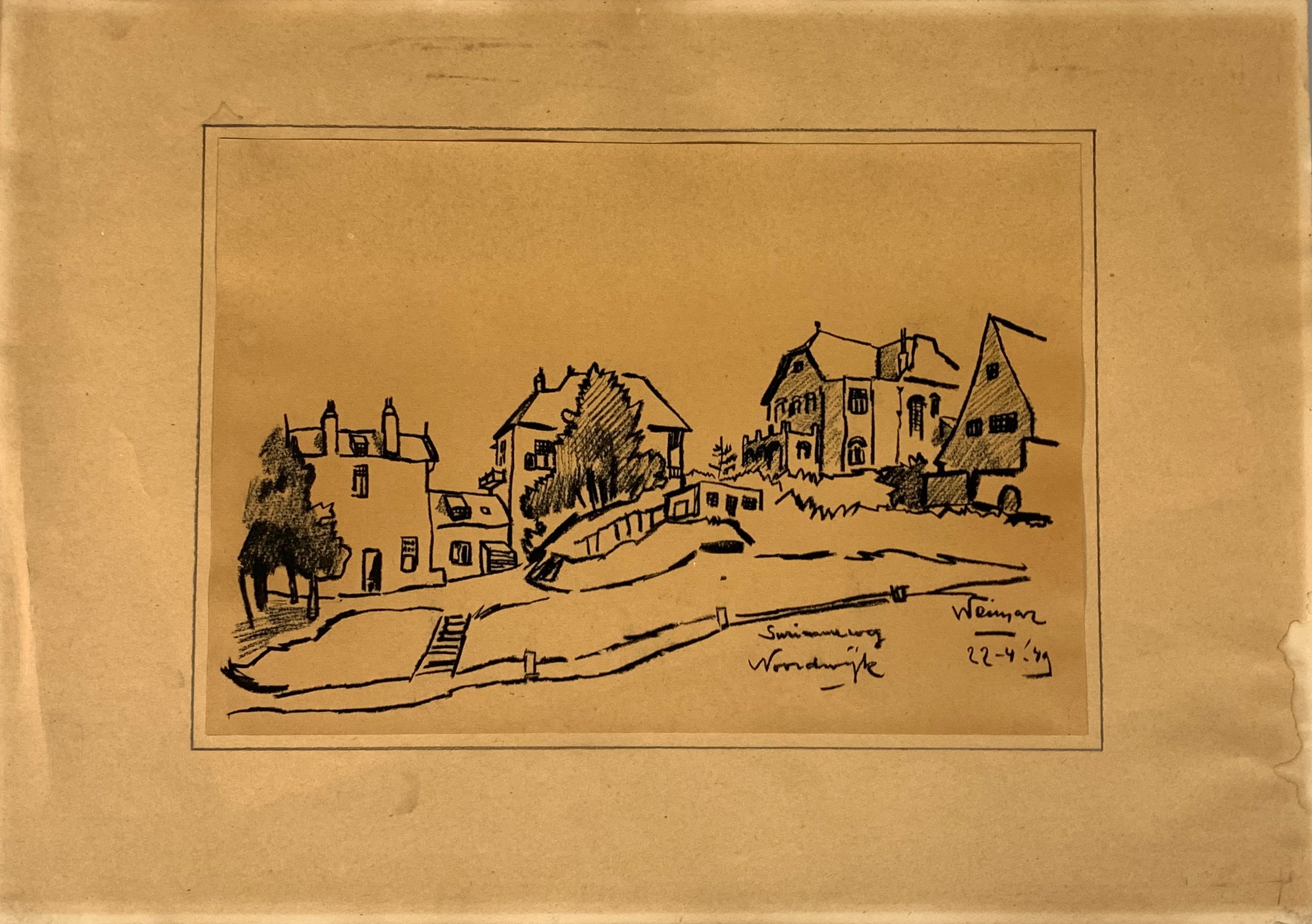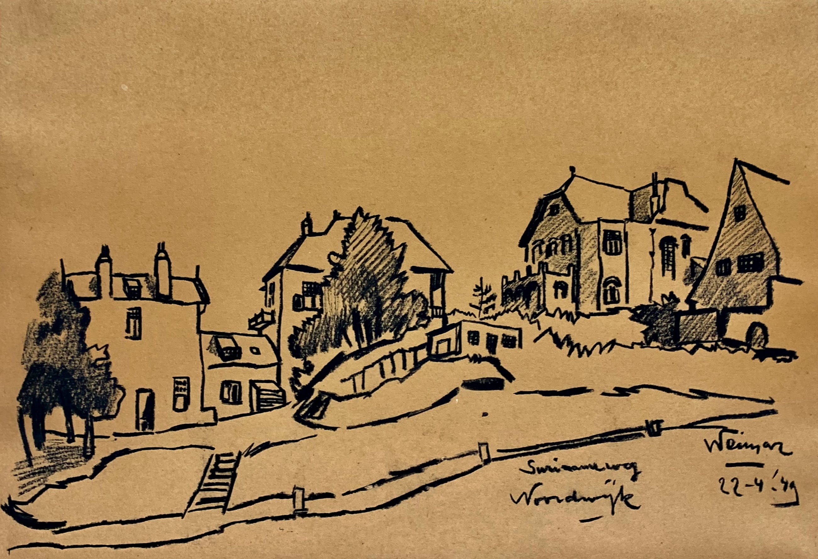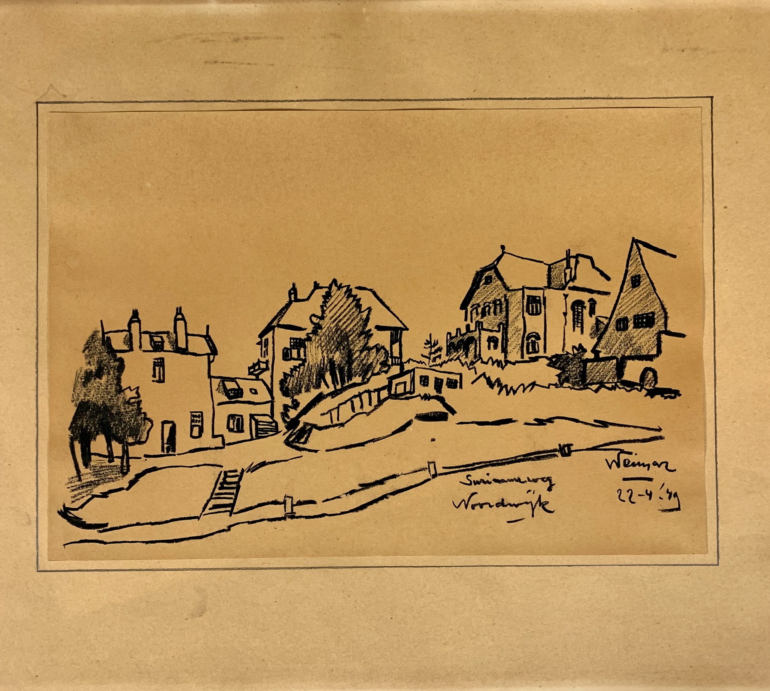 Conditie: tekening zeer goed. Tekening is geplakt op passe-partout deze heeft vlekjes, zie foto's. Gedateerd 22-4-'49. Weet niet zeker of het pen inkt, penseel inkt of potlood is vervaardigd. Wordt zorgvuldig verpakt en verzekerd verzonden.
