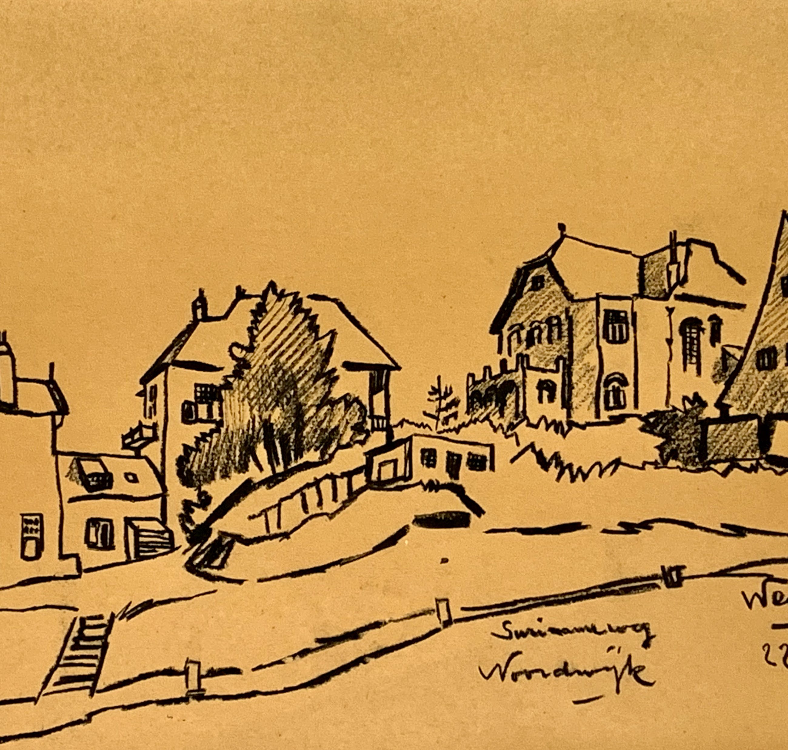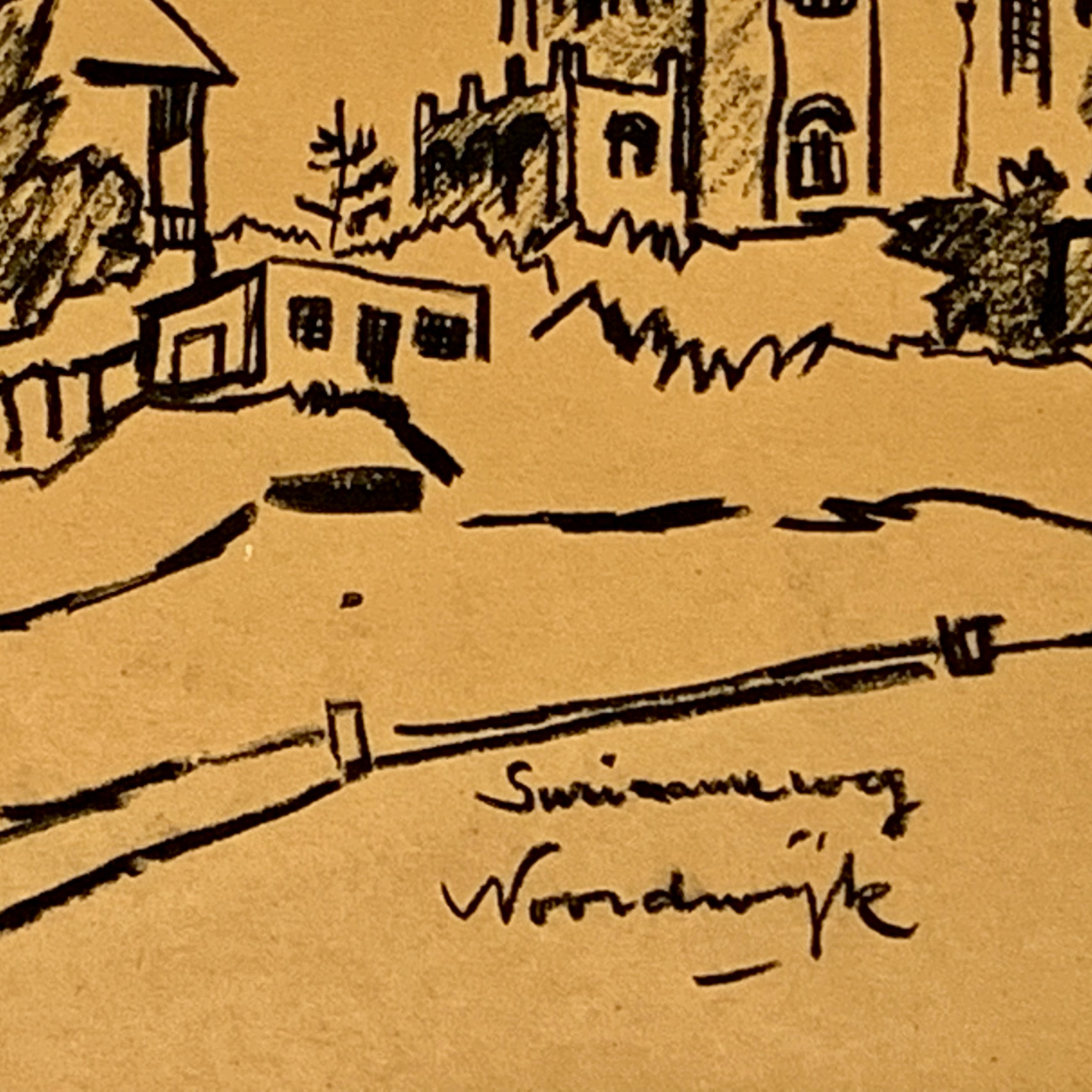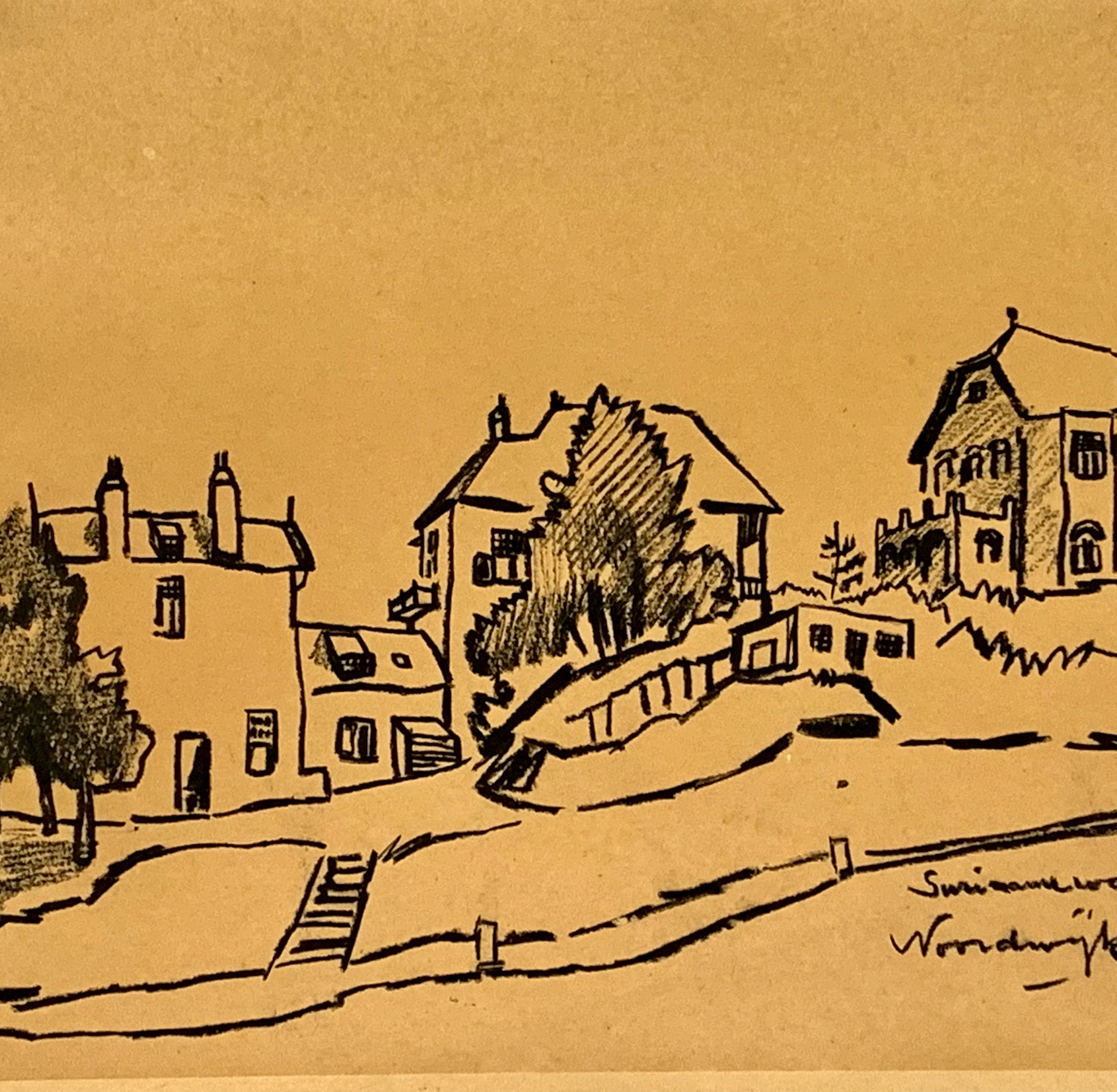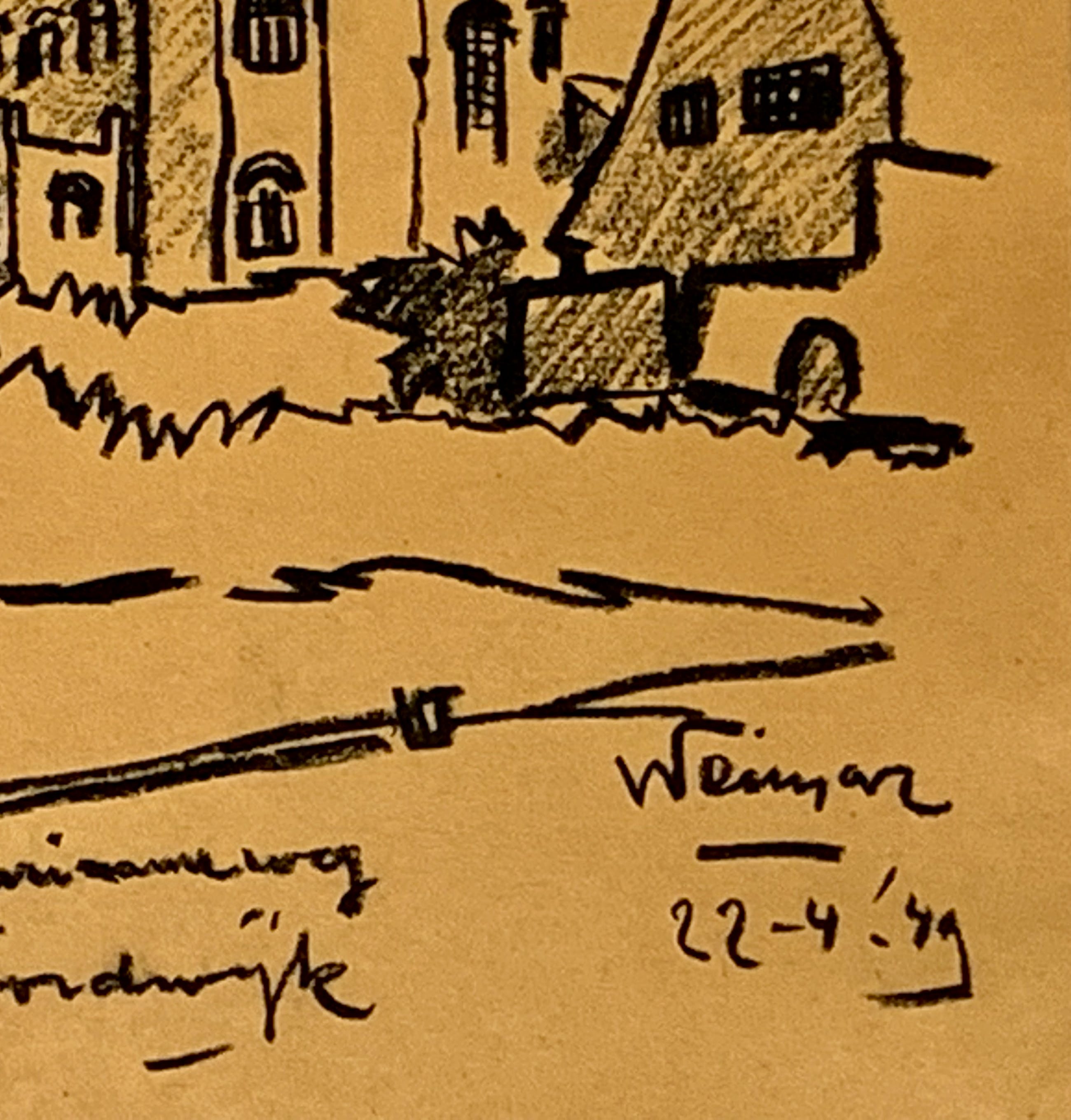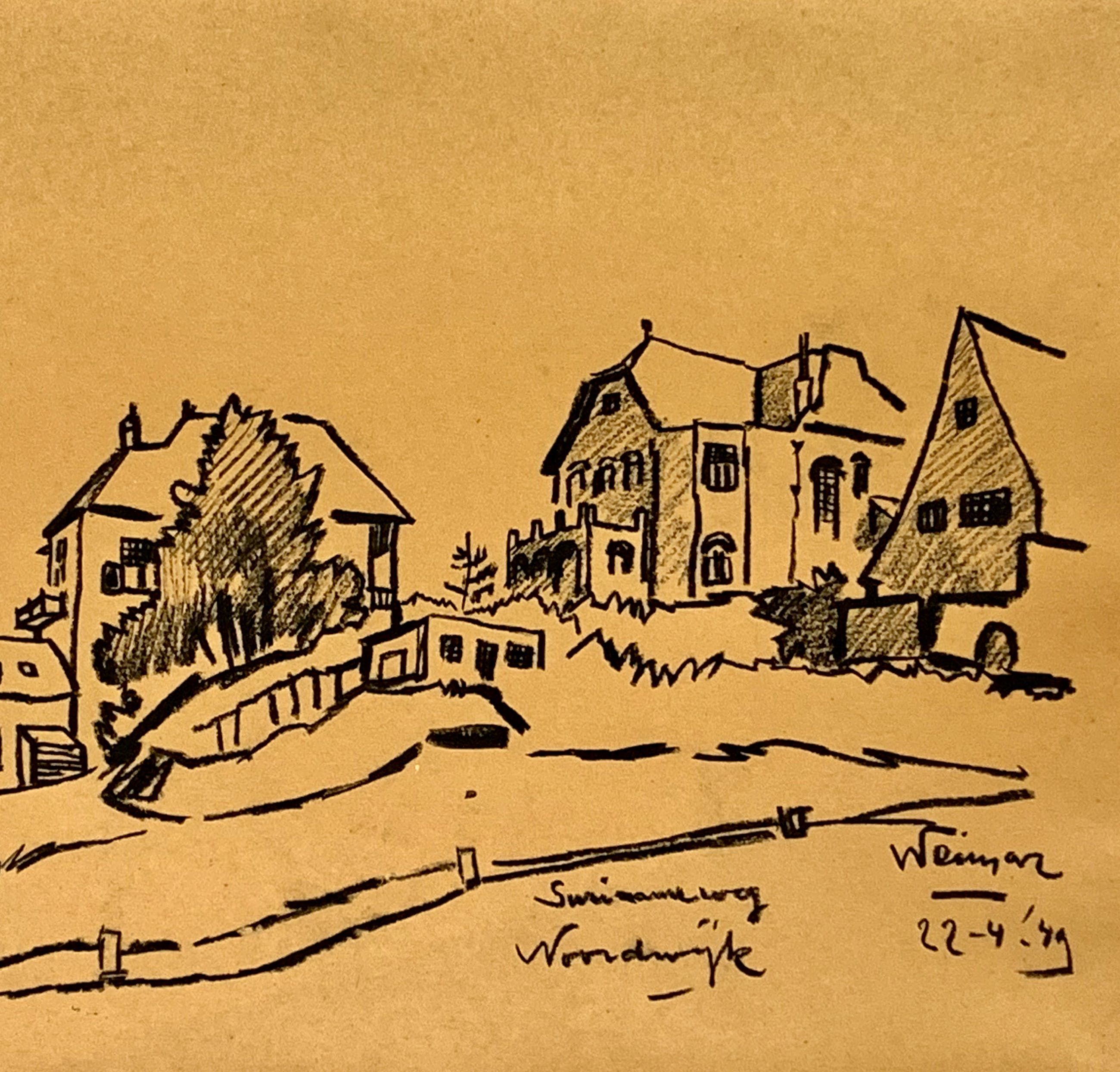 Conditie: tekening zeer goed. Tekening is geplakt op passe-partout deze heeft vlekjes, zie foto's. Gedateerd 22-4-'49. Weet niet zeker of het pen inkt, penseel inkt of potlood is vervaardigd. Wordt zorgvuldig verpakt en verzekerd verzonden.