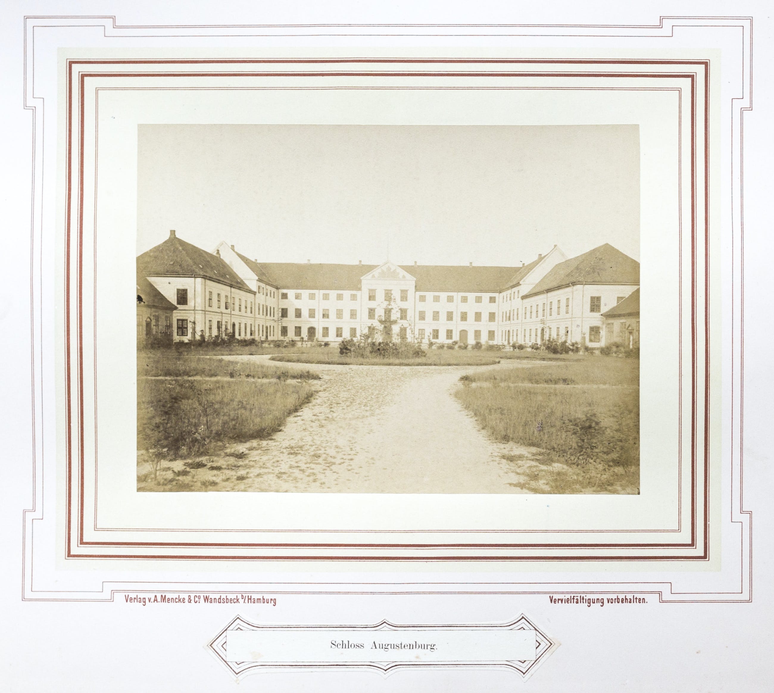 Elk gerold op karton. Een kleiplaat gedrukt op het karton en randen rondom de foto, de naam van de uitgever ("A. Mencke & Co., Wandsbeck b. Hamburg") en - eveneens gedrukt en gemonteerd - een afbeelding binnen een andere rand: "Augustenburg Kasteel".