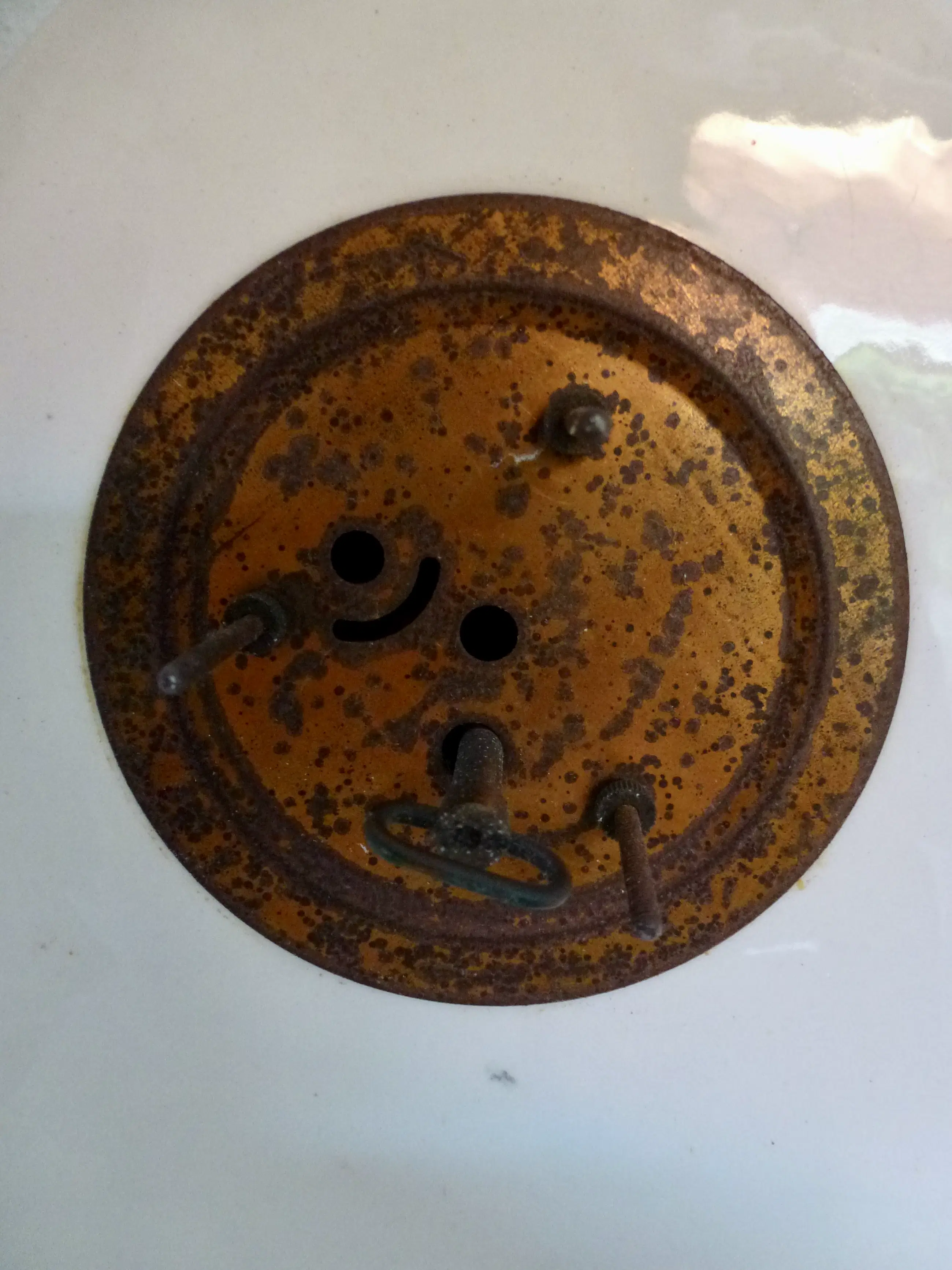 De klok werkt niet, sporen van oxidatie op het messing aan de achterkant.