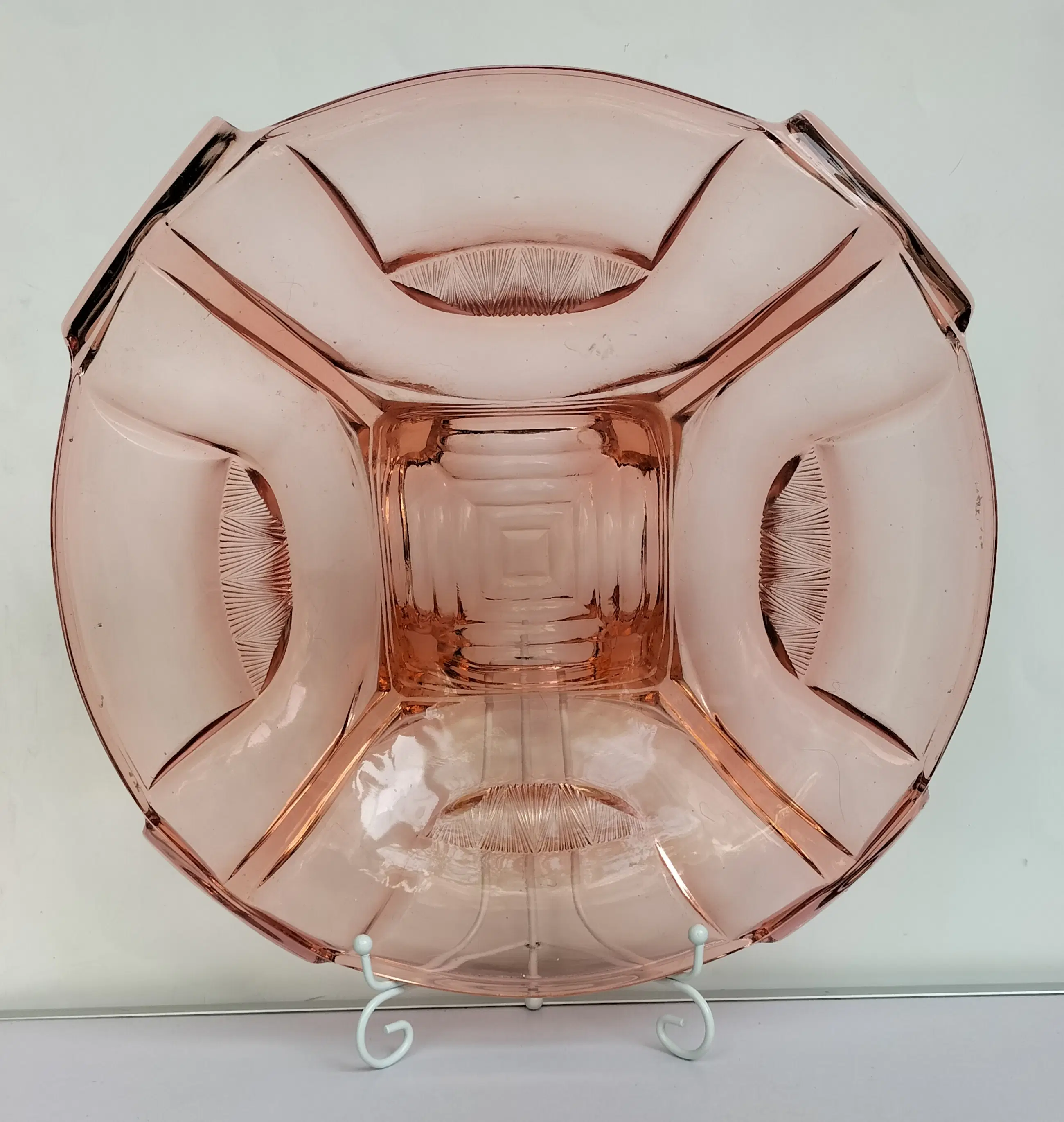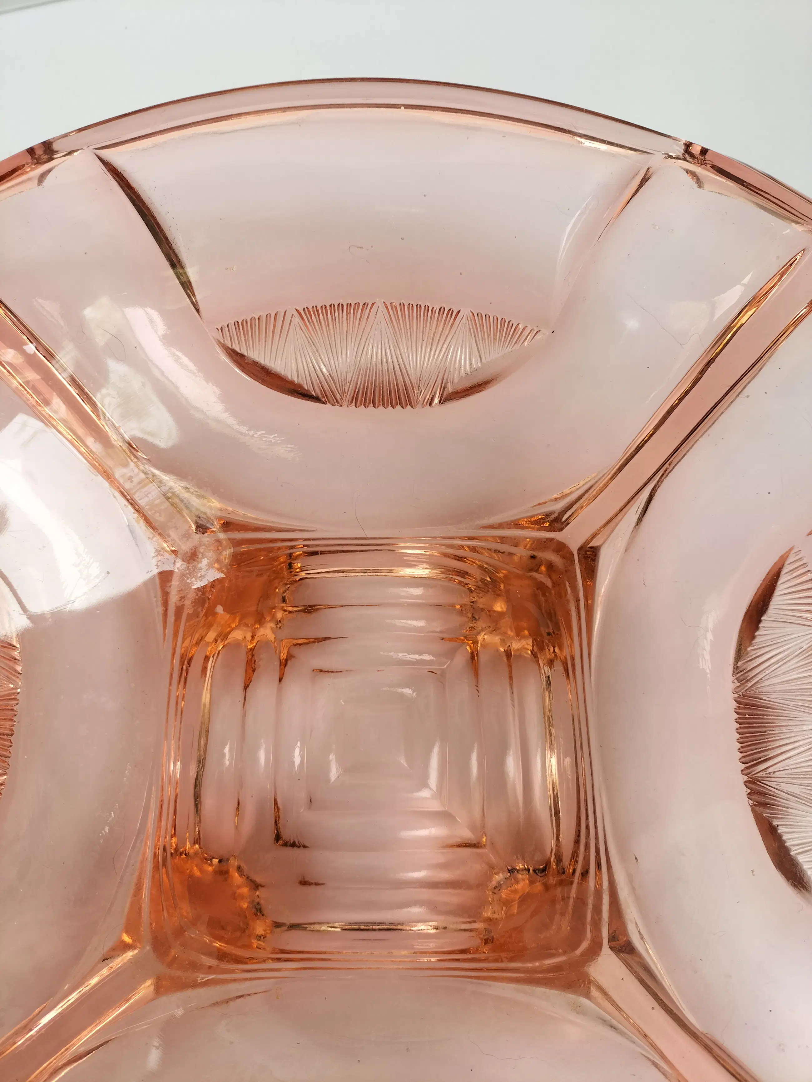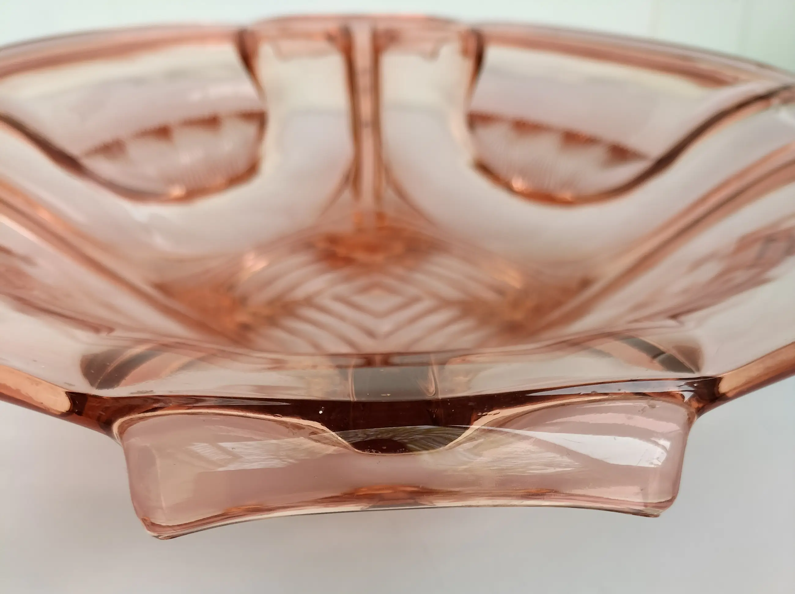 Mooie grote en zware schaal van dik roze persglas van Walther Glas uit de jaren 30/40. De schaal staat genoemd in de Walther Glas catalogus uit 1936 onder nr. 43840. De schaal heeft een vierkante vorm met afgeronde hoeken, vier handgrepen en vier voetjes, en heeft een apart design met bijzondere details. Afgezien van wat slijtage/kleine chips aan. de voetjes (zie laatste foto) in prima staat zonder beschadigingen, chips of krassen met minimale gebruikssporen. Een bijzondere decoratieve en fraaie schaal, die natuurlijk met zorg verpakt en verzonden zal worden.