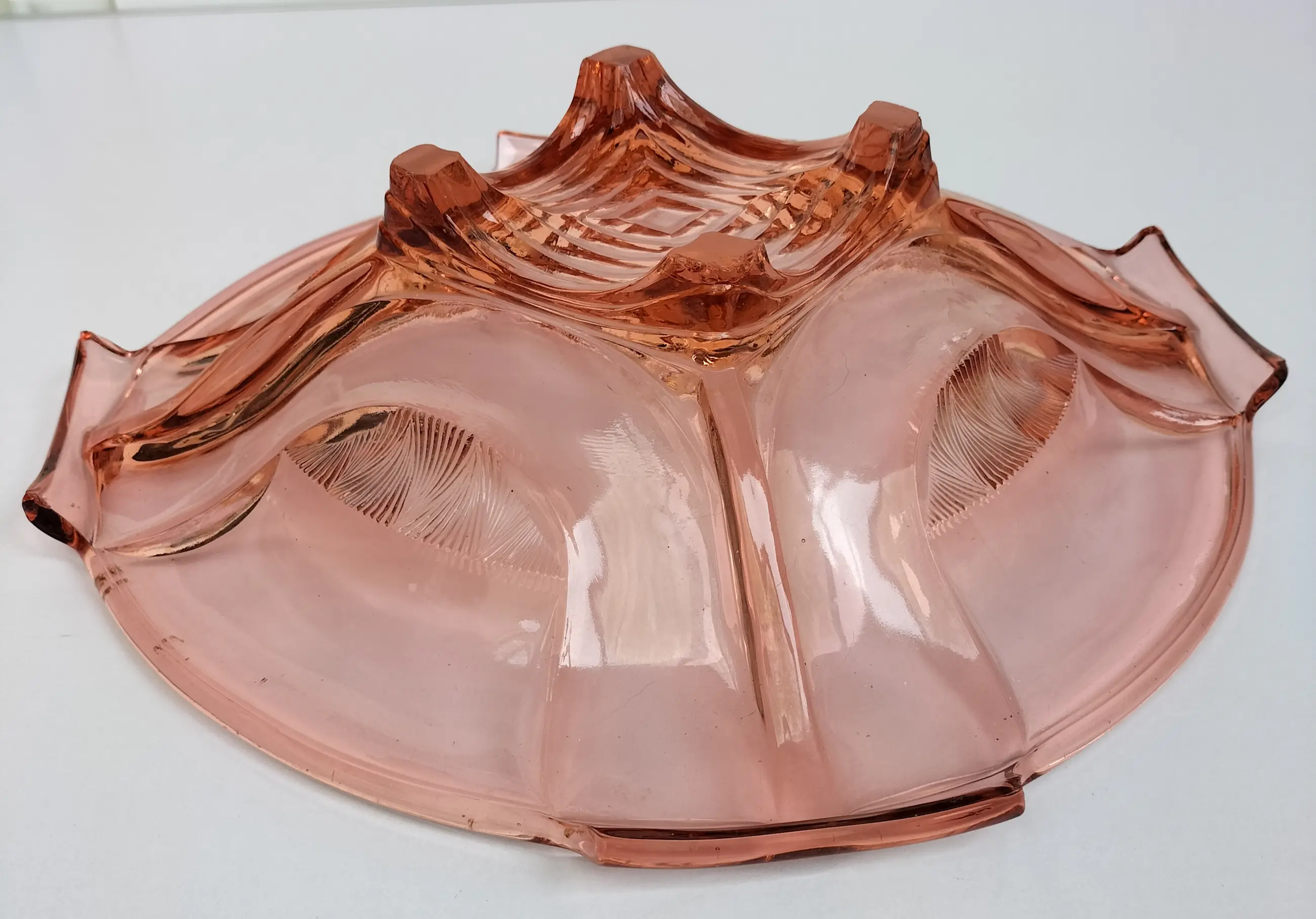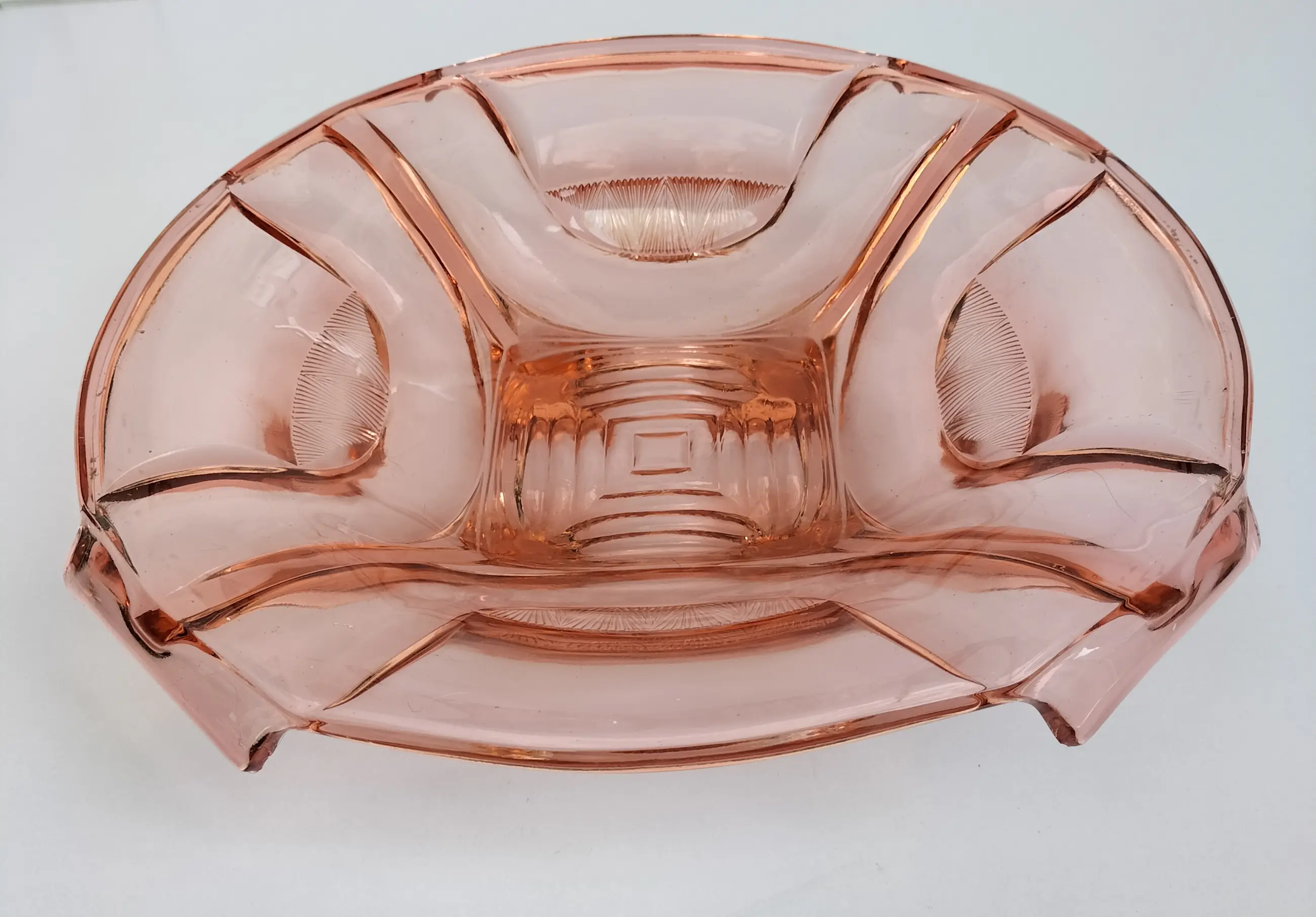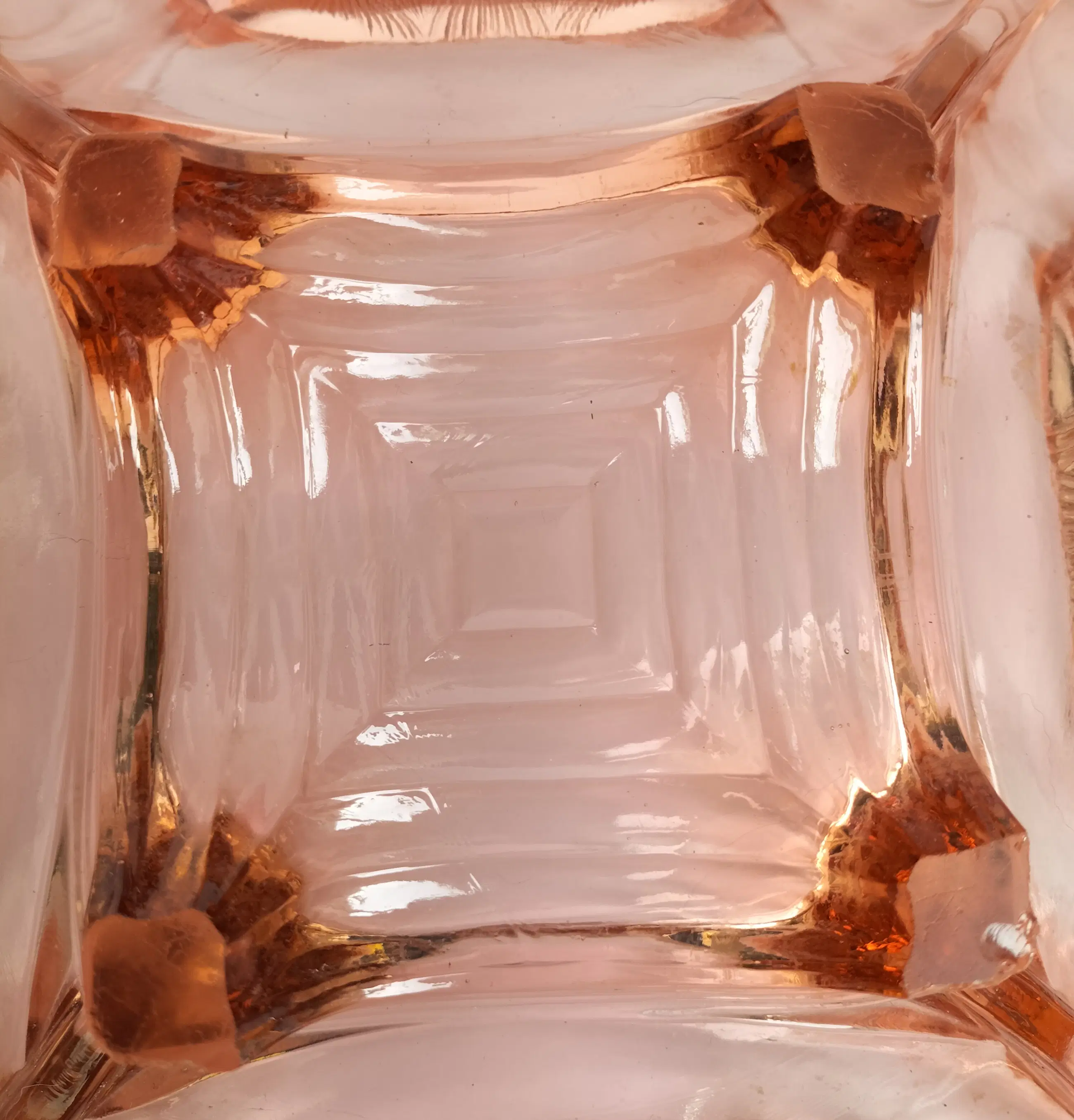 Mooie grote en zware schaal van dik roze persglas van Walther Glas uit de jaren 30/40. De schaal staat genoemd in de Walther Glas catalogus uit 1936 onder nr. 43840. De schaal heeft een vierkante vorm met afgeronde hoeken, vier handgrepen en vier voetjes, en heeft een apart design met bijzondere details. Afgezien van wat slijtage/kleine chips aan. de voetjes (zie laatste foto) in prima staat zonder beschadigingen, chips of krassen met minimale gebruikssporen. Een bijzondere decoratieve en fraaie schaal, die natuurlijk met zorg verpakt en verzonden zal worden.