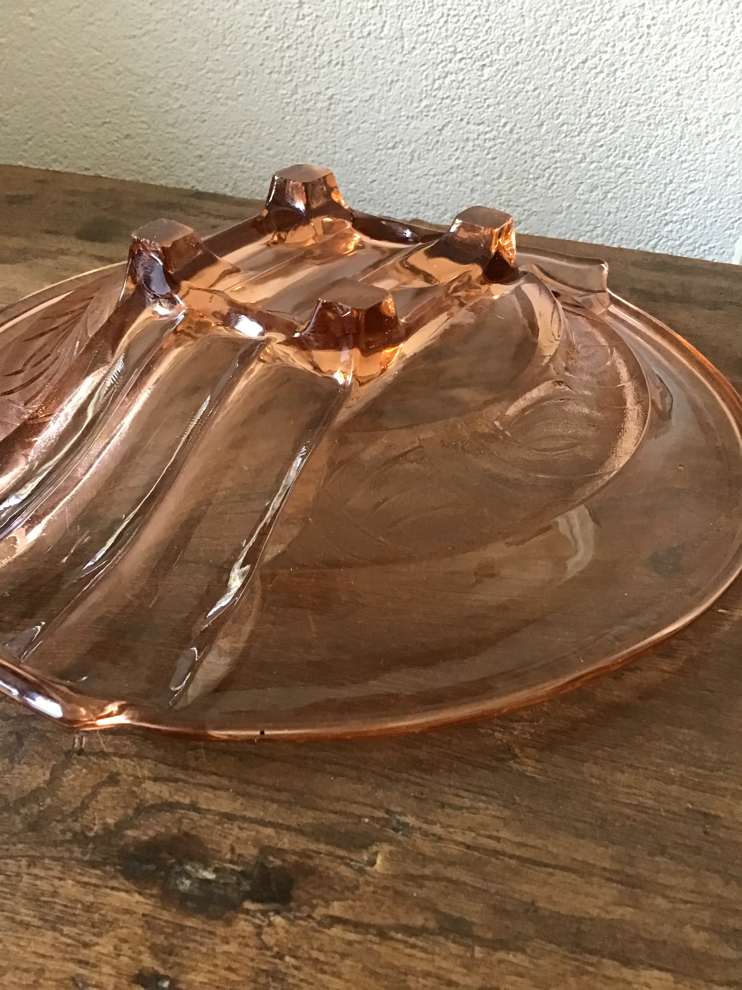 Walther &Sohne Vintage art-deco schaal op 4 pootjes. Transparant oranje/roze glas. Hoogte 7 cm, diameter 30 cm. Conditie goed Wordt aangetekend verzonden