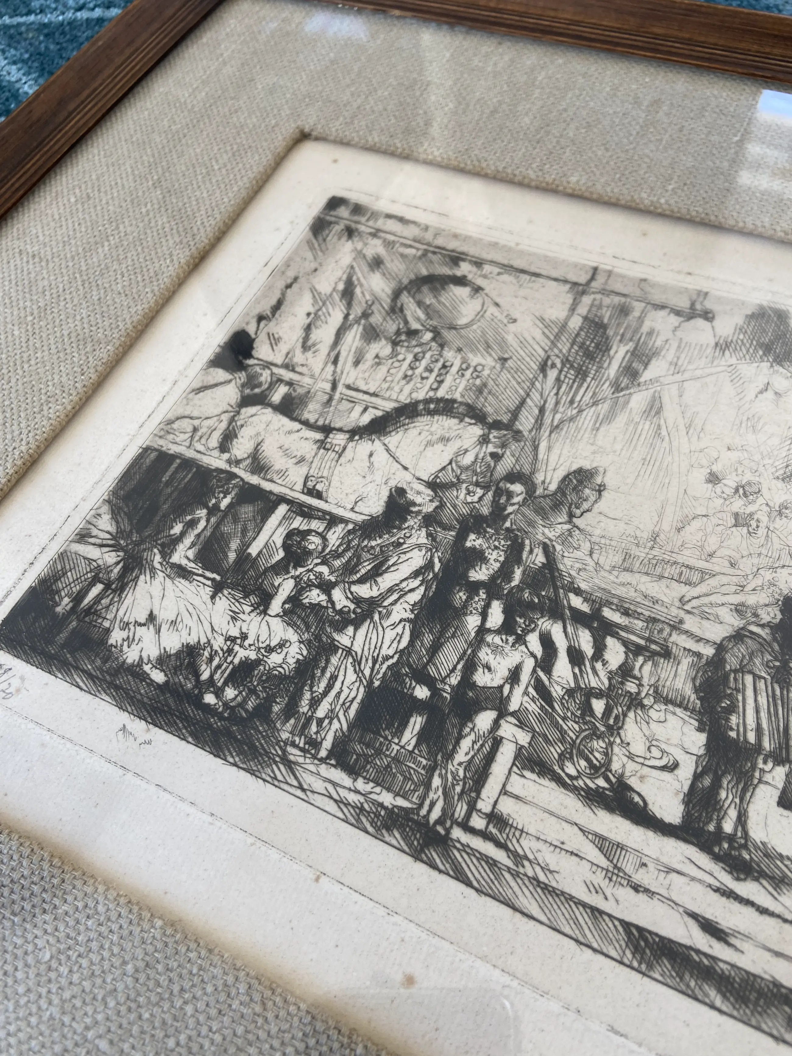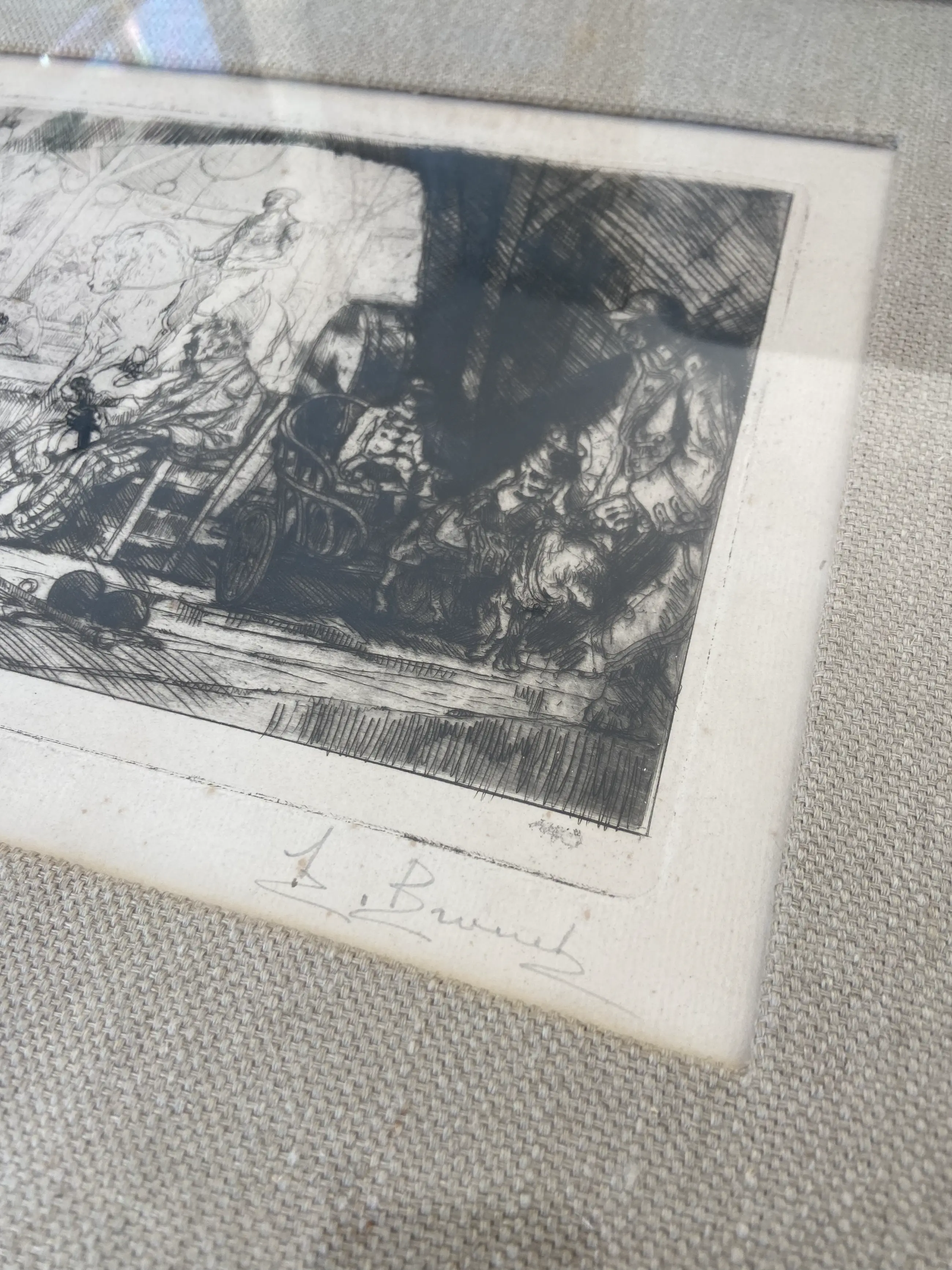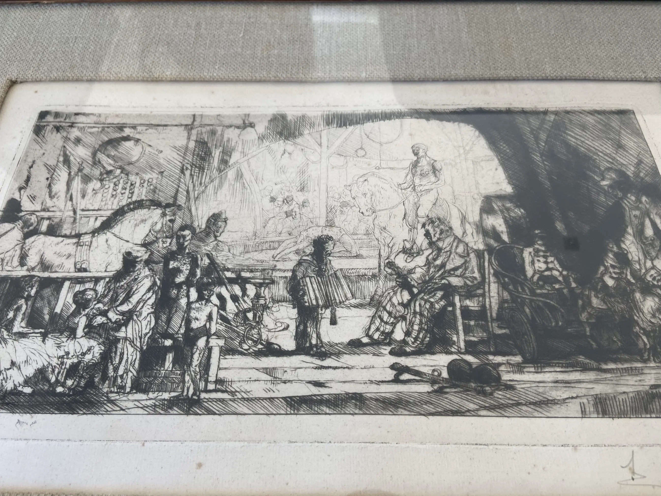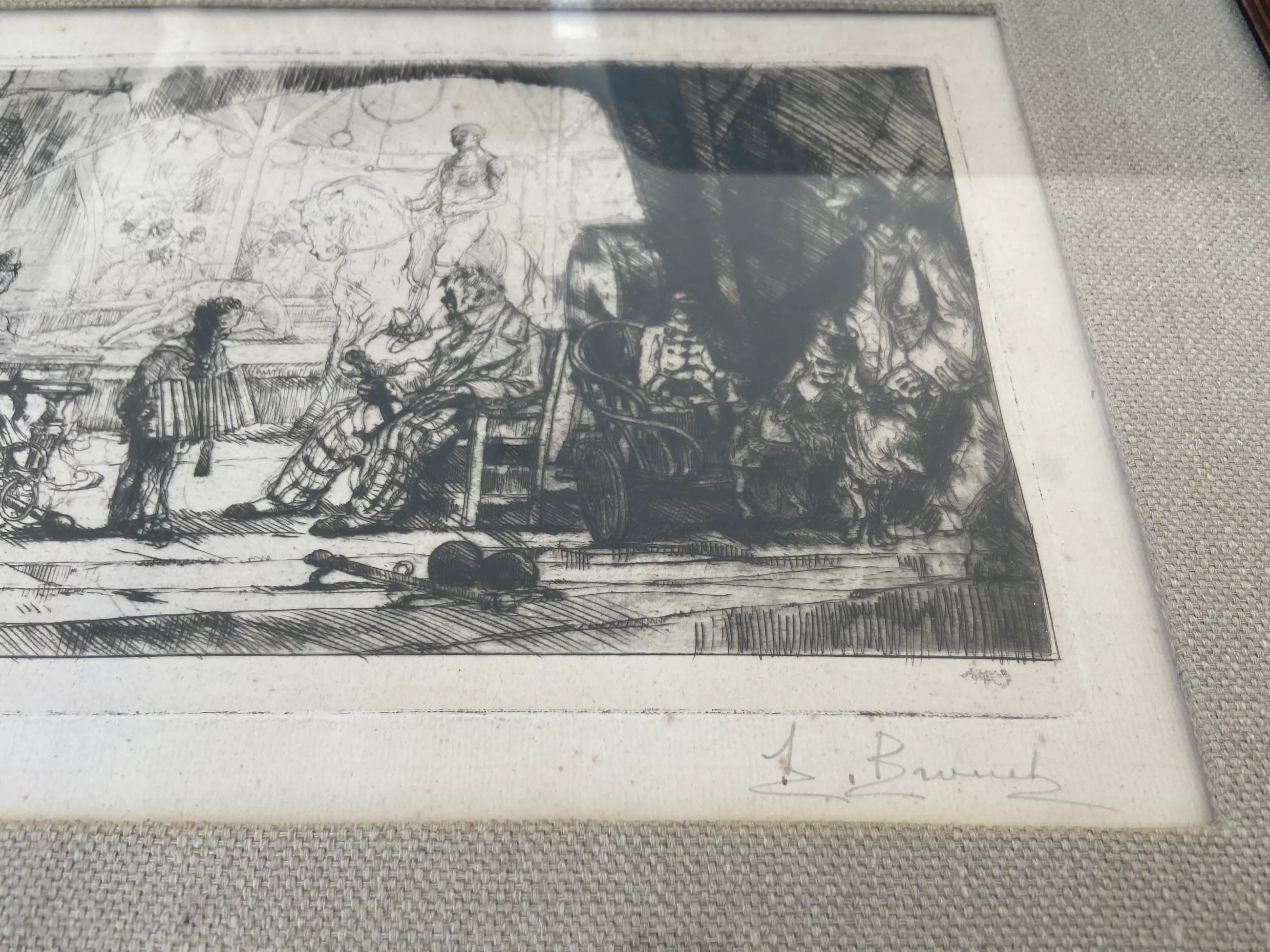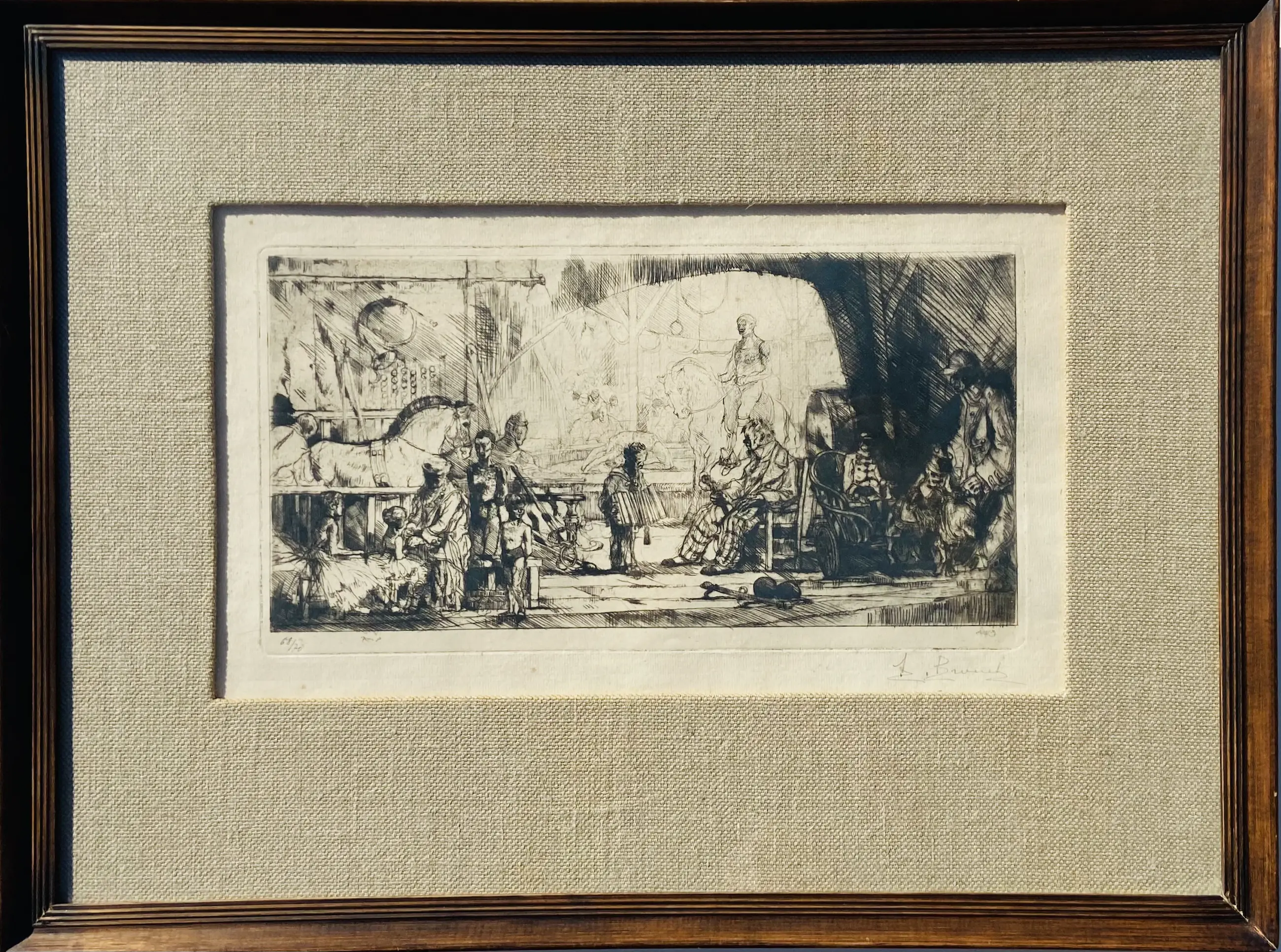 Een fraaie ets, voorstelling van een circus van de Franse kunstenaar August Brouet. Gesigneerd en genummerd 68/70 in potlood. Heel mooi ingelijst en in zeer goede staat.