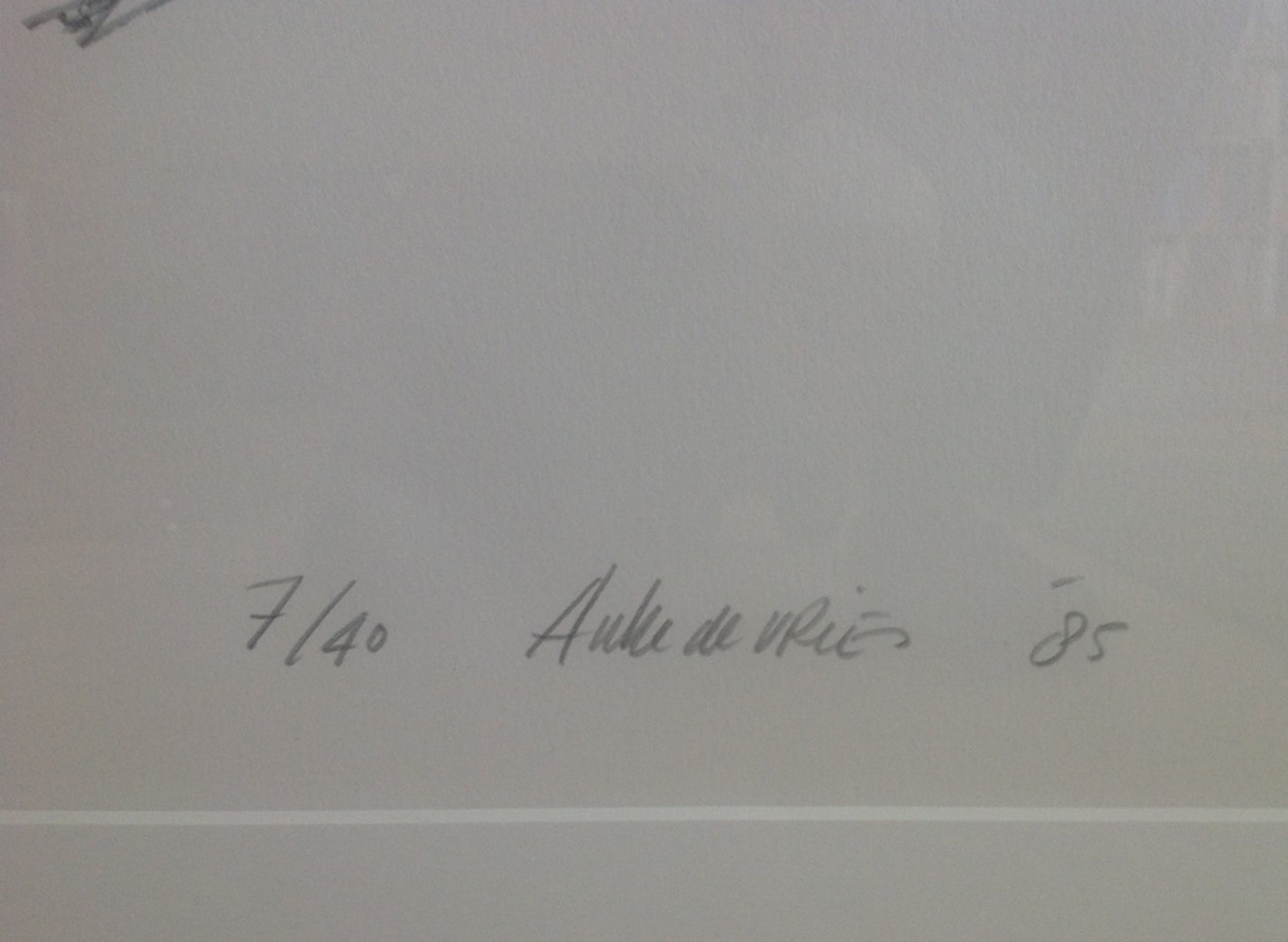 Zeldzame zeefdruk van Auke de Vries, 'vlucht', een ontwerp voor de koepelgevangenis in Breda. In zware Barth-lijst, formaat 123 x 73 cm., beeld: 80 x 50 cm., '85, 7/40. In prima conditie.
