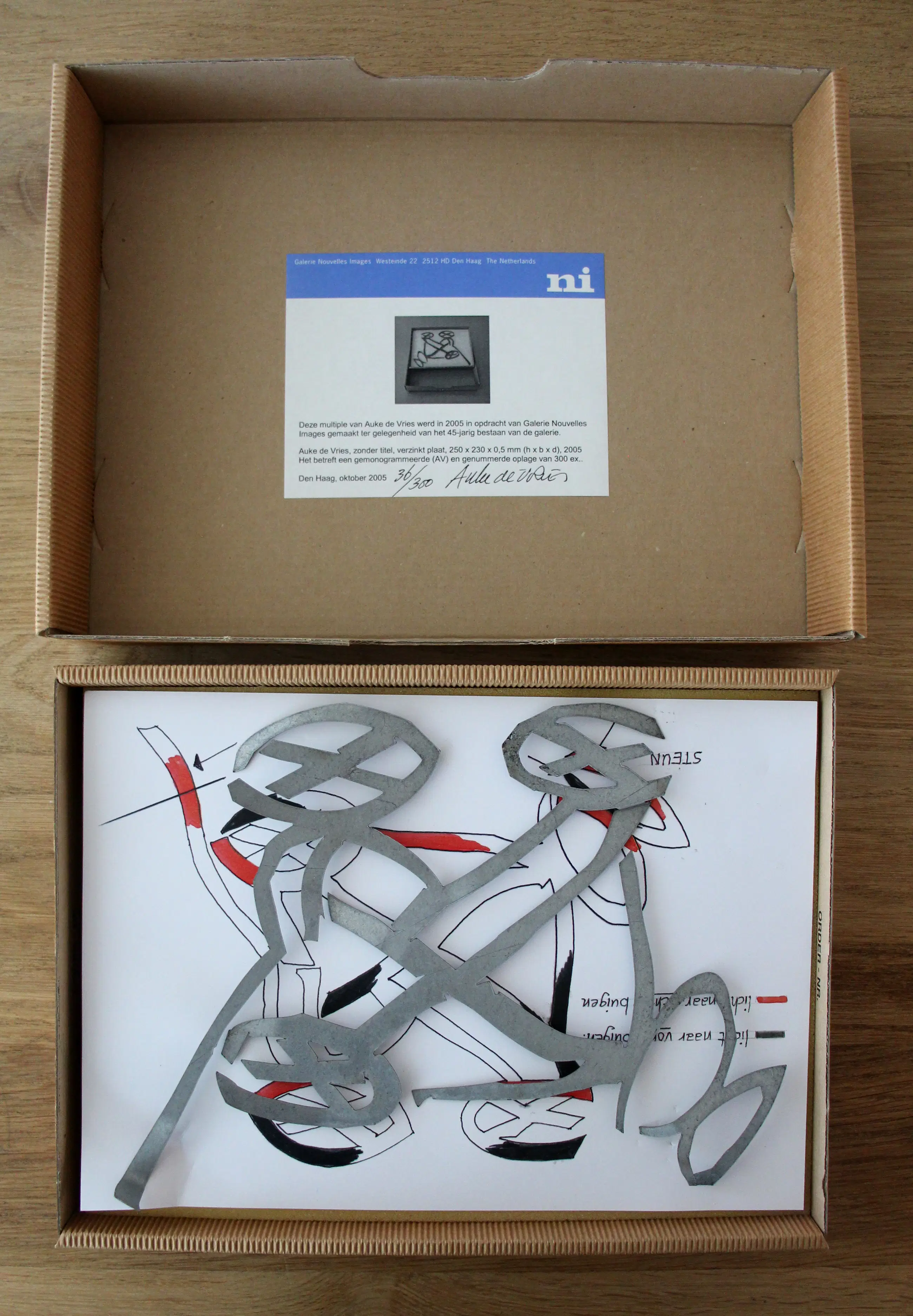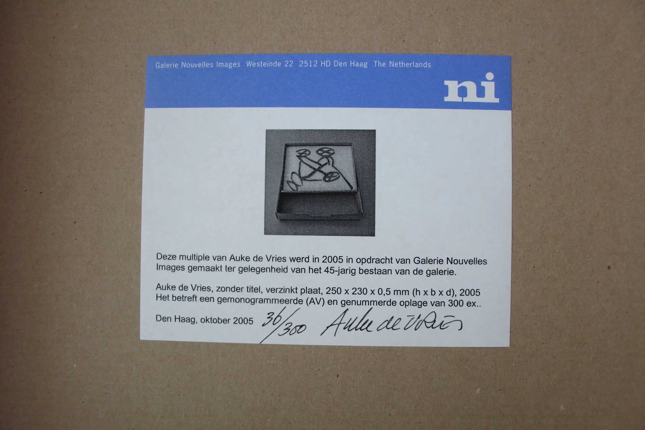 Beeld van verzinkte plaat van Auke de Vries. Met handleiding en originele opbergdoos van Galerie Nouvelles Images (Den Haag). Dit beeldje is uitgegeven ter gelegenheid van het 45 jarig bestaan van de galerie. in 2005. Zonder titel. Oplage: 36/300. Afmetingen beeld: H21 x b27 x d2cm. Het werk is, rechts onderaan, gesigneerd met initialen. De authenticiteit van het aangeboden werk kan, op aanvraag, worden gemaild. Een certificaat van echtheid kan, op aanvraag, worden gemaild.