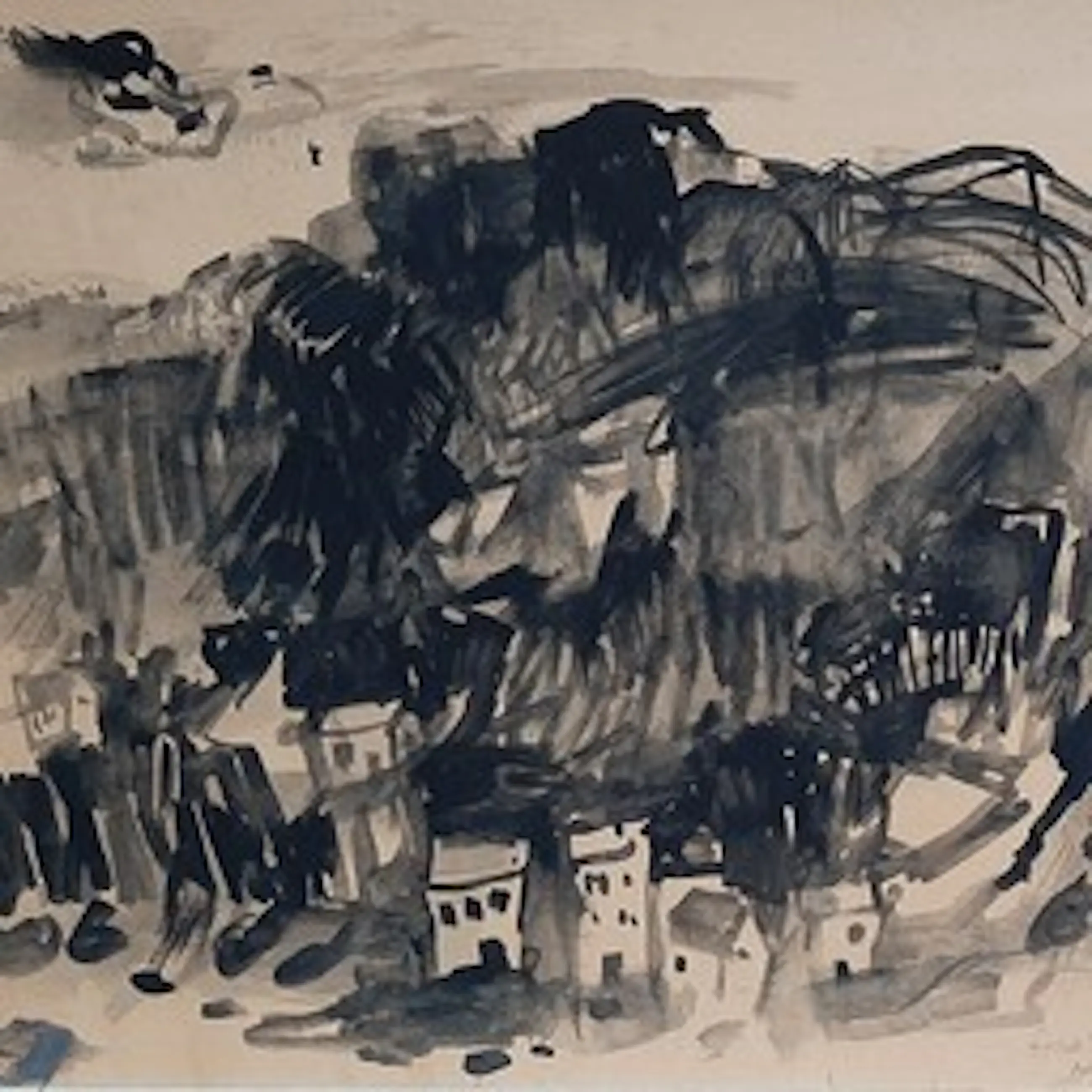 Gewassen inkttekening, een reisimpressie gemaakt in Noorwegen.