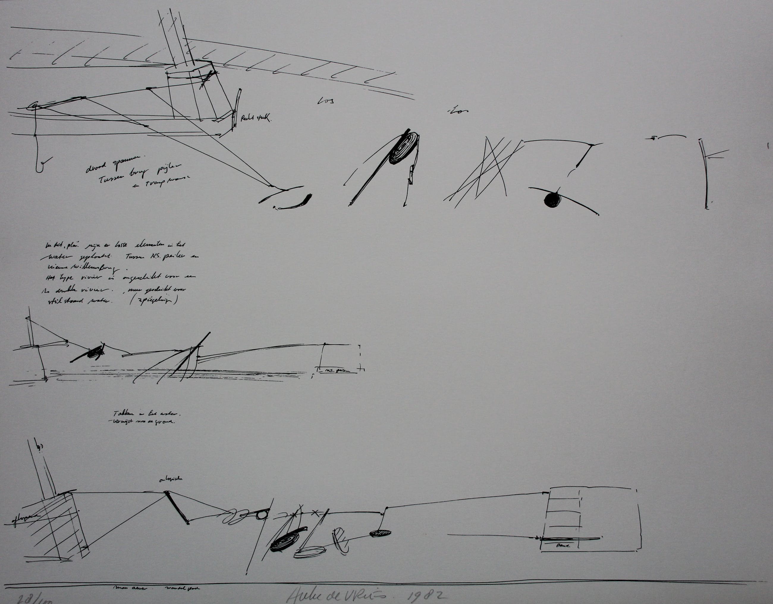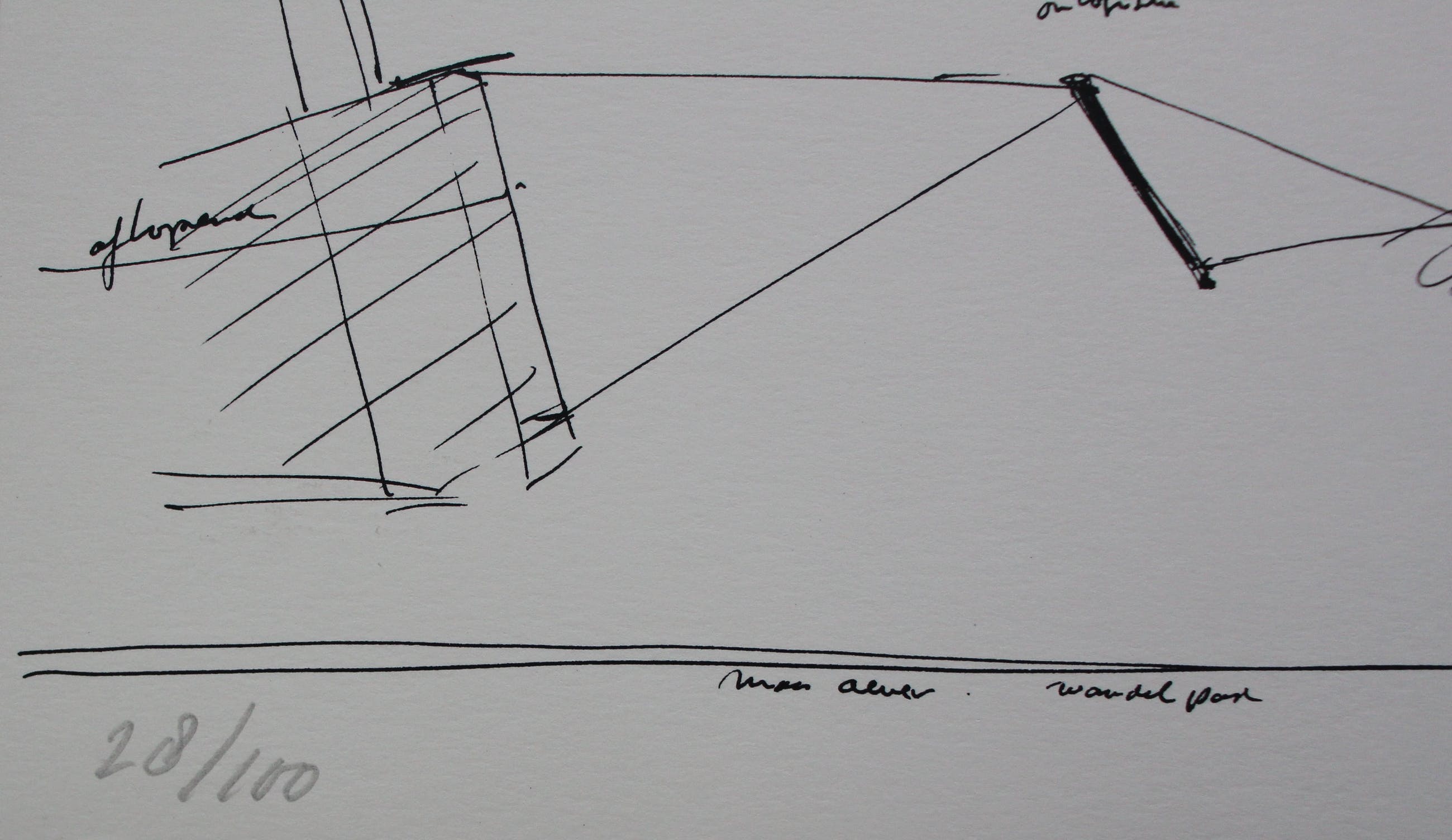 Grote litho van Auke de Vries, het ontwerp voor het bekende 'Maasbeeld' in Rotterdam. Jaar: 1982. Formaat H100 x B70cm, litho op dik papier, genummerd 98/100 (kan afwijken i.v.m. het in bezit hebben van meerdere exemplaren) , en gesigneerd. De litho is nooit ingelijst. De authenticiteit van het aangeboden werk wordt volledig gegarandeerd. Een certificaat van echtheid kan, op aanvraag, worden gemaild.