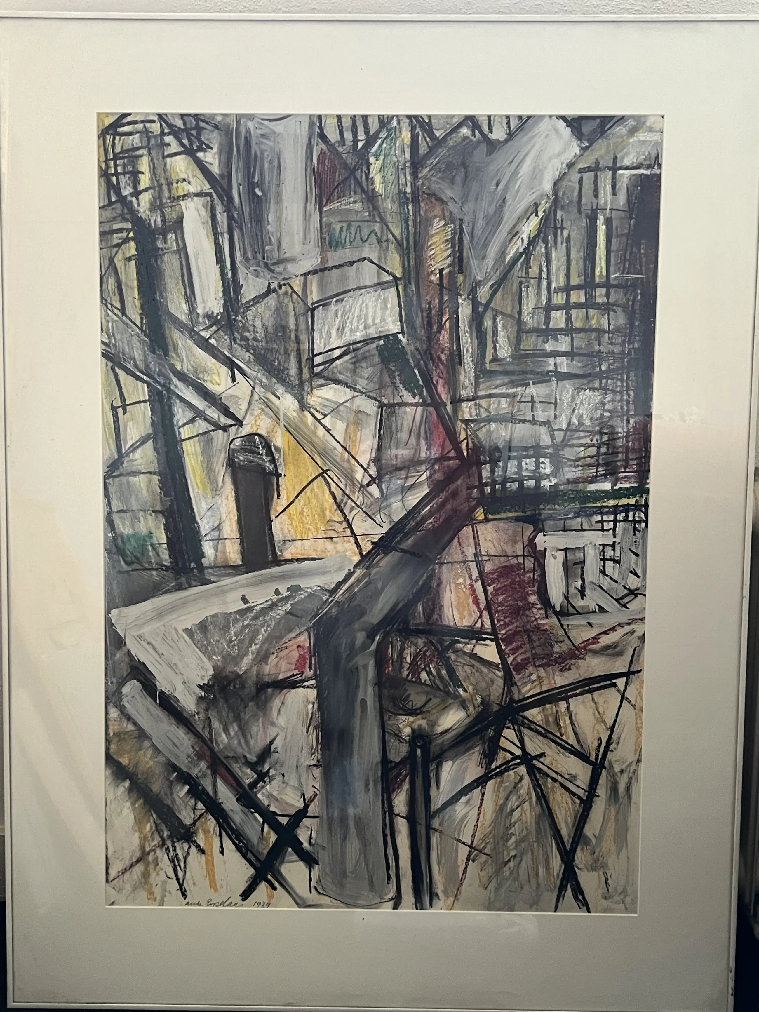 Auke Eijgelaar heeft rond de periode van 1980 zijn atelier gehad in Heemstede Later vestigde hij zich in Den Bosch. In dit schilderij werkte hij met krijt, houtskool en verf. Mixed media.