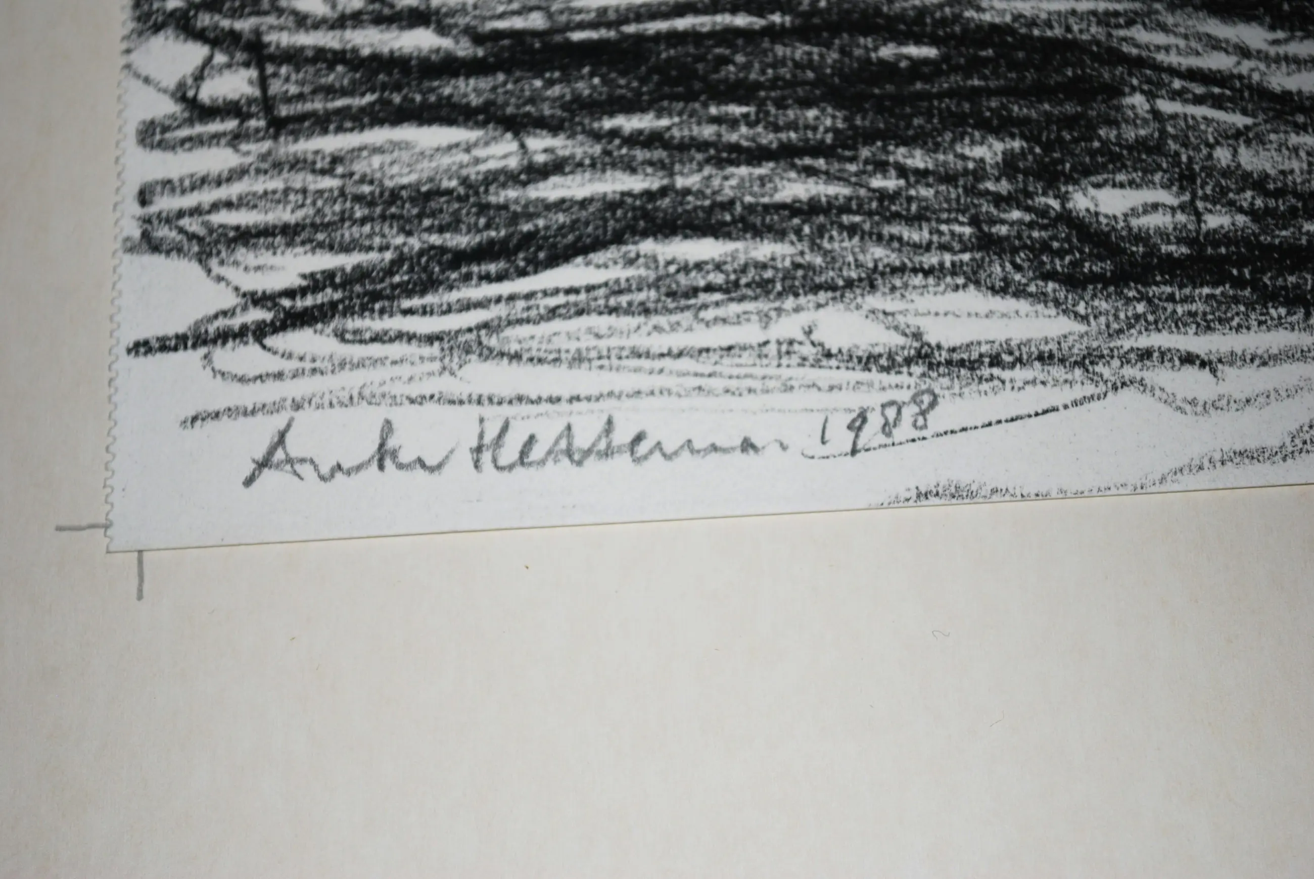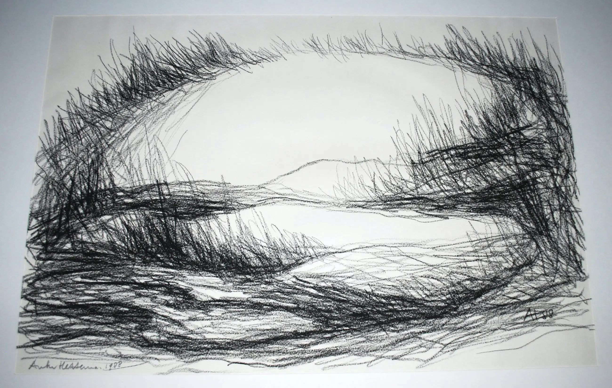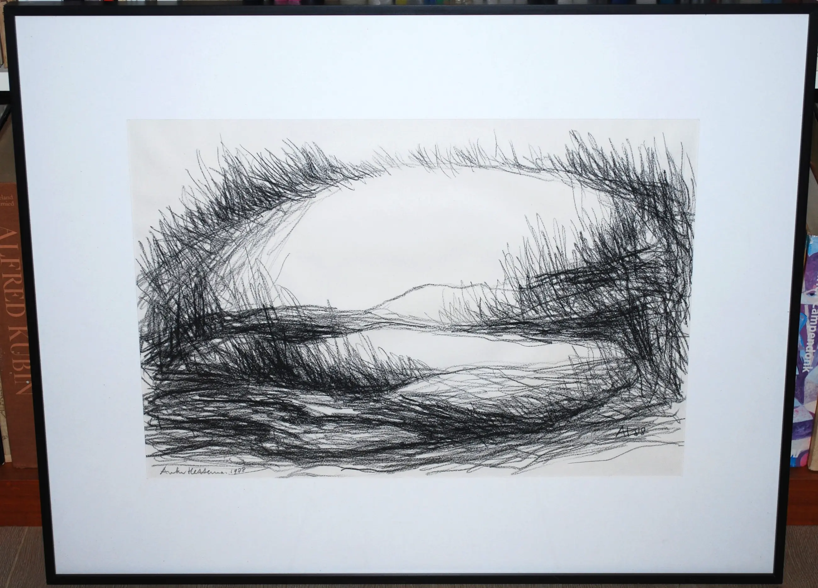 Zelden aangeboden tekening van de beeldhouwer Hettema. Bladmaat 32x47 cm. Het blad is losjes (met 2 plakkers) geplaatst achter passepartout. Achter glas is in een strakke zwarte aluminium lijst.