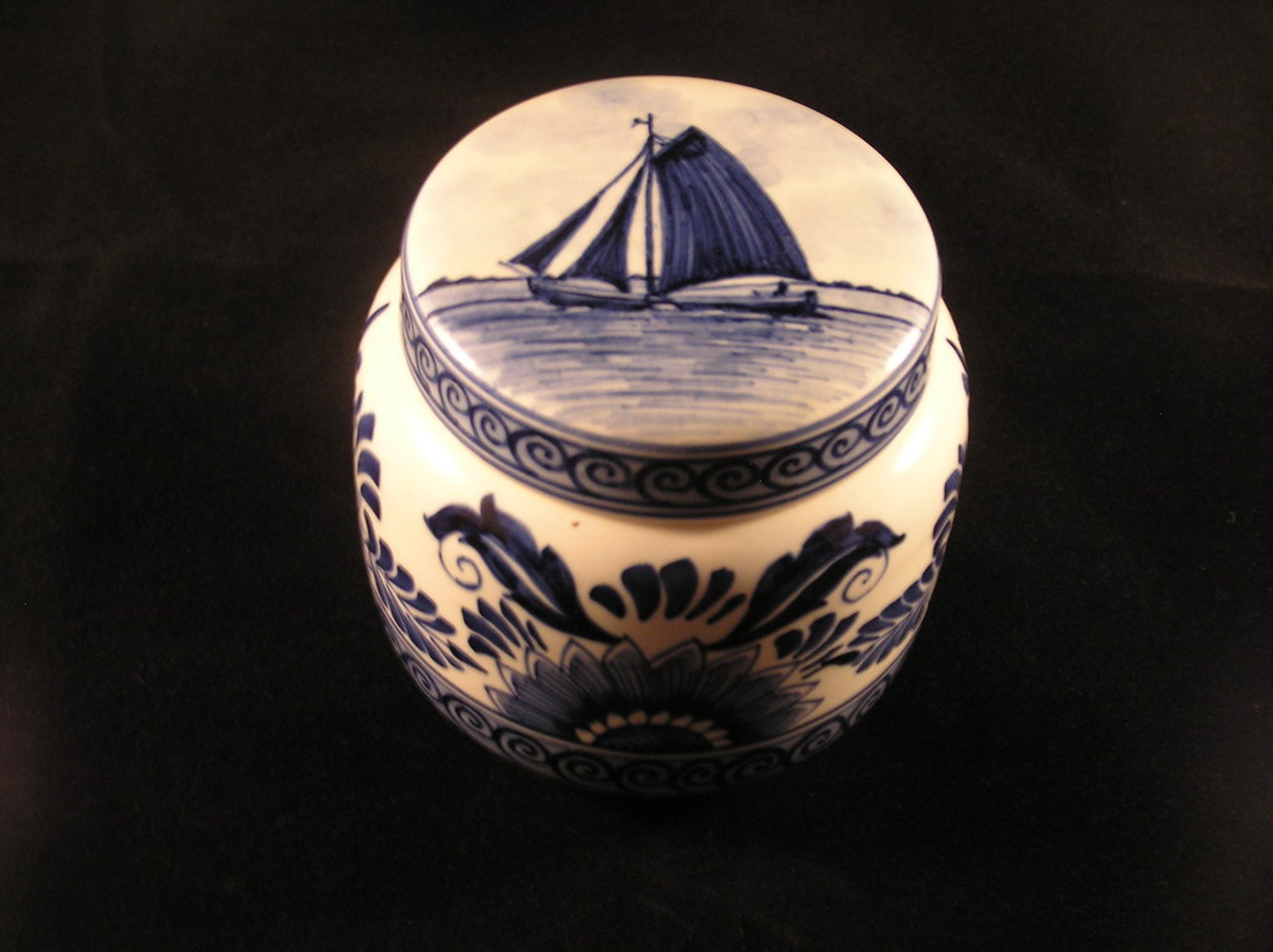 Een handbeschilderd blauwwit dekselpotje van Aurora uit Workum. In prima onbeschadigde conditie. Aan de onderzijde met de hand gemerkt.