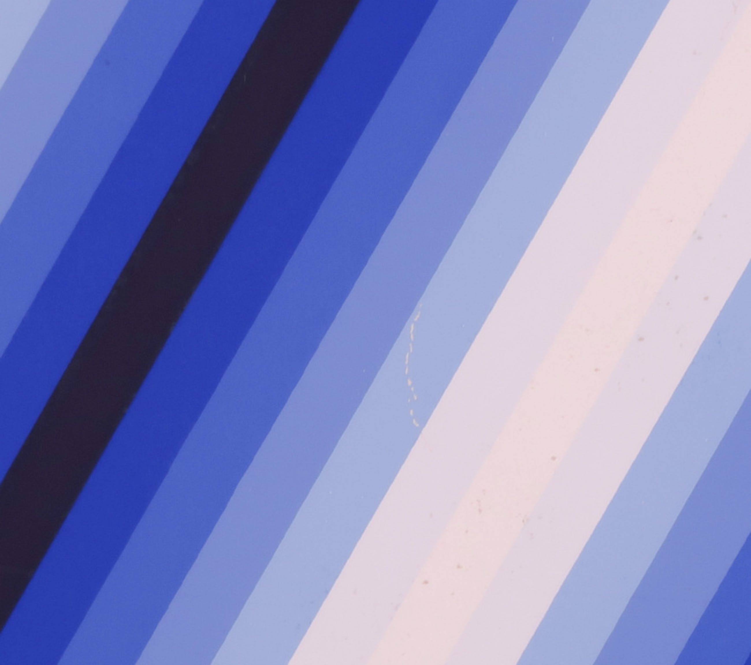 | Over het algemeen in goede staat. In strijklicht is wat lichte oppervlakkige slijtage te zien, in het beeld een klein krasje (zie foto), langs de randen en hoeken enkele lichte beschadigingen. | |||