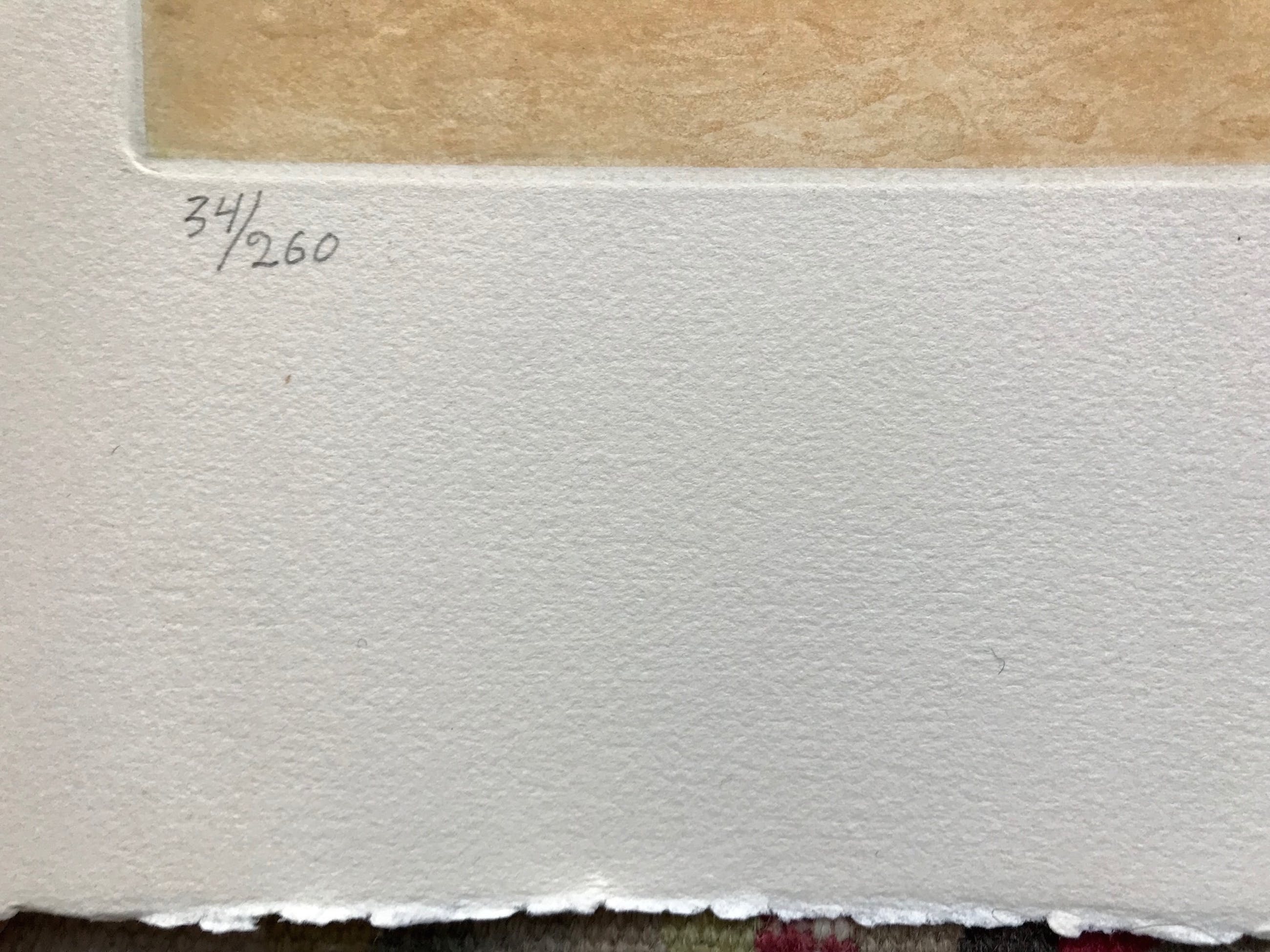 Het papier was vastgeplakt aan de achterkant van de lijst. Bij het verwijderen uit de lijst is het papier aan de achterkant gescheurd. Dit is niet direct zichtbaar aan de voorzijde alleen lichtelijk bij 1 stuk waar het papier dunner is geworden (zie laatste twee detail foto's van de voor- en achterkant waar de beschadiging zit). Het is alleen boven bij de witrand rondom de afbeelding, niet op het papier achter de afbeelding zelf.