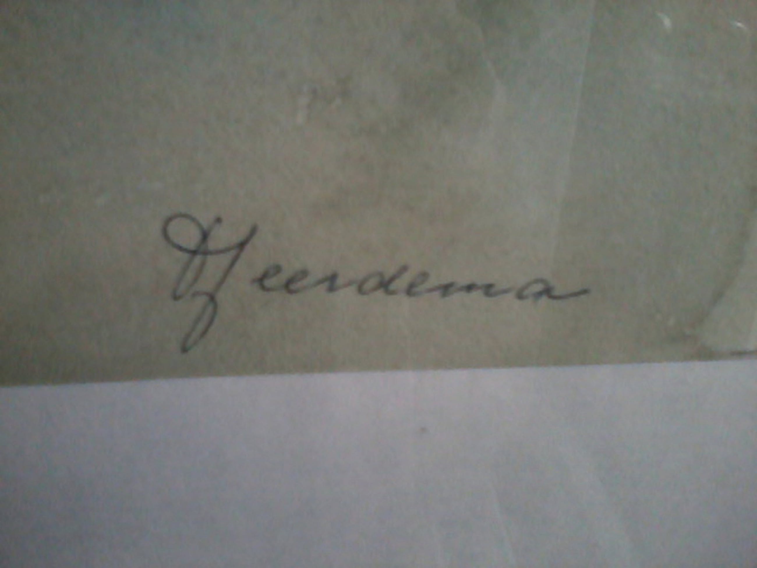 Aquarel van B. Tjeerdema in witte lijst. Afmeting lijst: 41 x 51 cm. Afmeting aquarel: 38 x 32 cm. Aquarel zit niet in passe partout maar is rechtstreeks op achtergrond bevestigd. Paar hele kleine bruine plekjes (zie laatste foto).