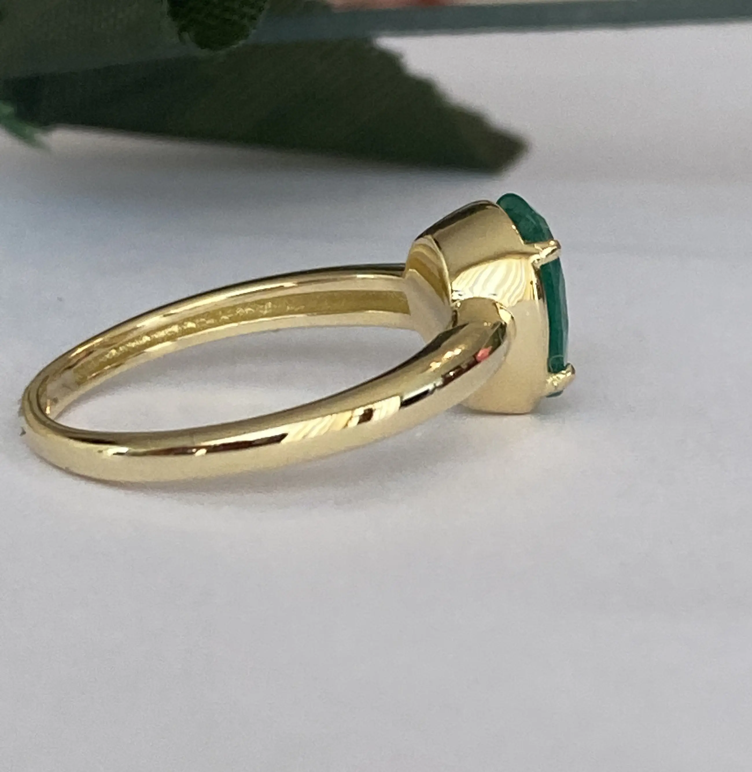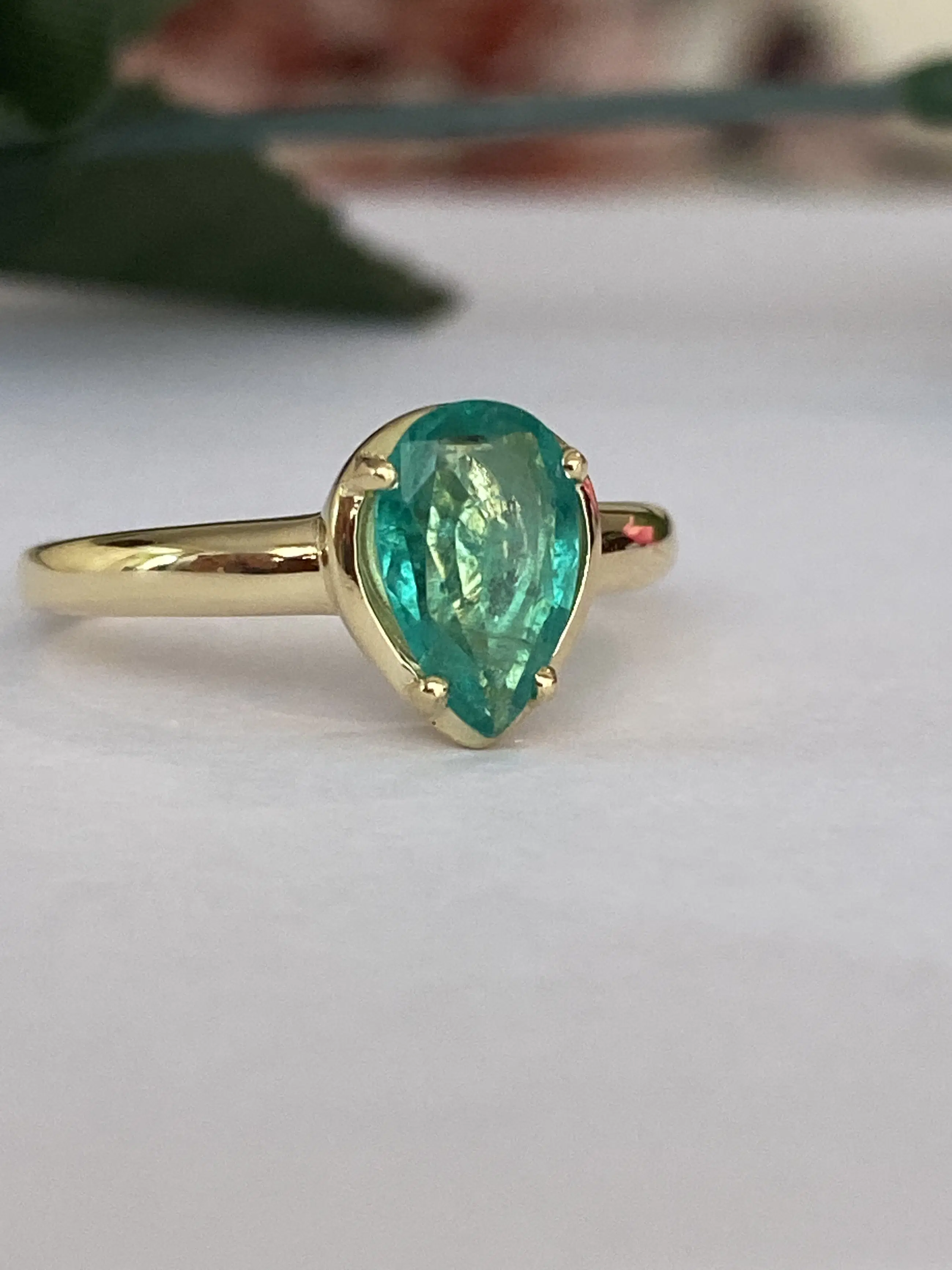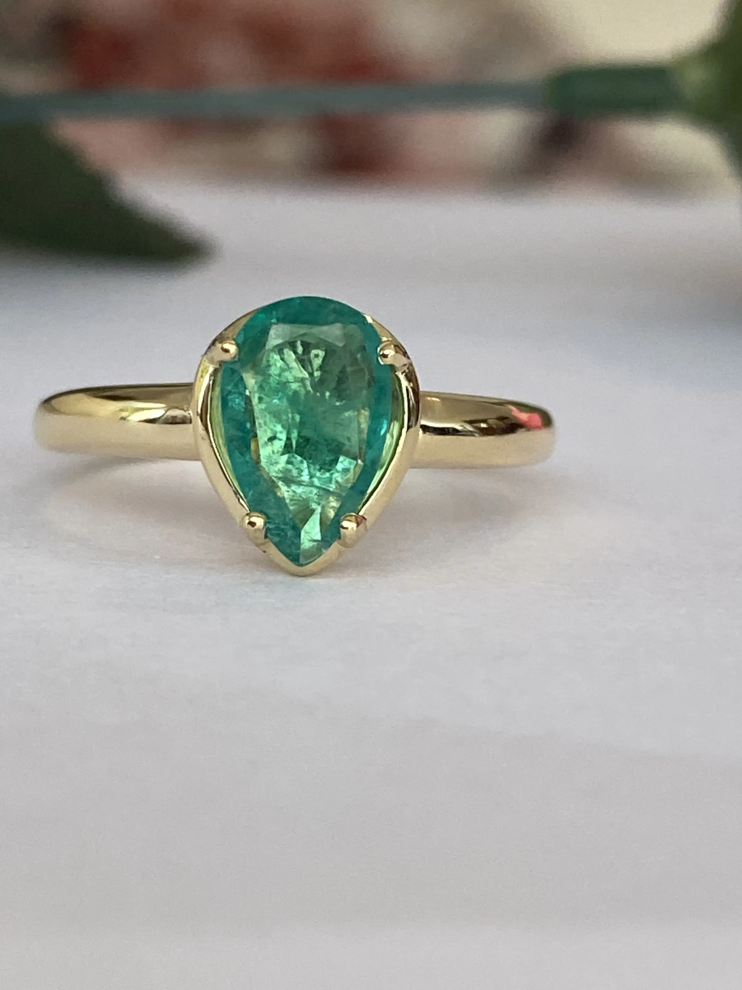 In nieuwstaat aangeboden, een handgemaakte gele ring van 18 karaat met een natuurlijke peervormige smaragd van 1,50 crt in het midden. Gehalte: 750 (gemerkt) Gewicht: 3,7 gram Afmetingen van de stenen: 9 mm * 7 mm Ringmaat: 17,50 mm / 7 1/4 Amerikaanse maat Afmetingen van de ring: 10 mm * 21 mm Geleverd in een ringdoosje