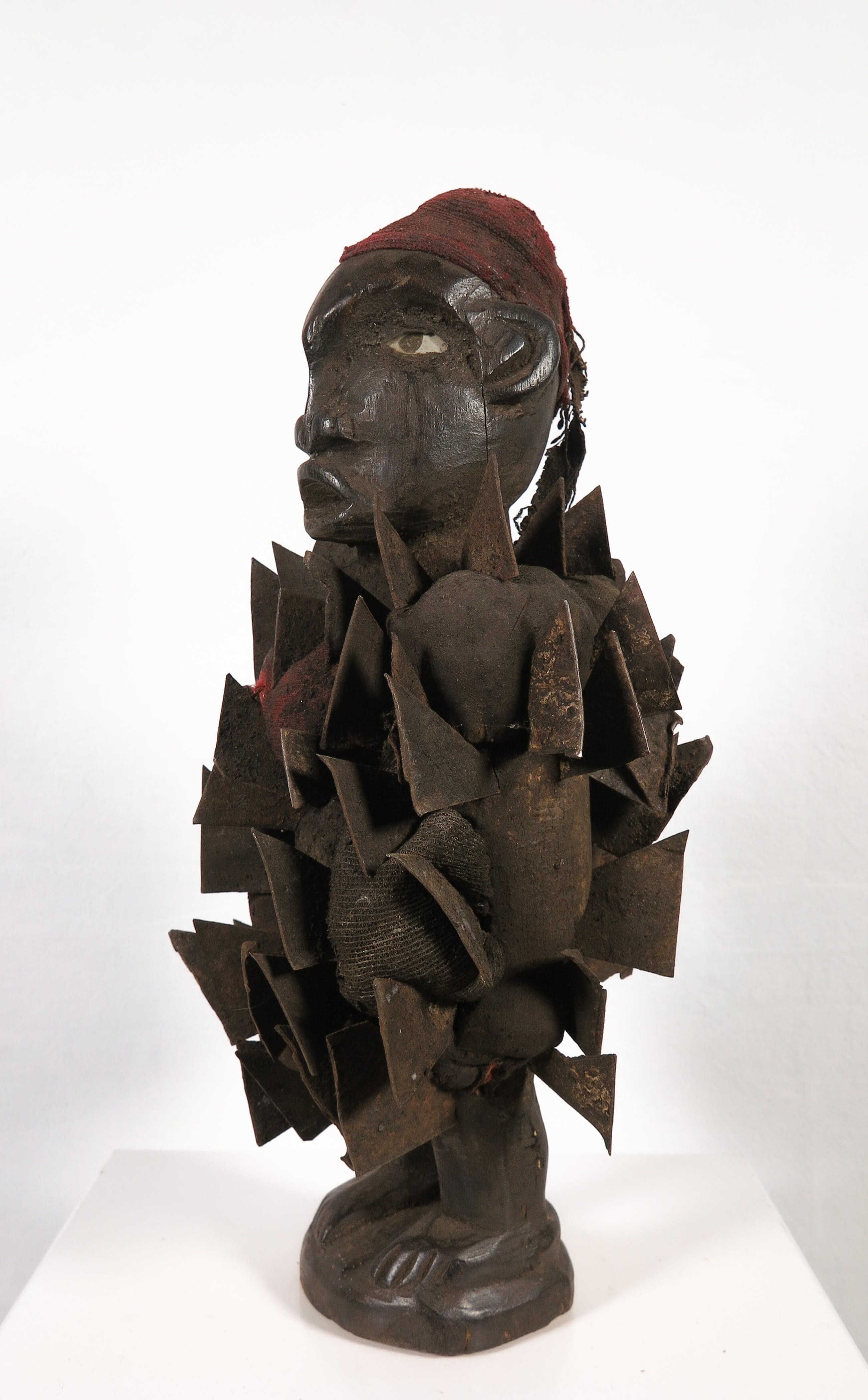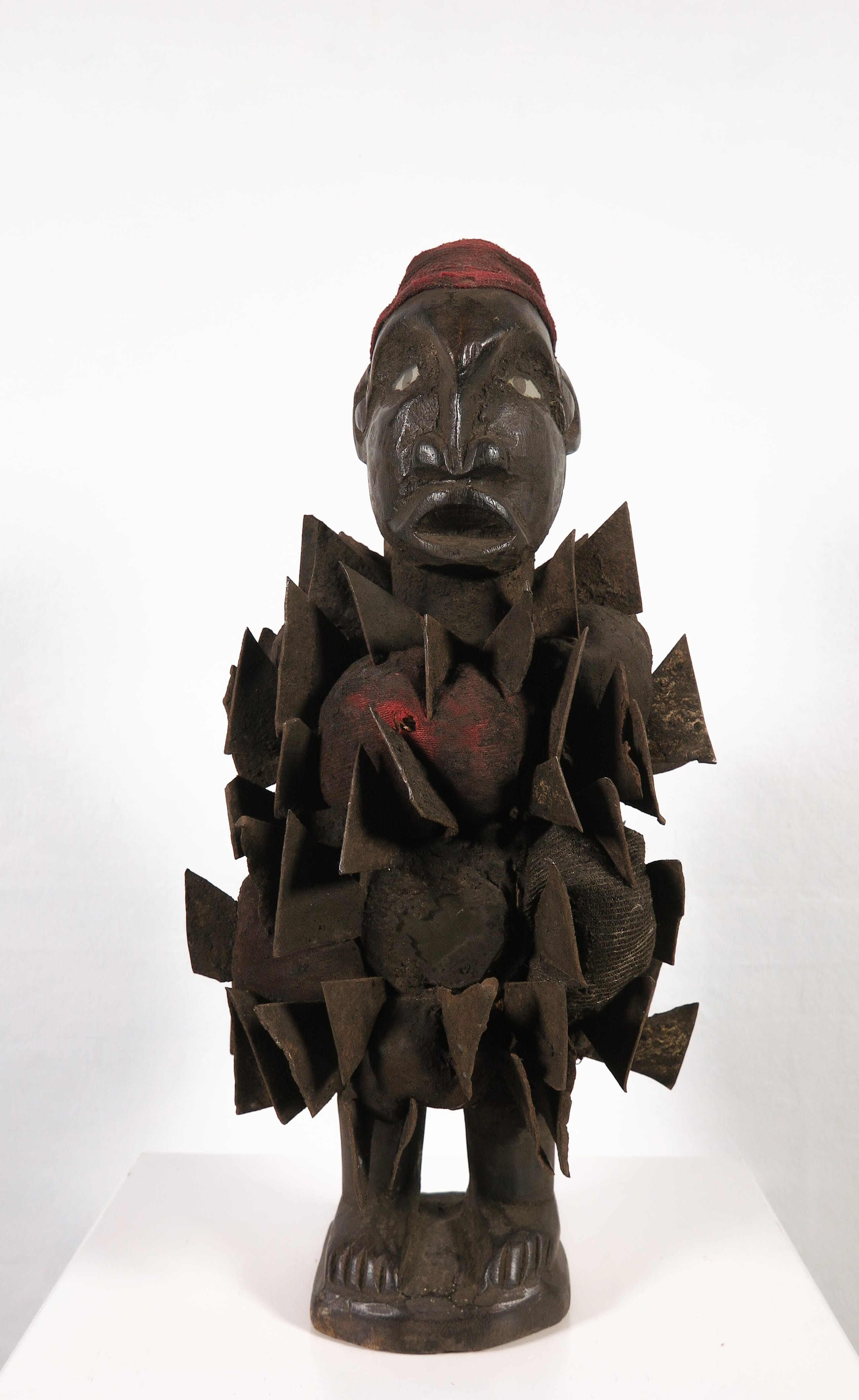 Krachtbeeld afkomstig van de Bakonga stam uit de Democratische Republiek Congo. Het beeld bestaat uit hout en metaal, en spiegelogen- en buik en buidels gevuld met beschermende kruiden.