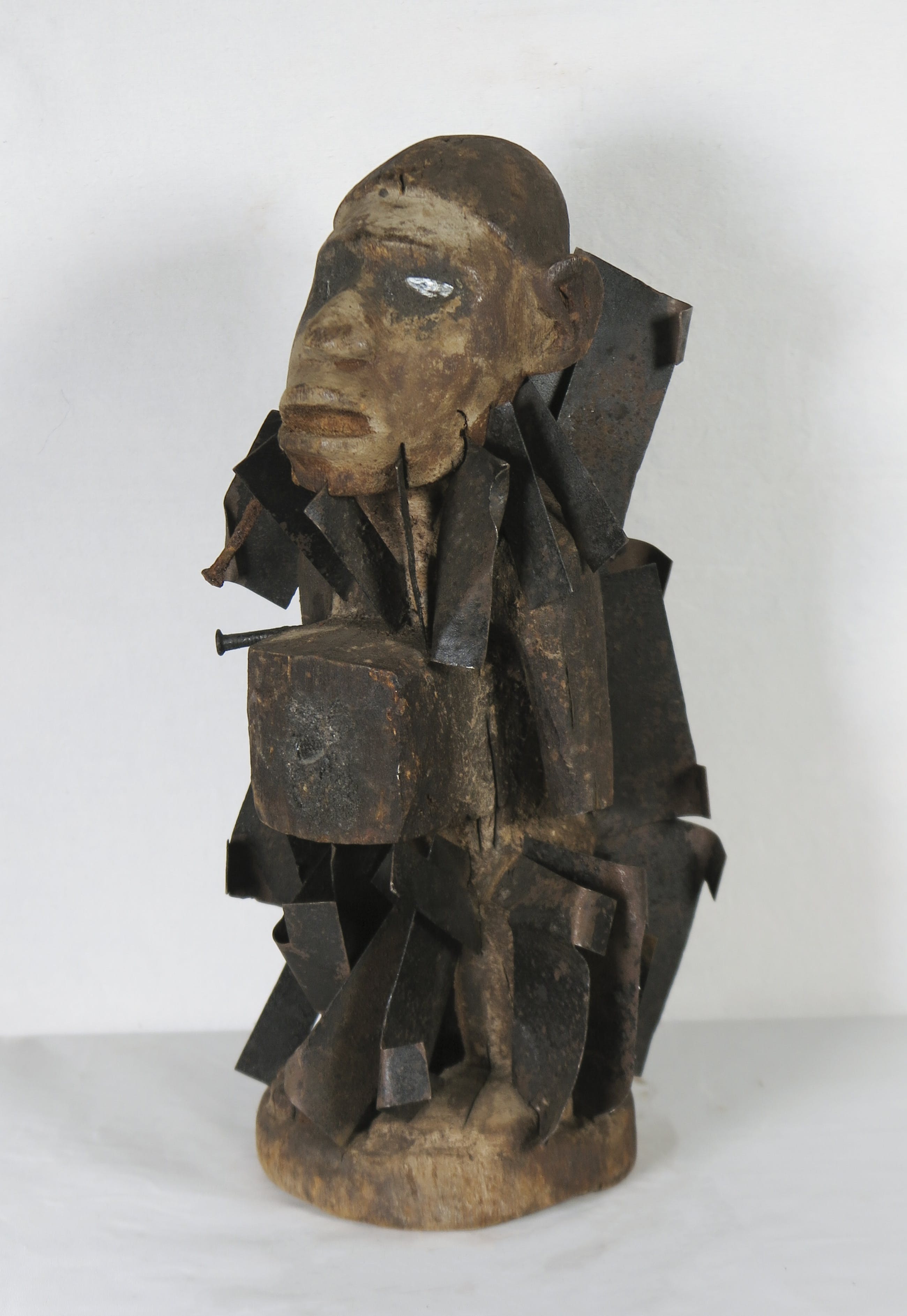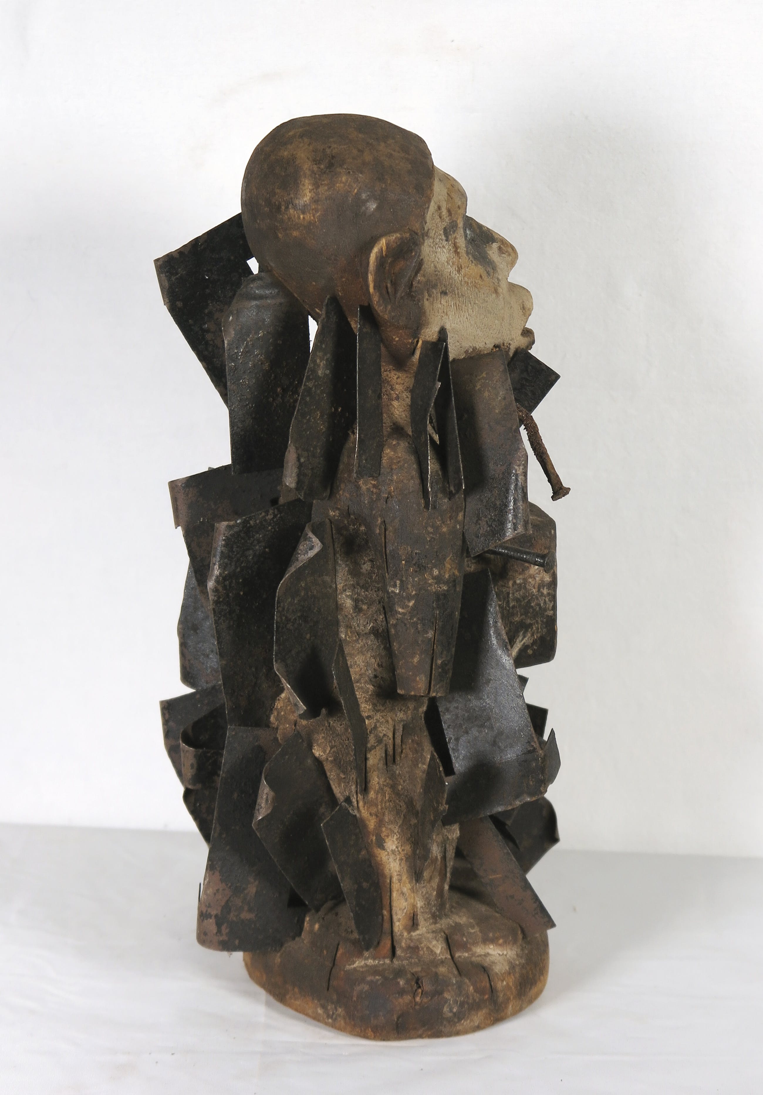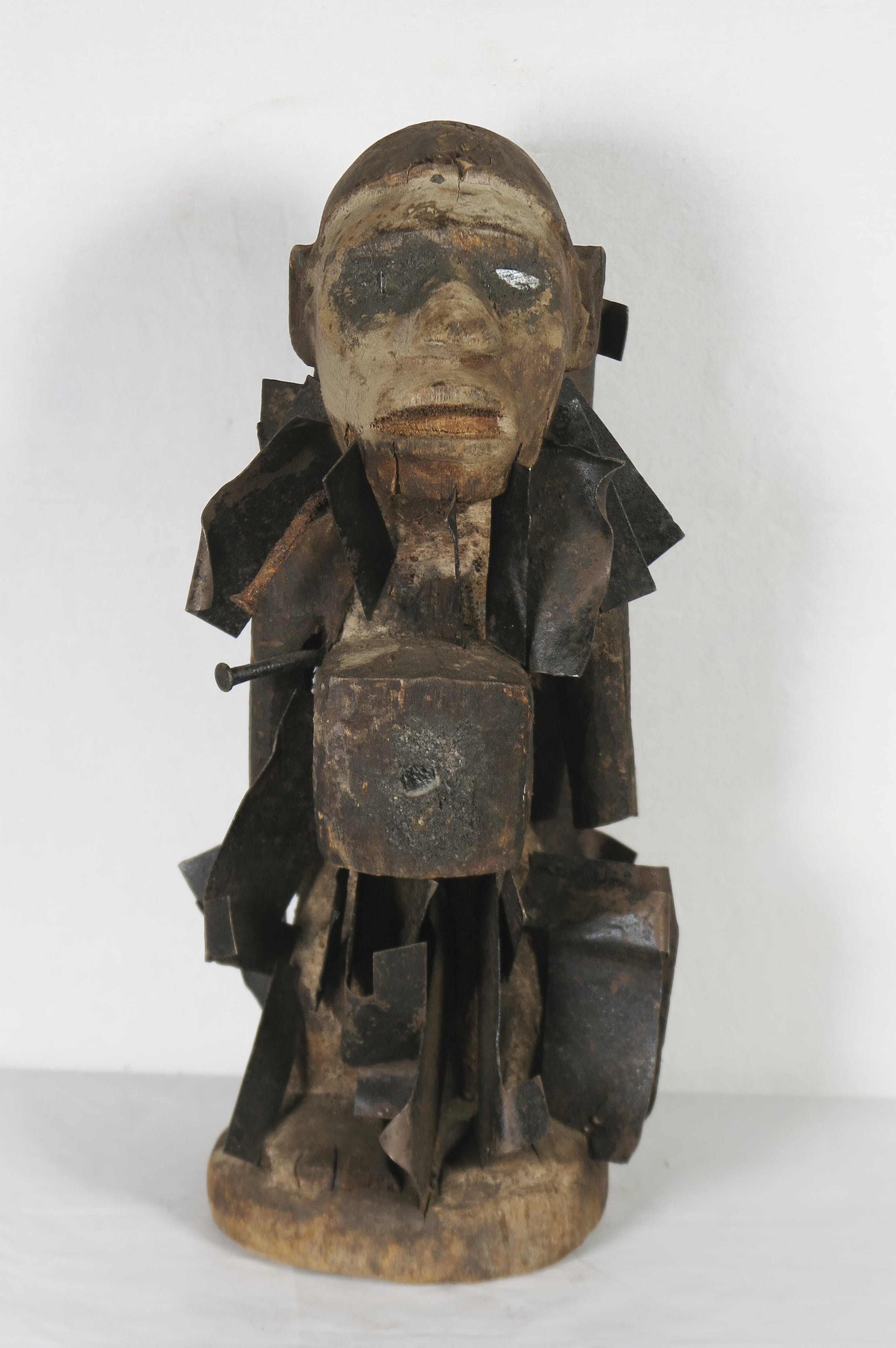 Krachtbeeld afkomstig van de Bakonga stam uit de Democratische Republiek Congo. Het beeld bestaat uit hout en metaal, en spiegelogen- en buik.