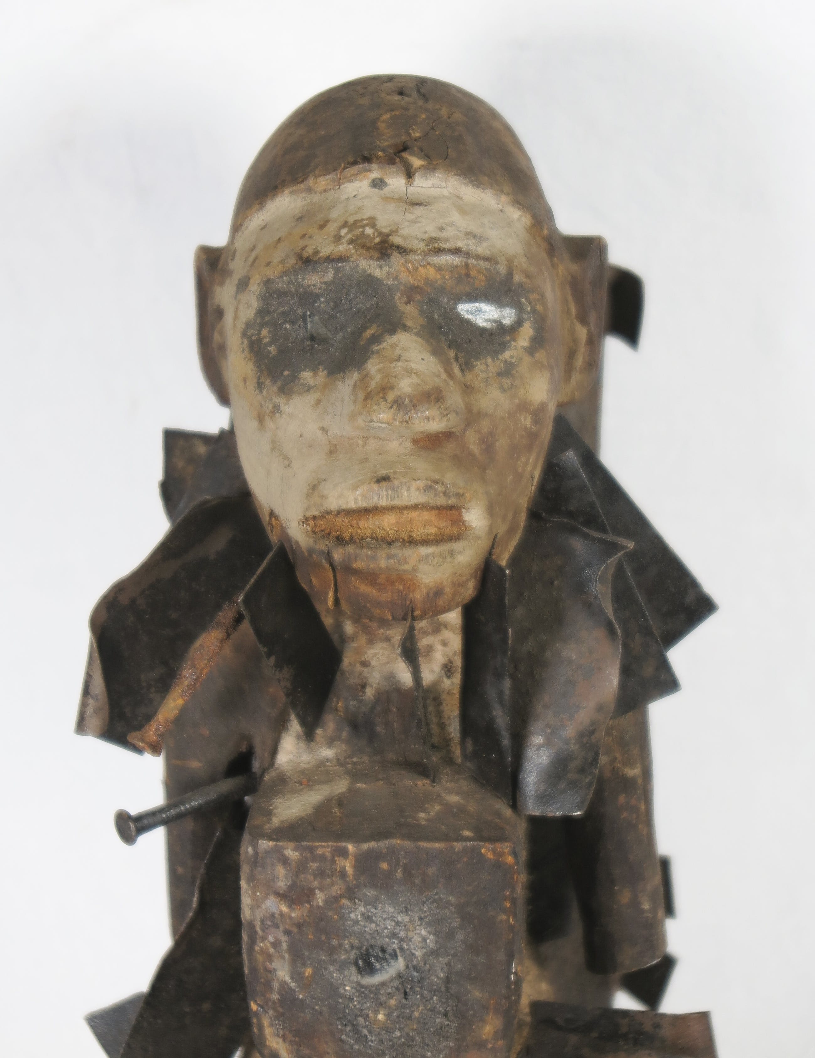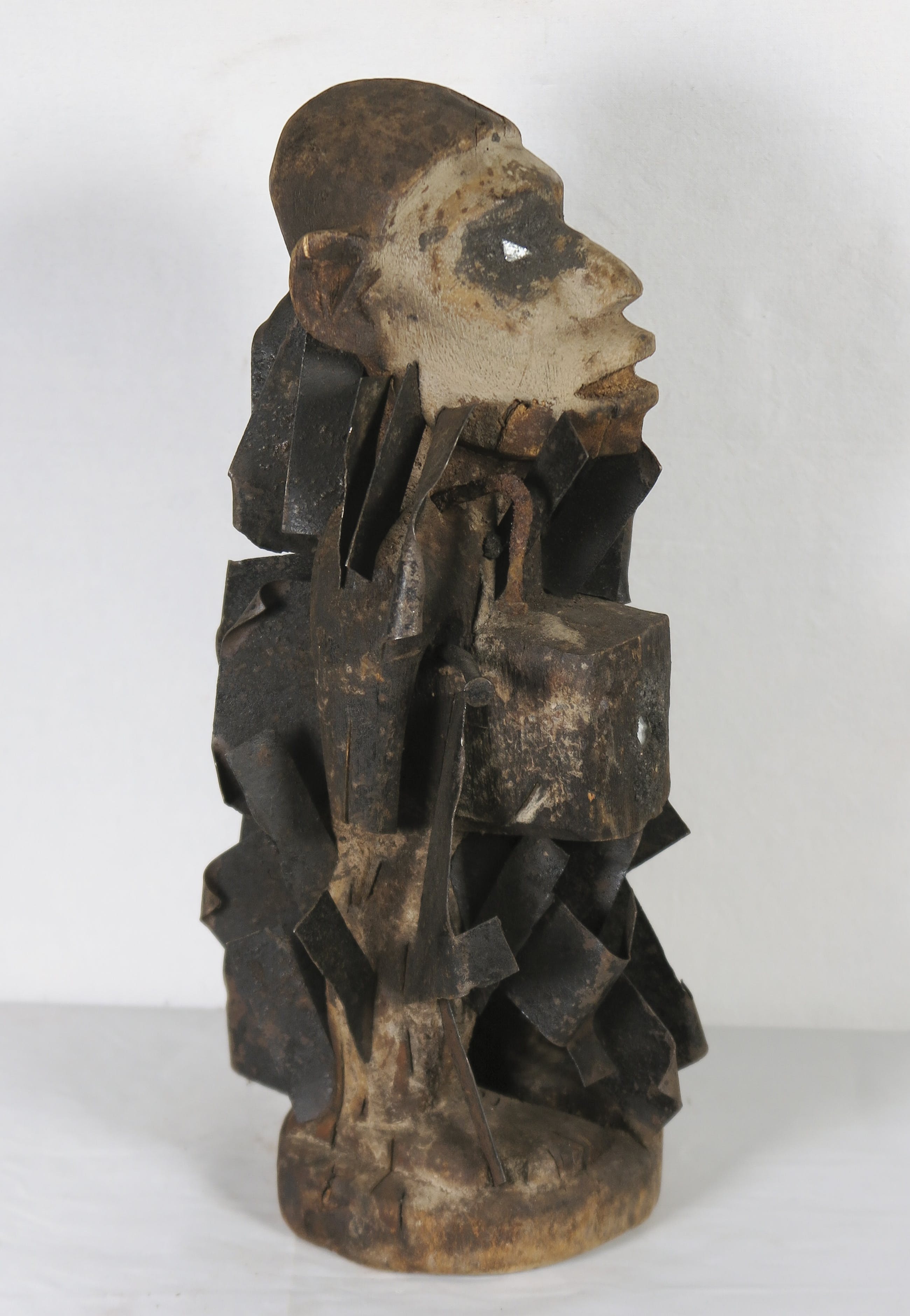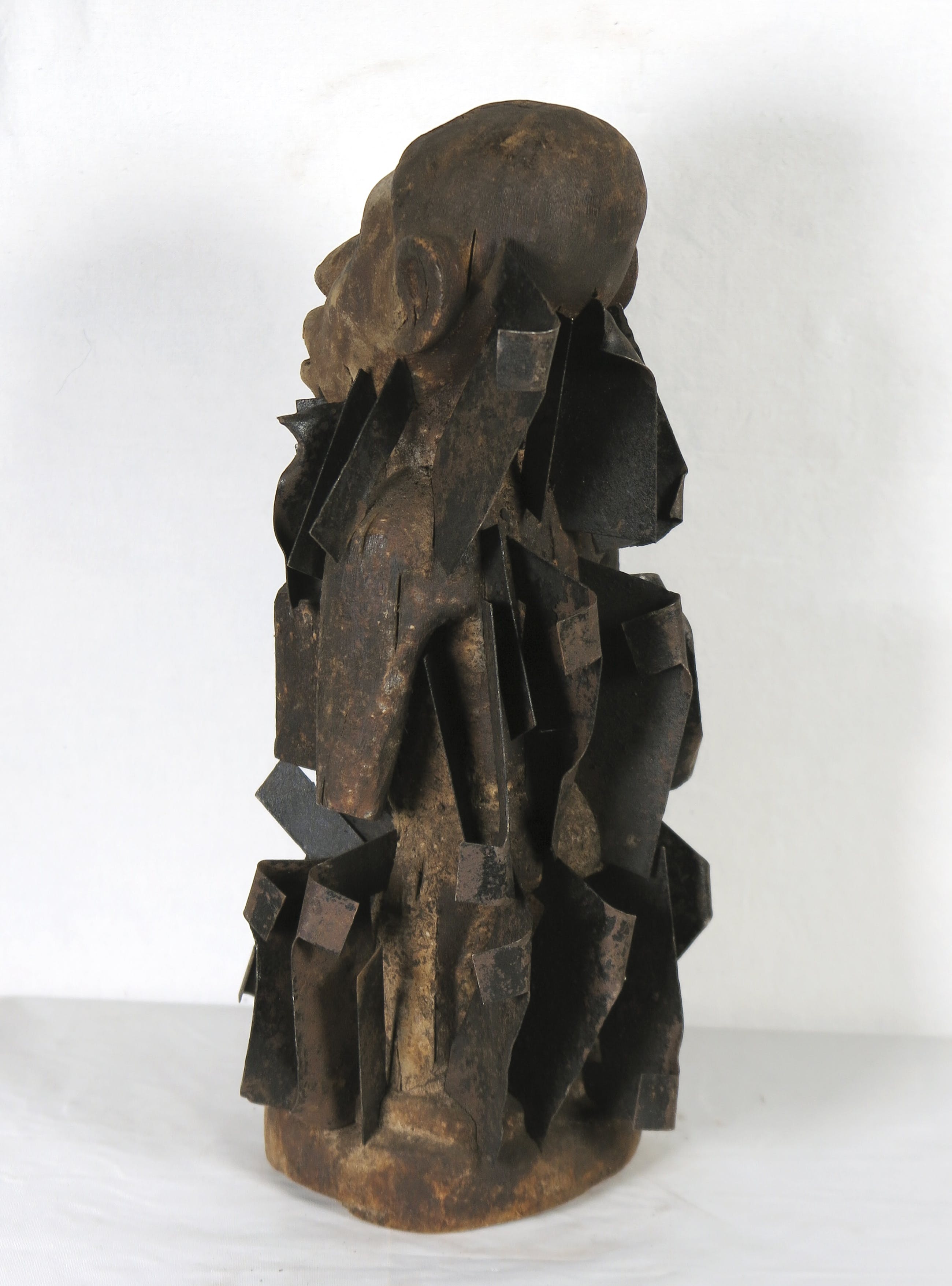 Krachtbeeld afkomstig van de Bakonga stam uit de Democratische Republiek Congo. Het beeld bestaat uit hout en metaal, en spiegelogen- en buik.