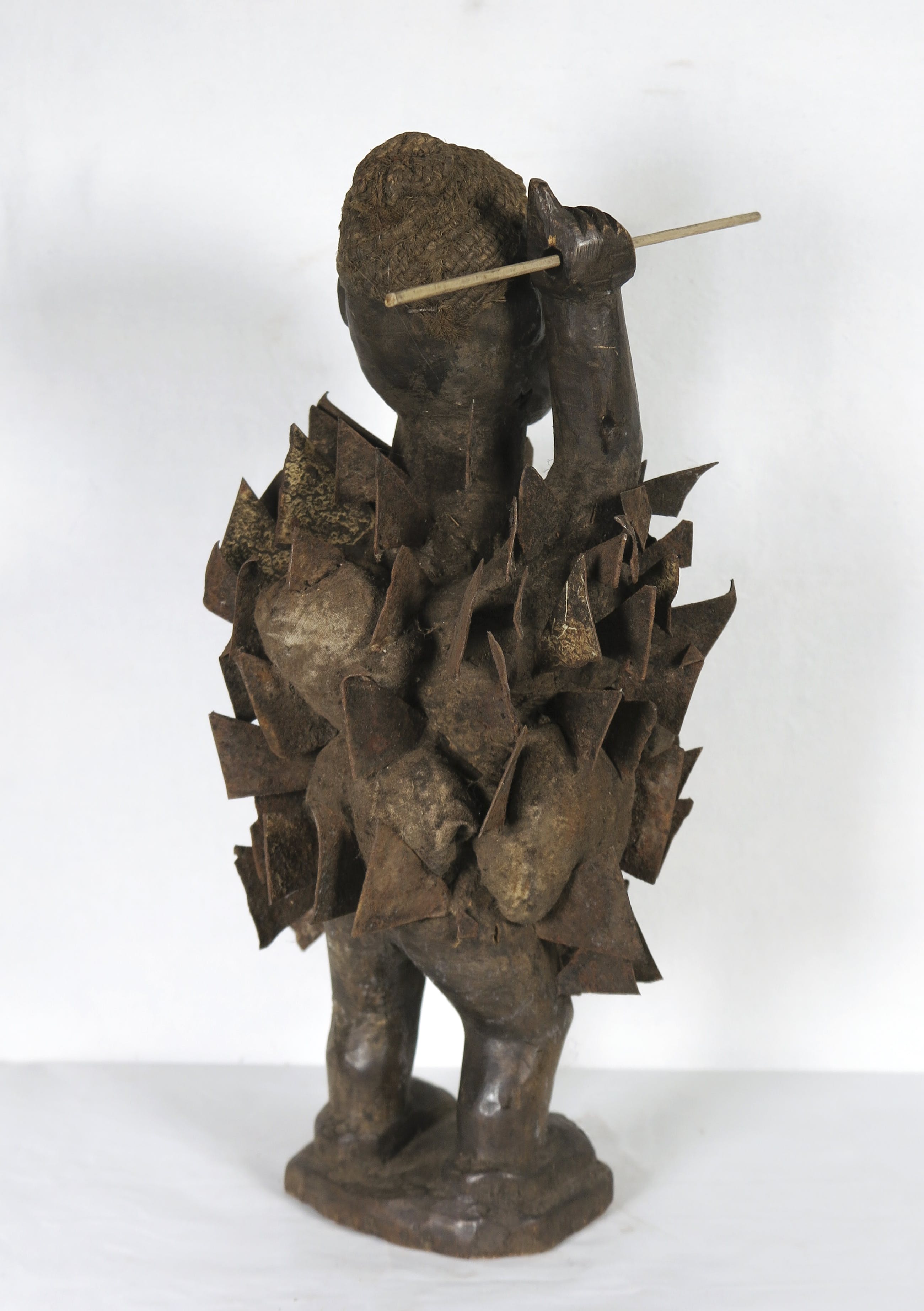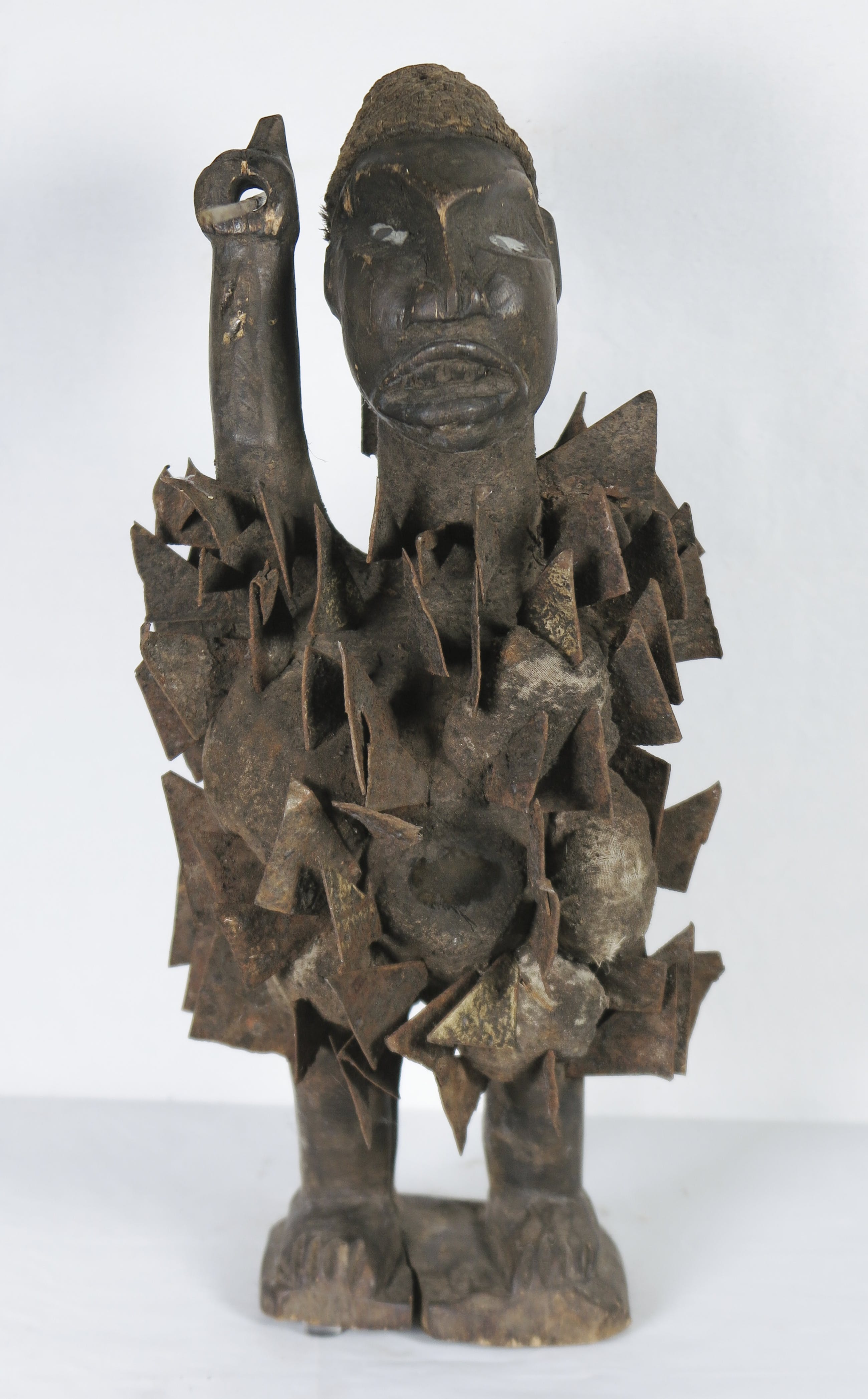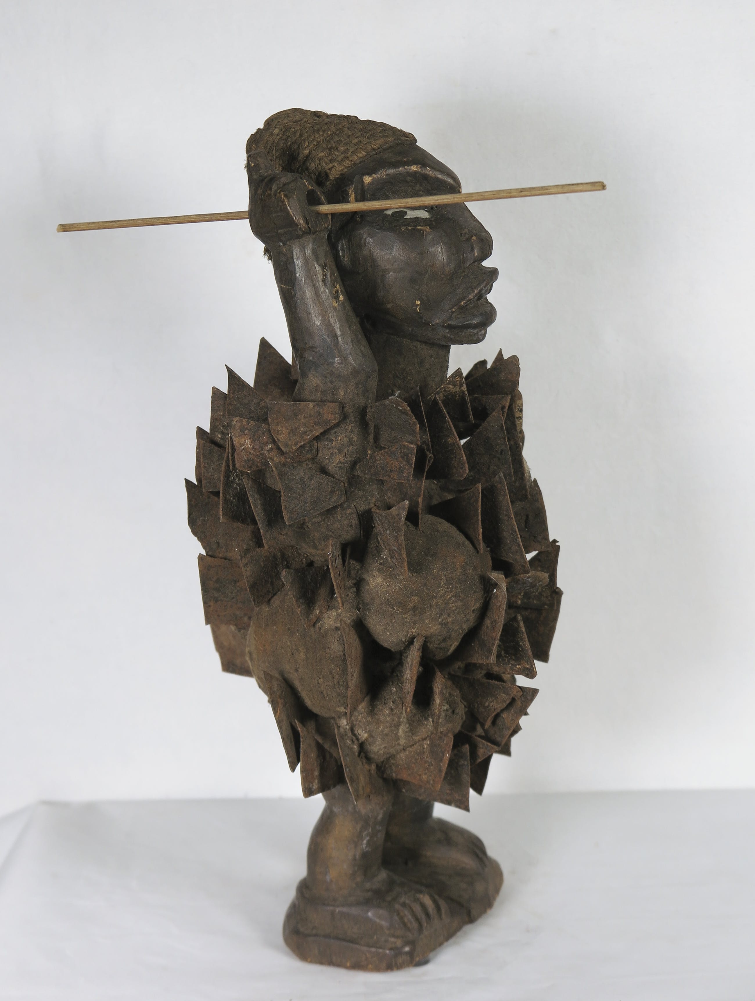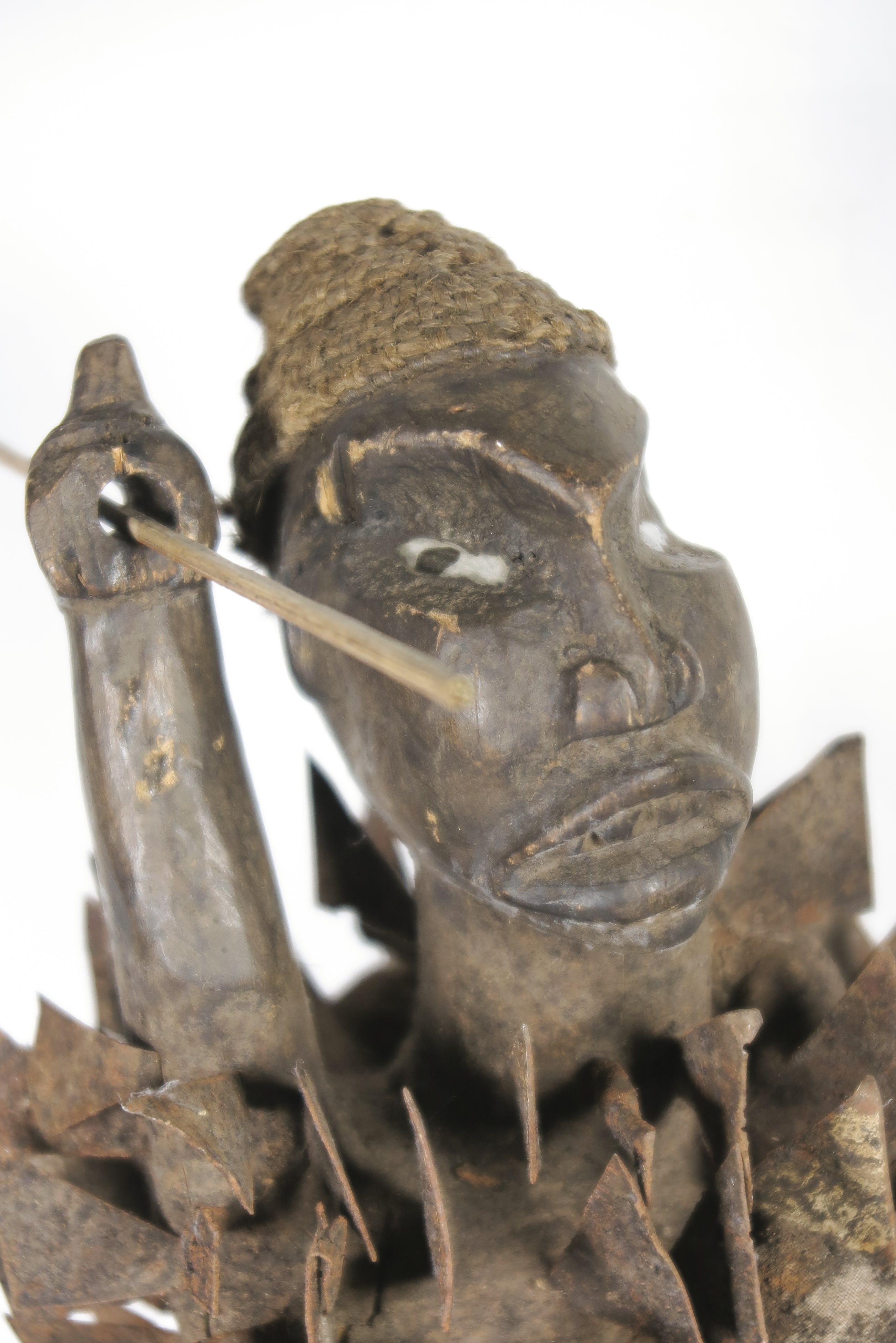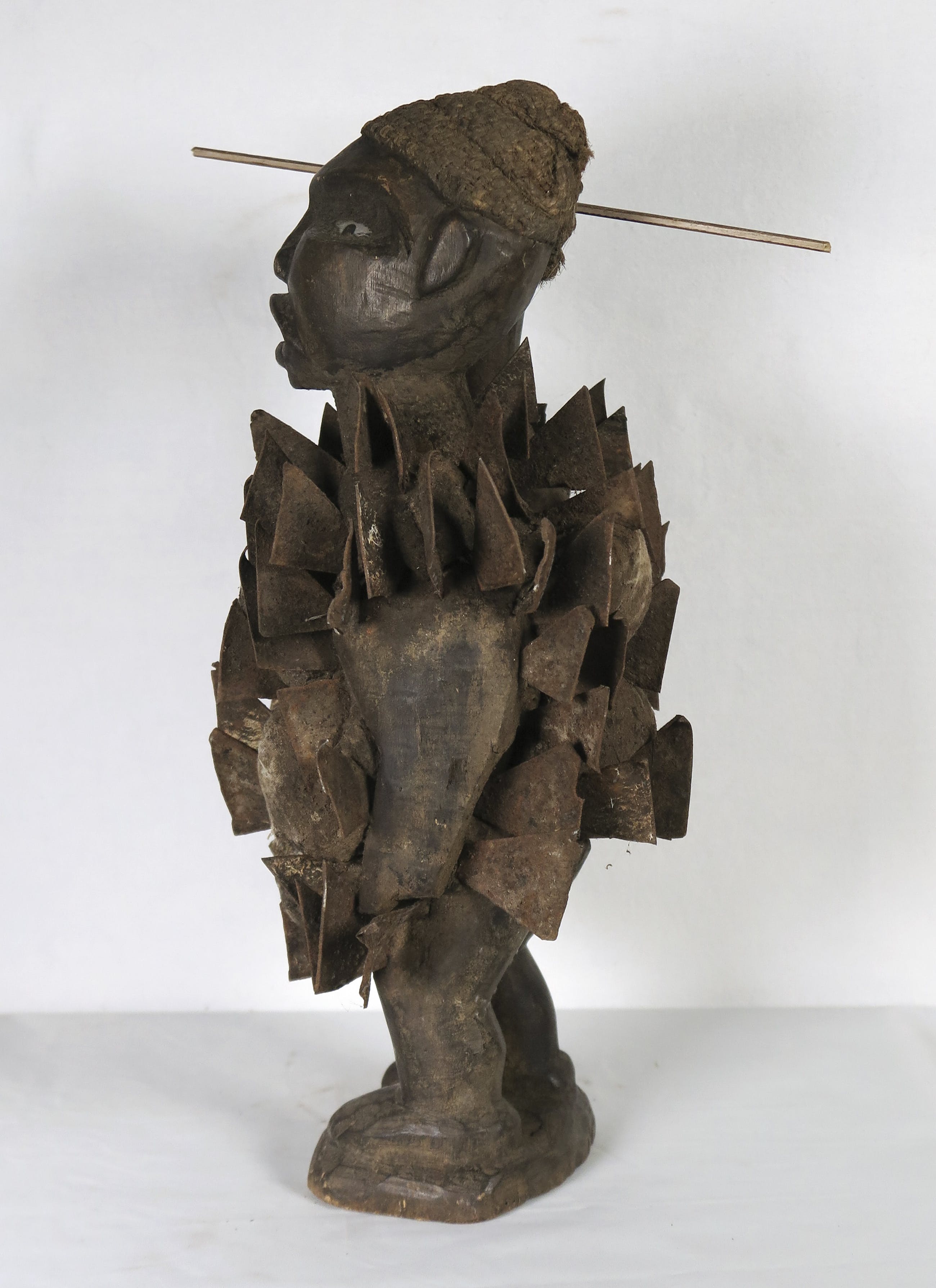 Krachtbeeld afkomstig van de Bakonga stam uit de Democratische Republiek Congo. Het beeld heeft een (losse) speer in de hand en bestaat uit hout en metaal, en spiegelogen- en buik.