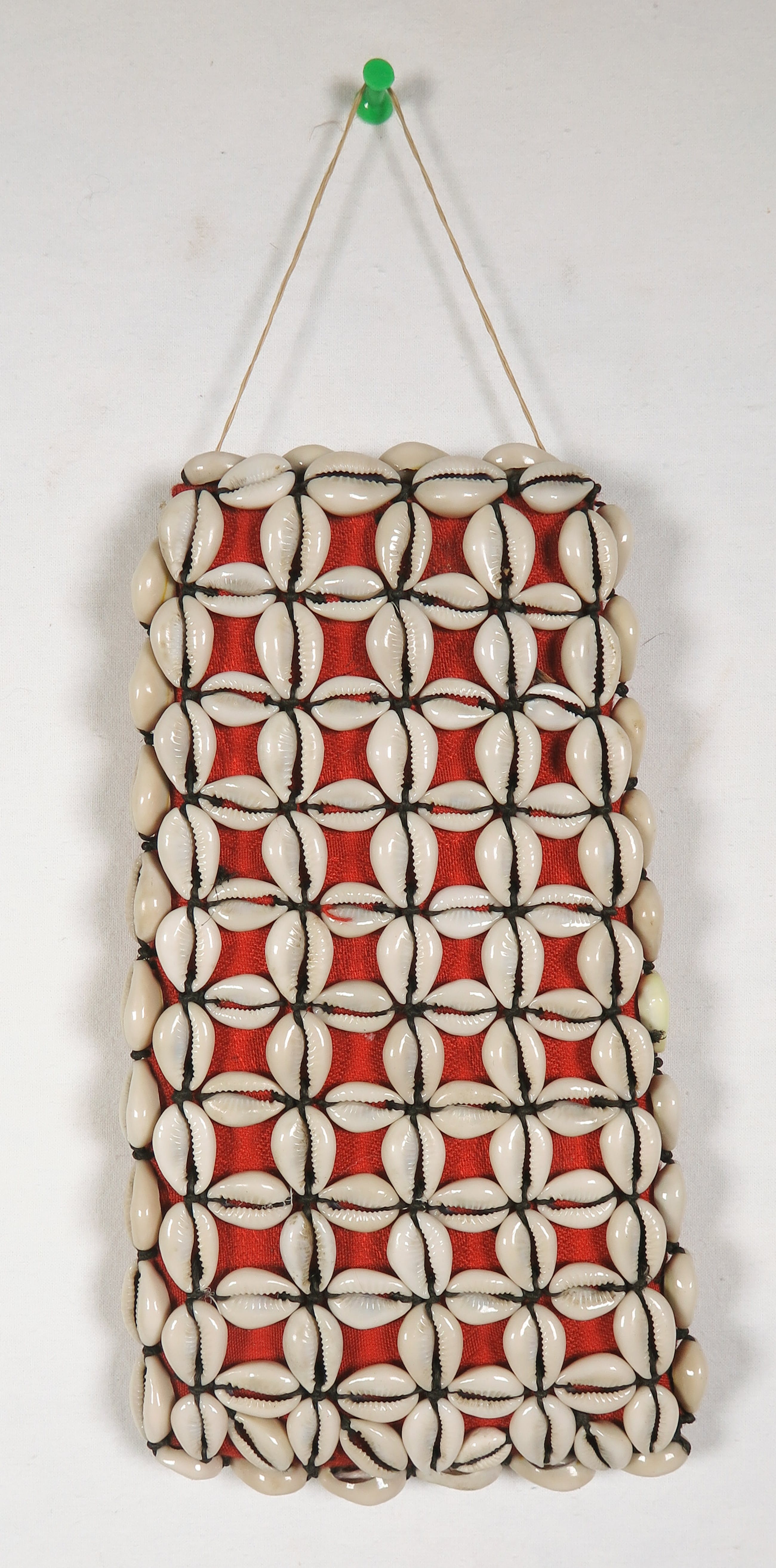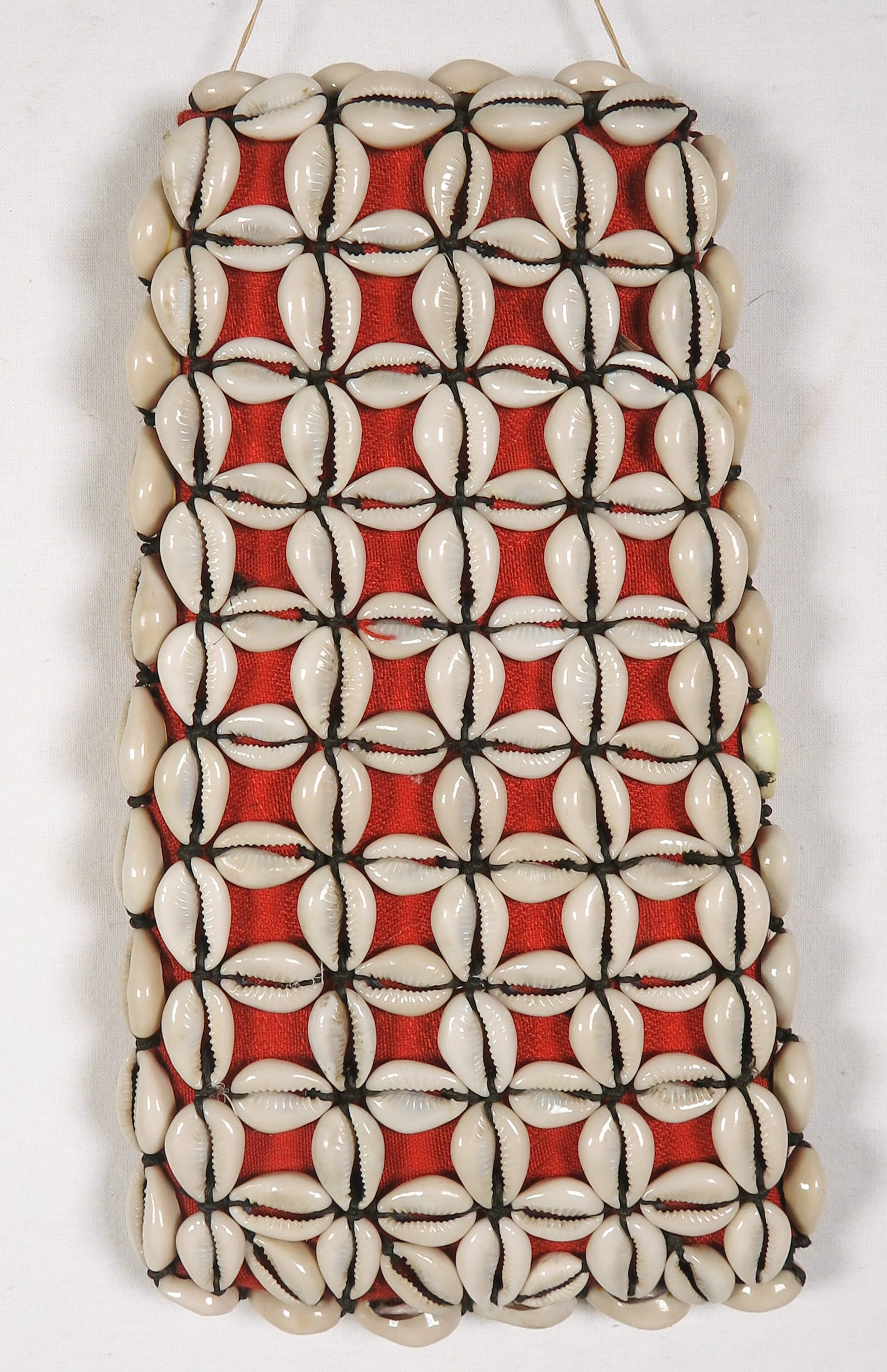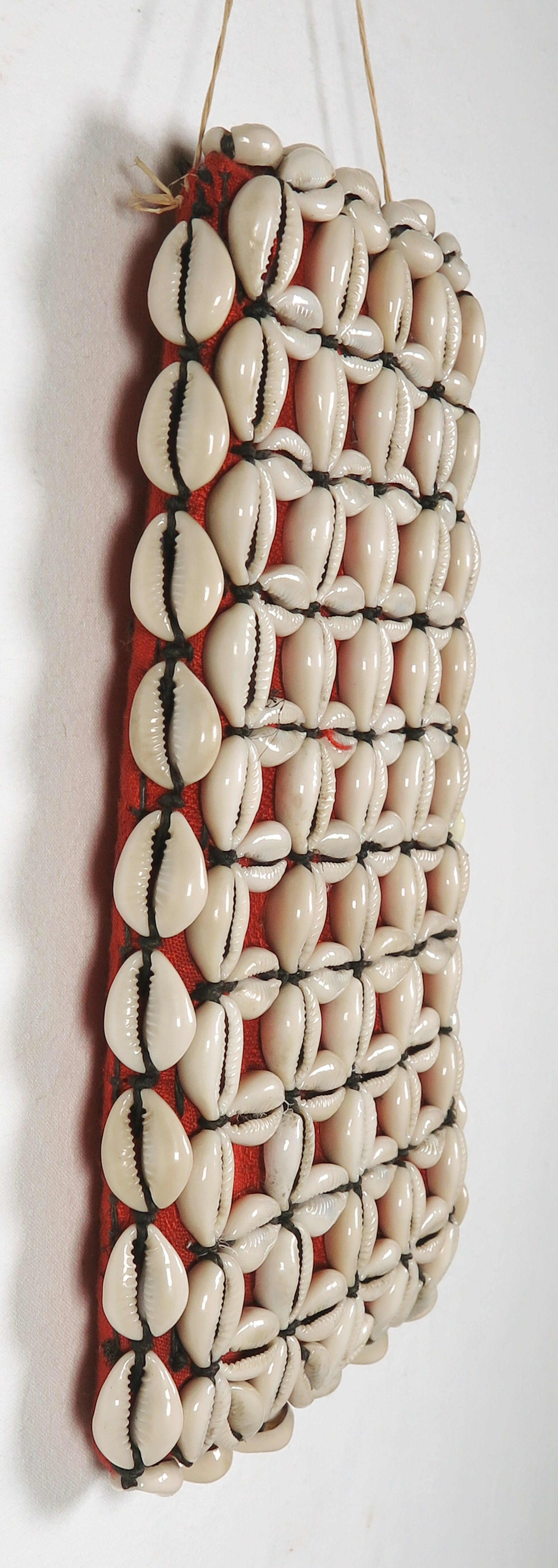 Vruchtbaarheidsamulet, bekleed met rode stof en kaurischelpen. Kaurischelpen staan symbool voor vrouwelijkheid.