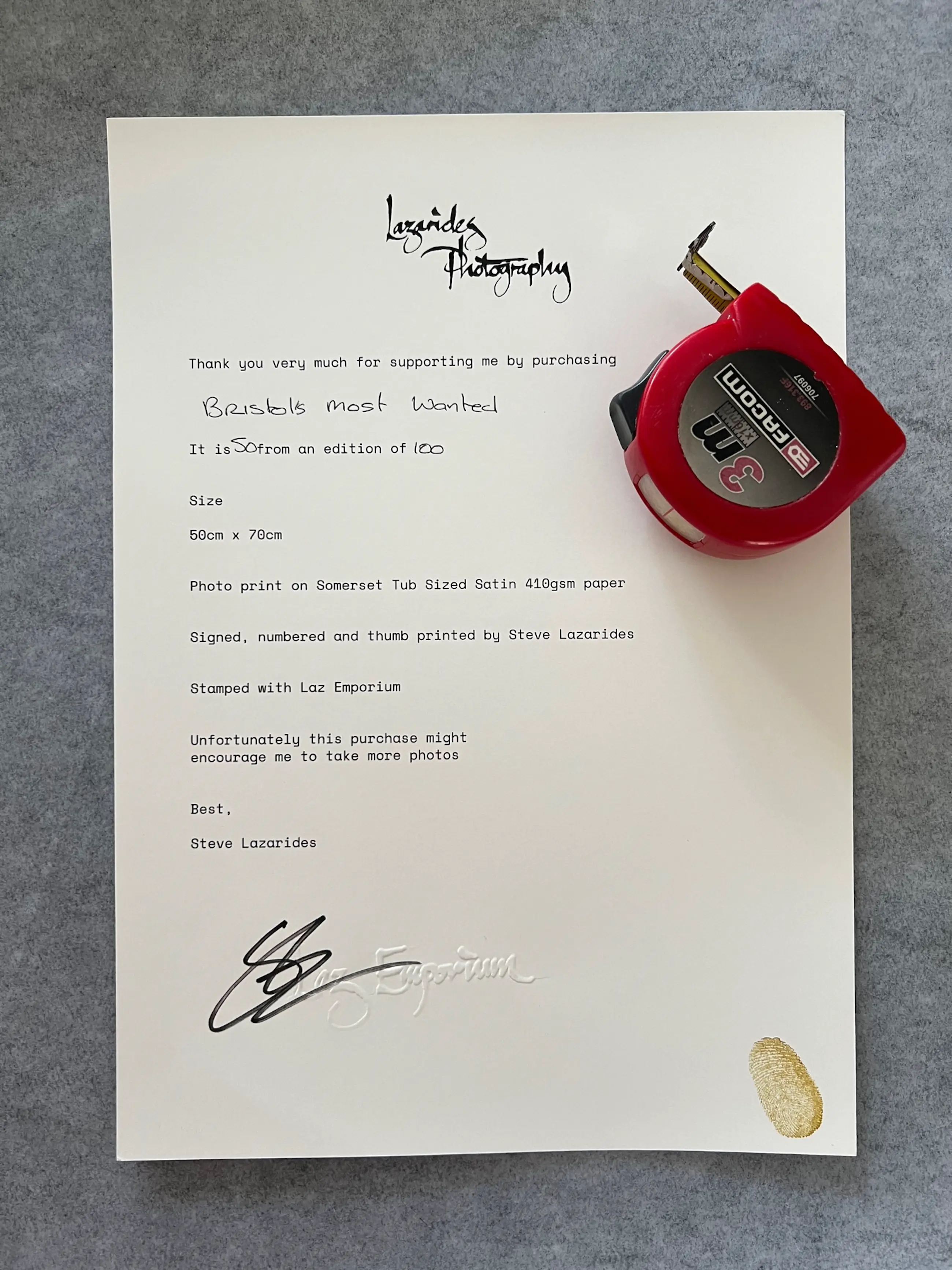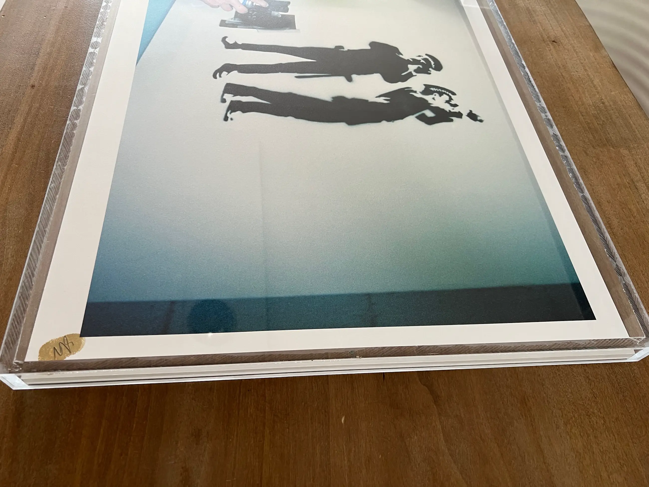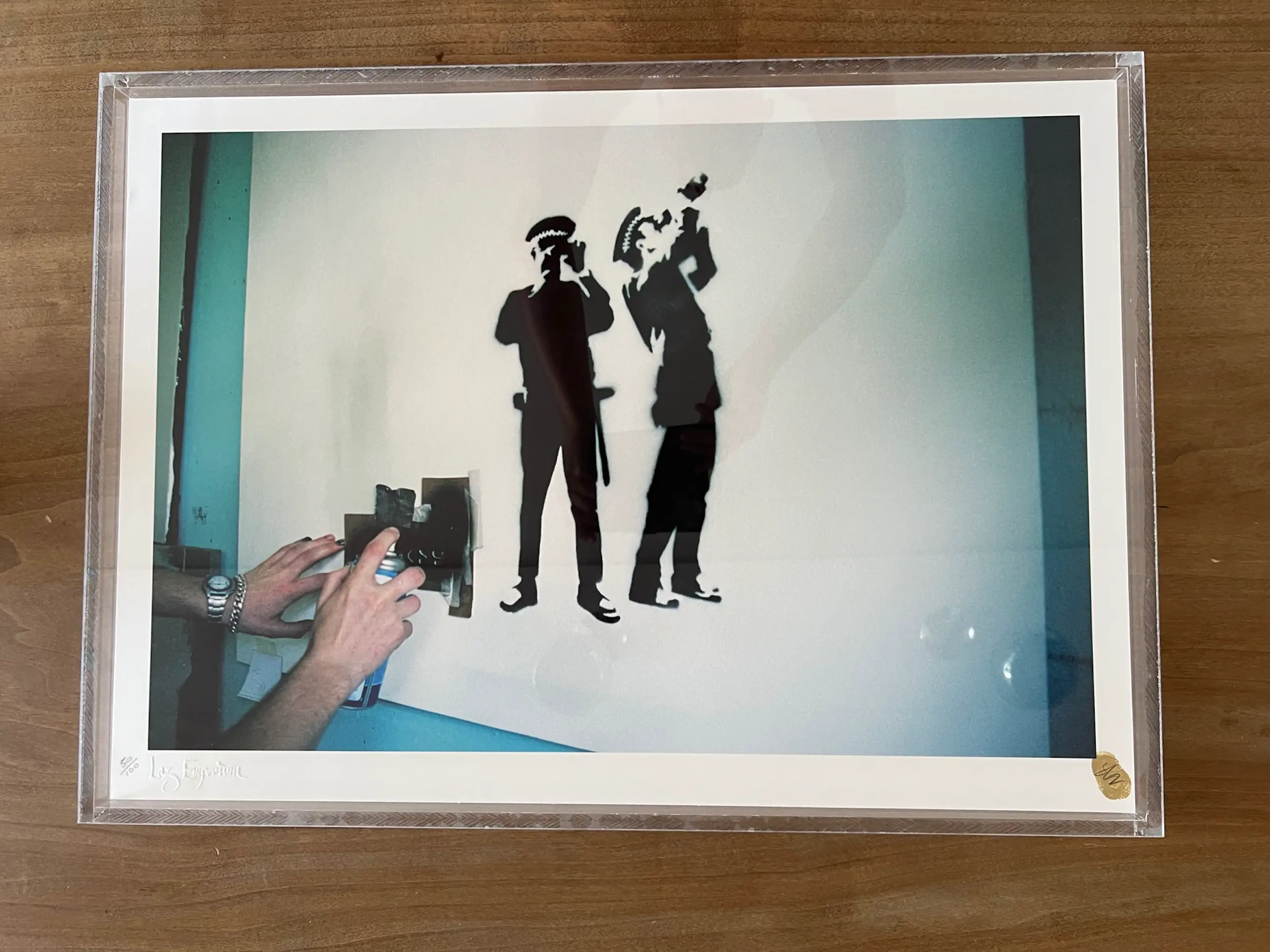 Op het aangeboden stuk is te zien hoe Banksy rond 2001 de laatste hand legde aan een versie van Avon en Somerset Constabulary in zijn studio in West-Londen. Deze genummerde versie 50/100 is uitgegeven door Lazarides en zowel de offset als het certificaat zijn voorzien van een diepdruk , handtekening Lazarides en de gouden vingerafdruk. De krasvrije plexibox kan opgehangen worden , ophangsysteem is voorzien.