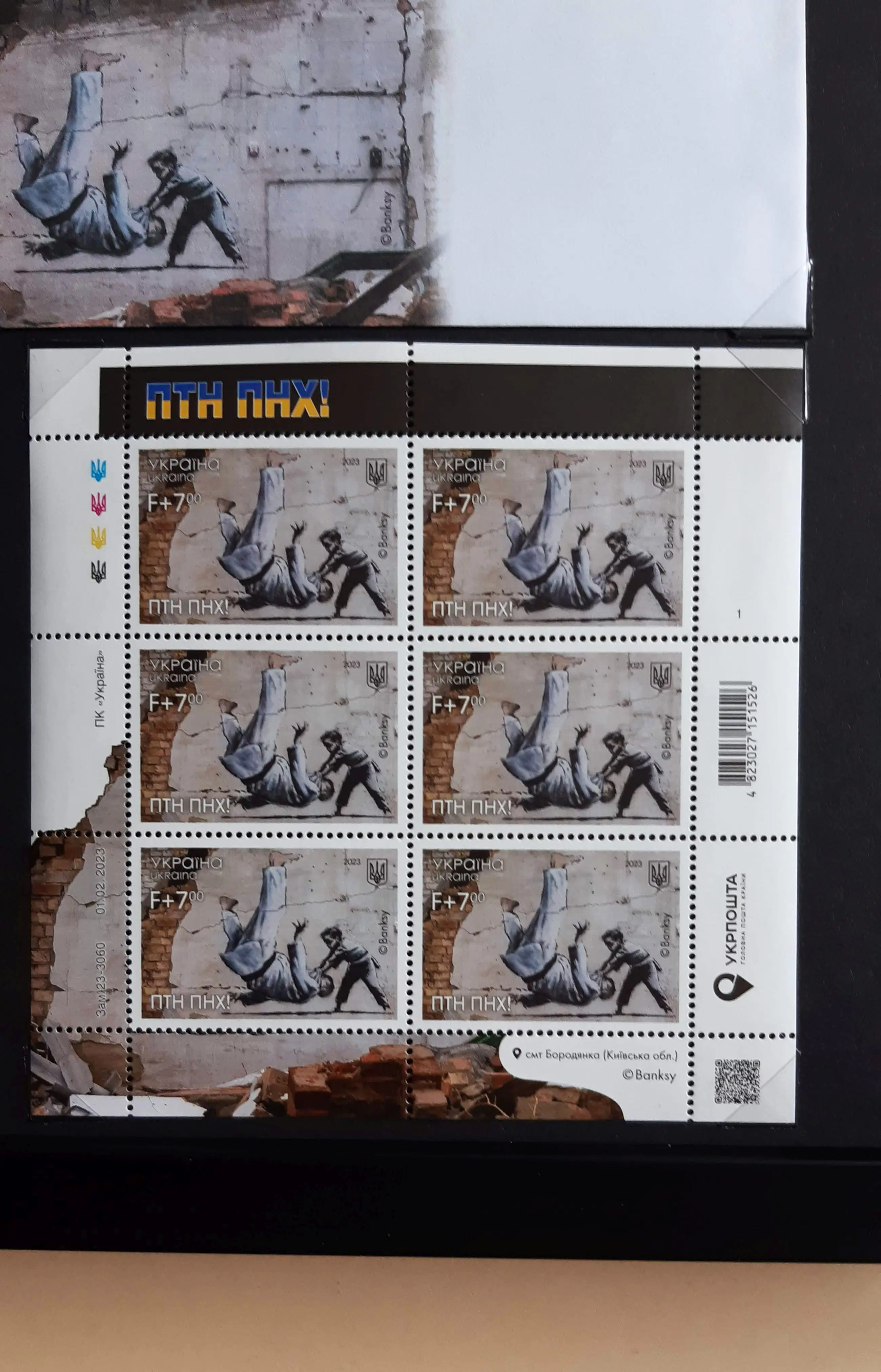 "FCK PTN (PTN PNKh)!" is de eerste postzegel ter wereld met graffiti van Banksy.