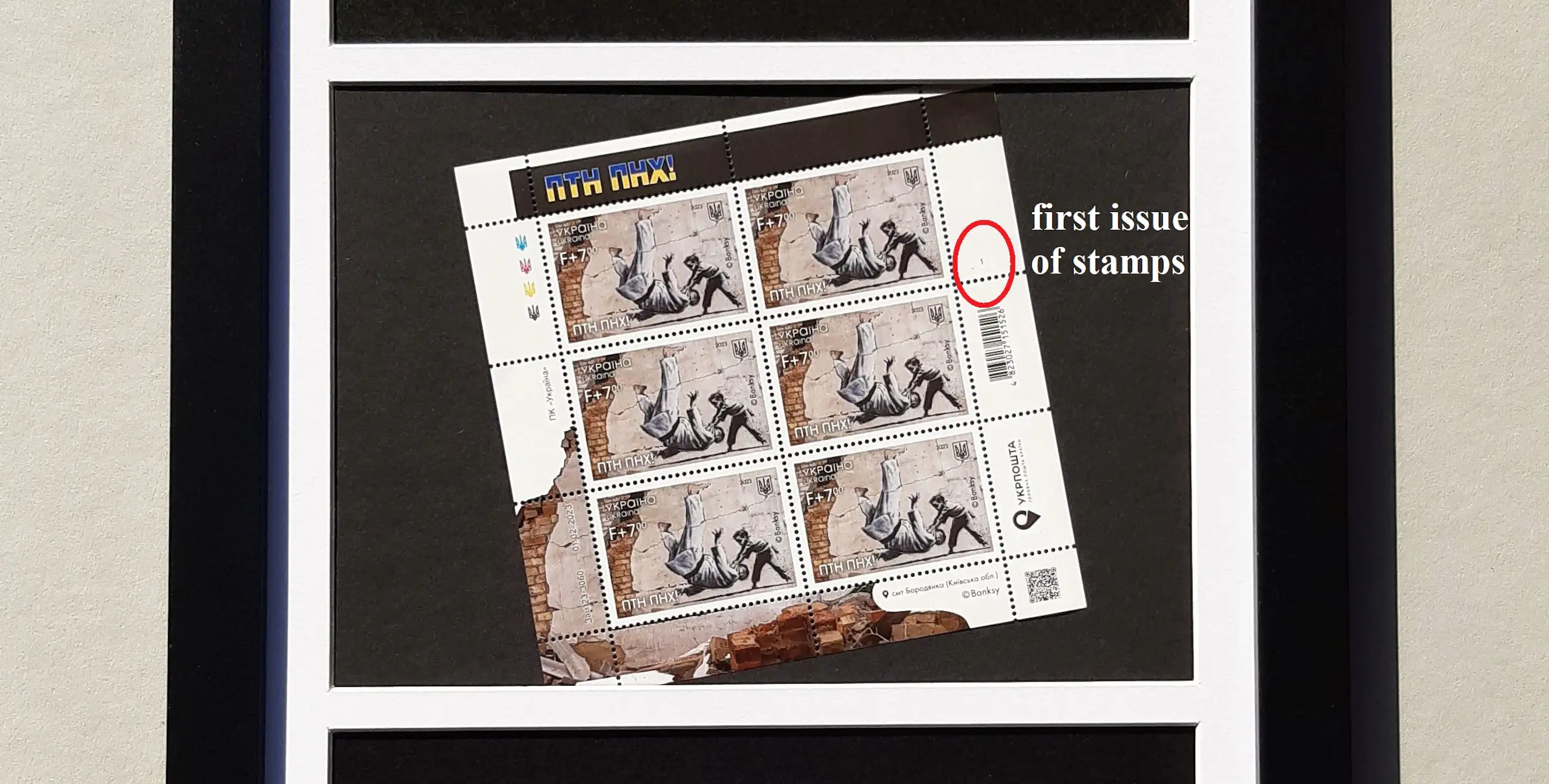 "FCK PTN (PTN PNKh)!" is de eerste postzegel ter wereld met graffiti van Banksy.