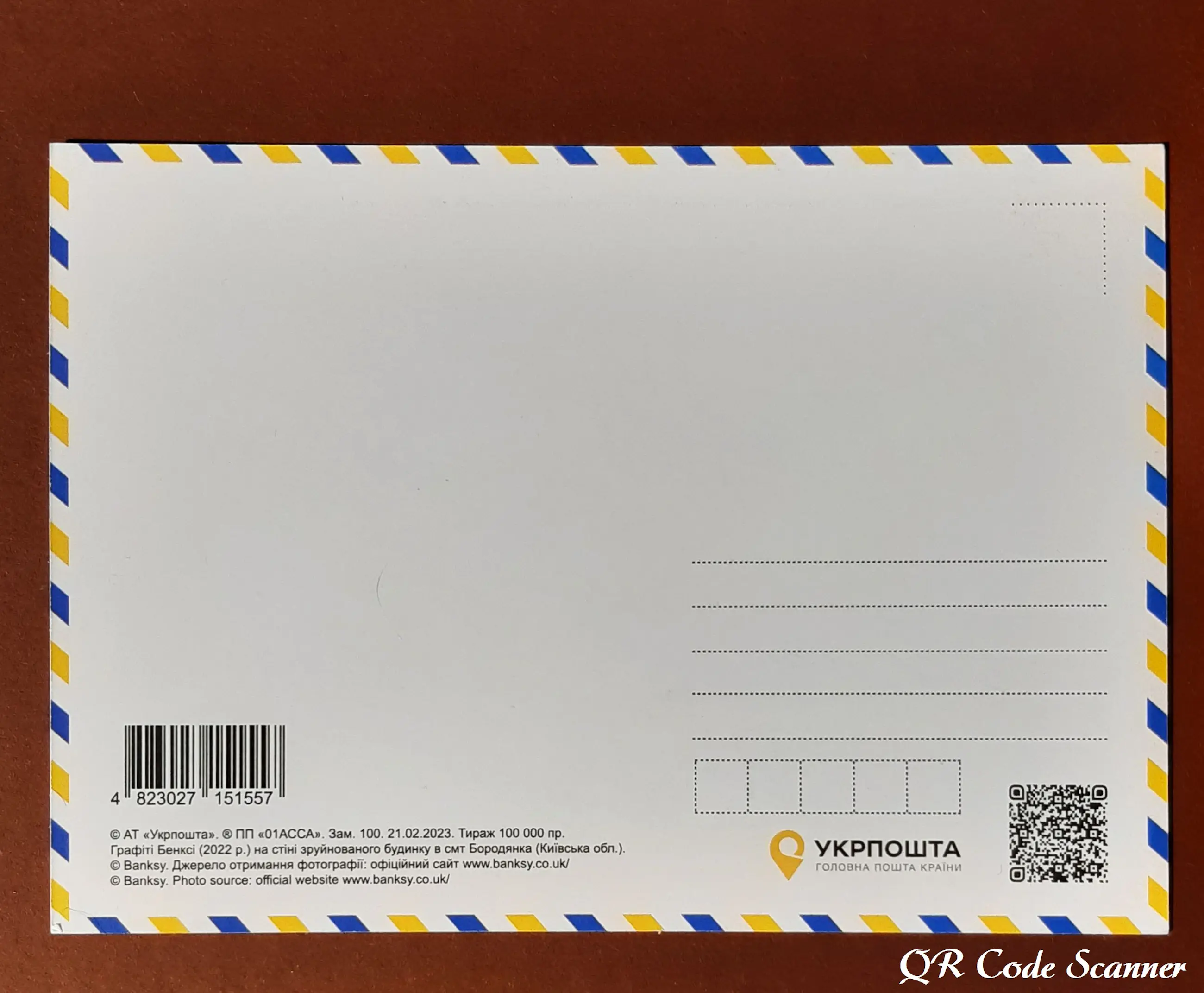 Copyright @Banksy op elke postzegel en op de achterkant van de ansichtkaart en envelop - bekijk de foto op Banksy's Instagram.